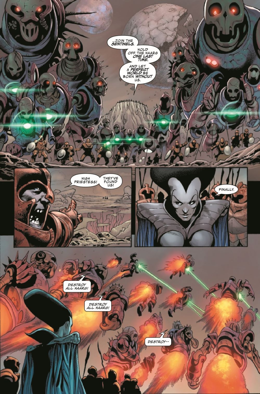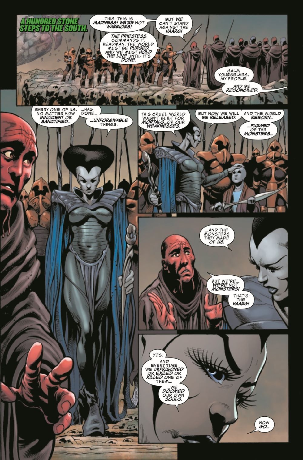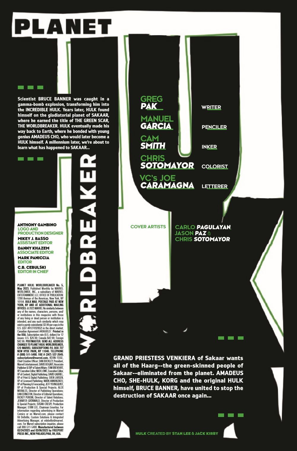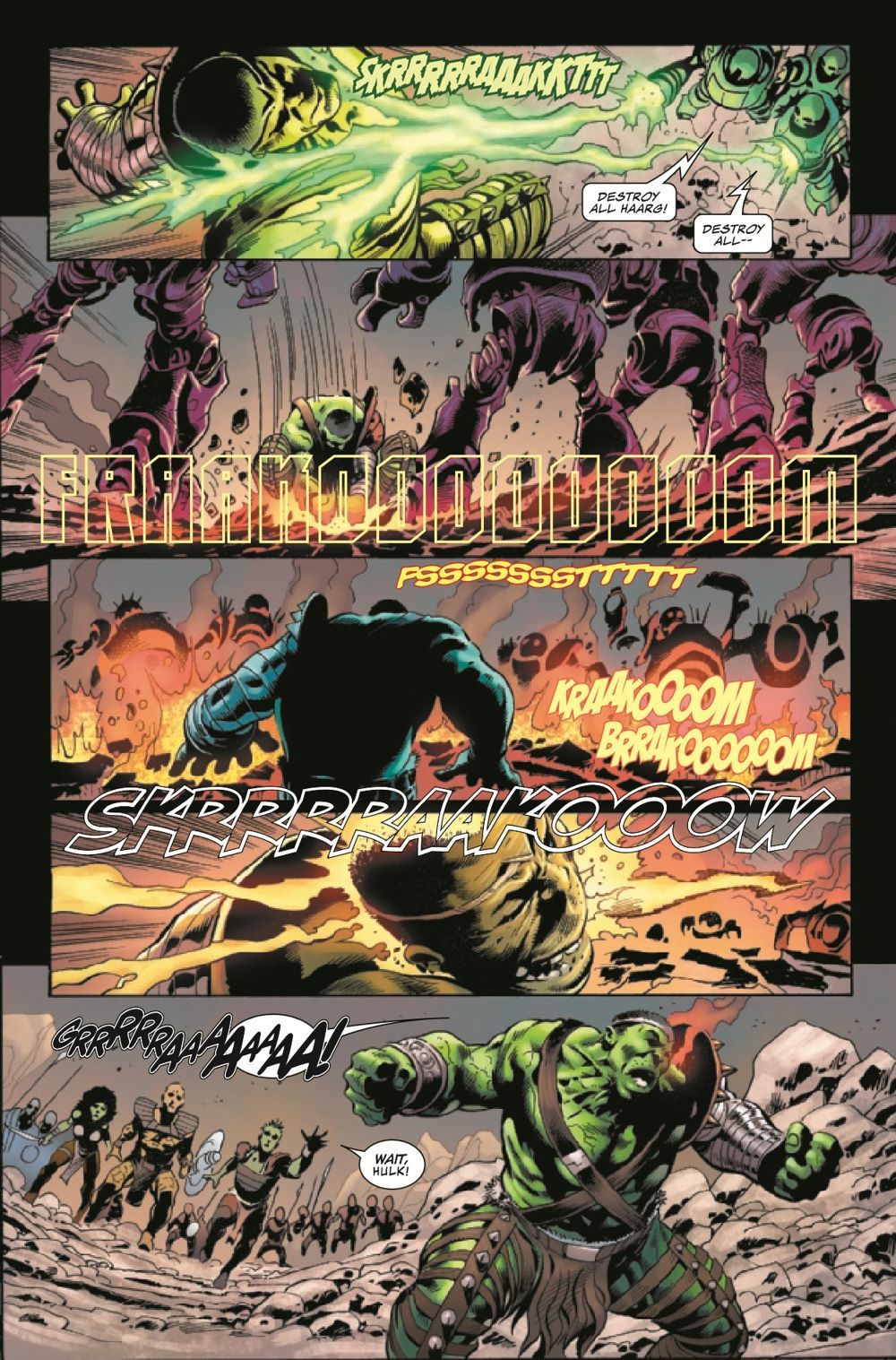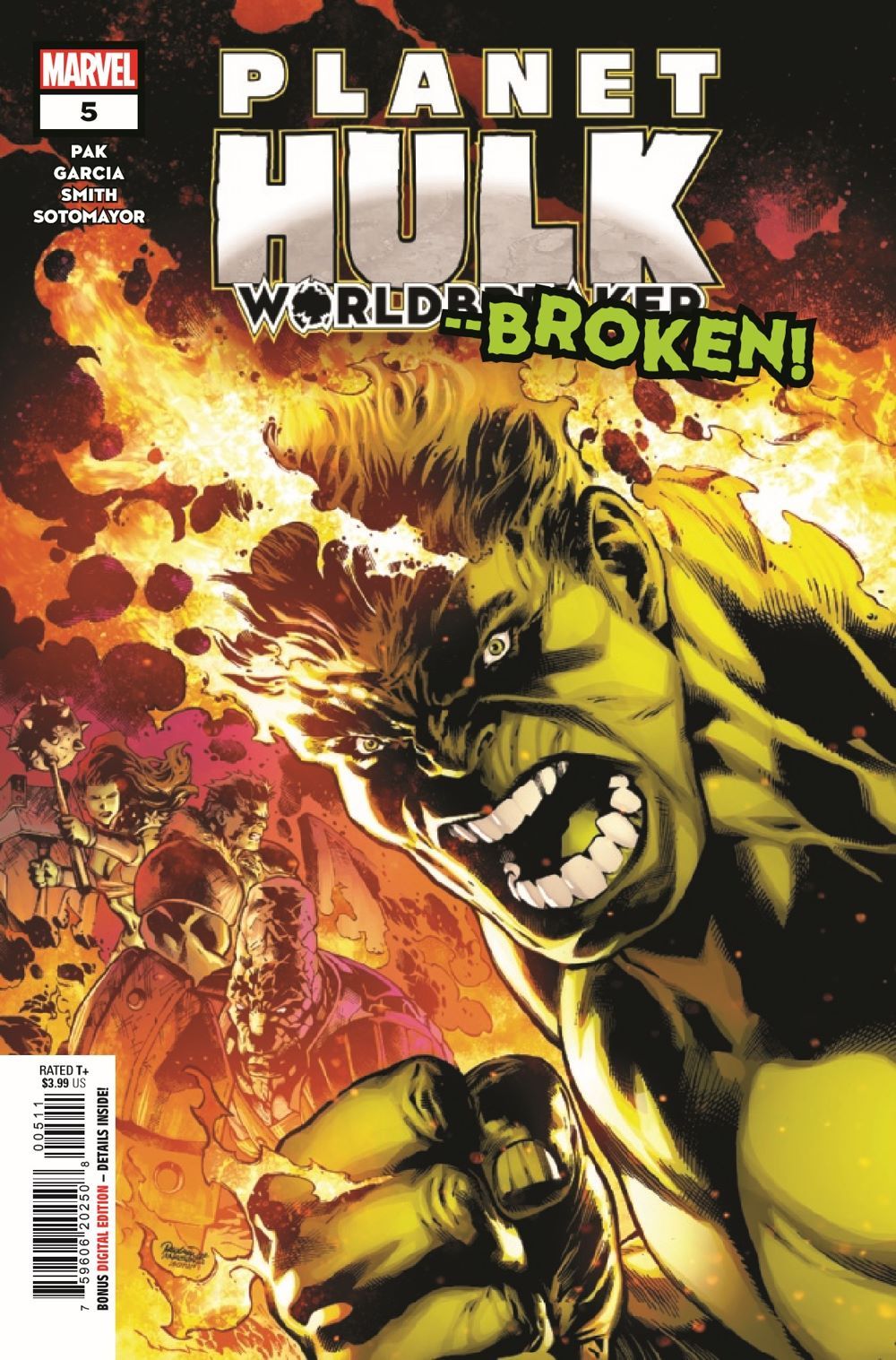 WORLD BROKEN! A thousand years in the future, green-skinned Haarg, like Tala and her brother Balo, are reviled and persecuted on Planet Sakaar. So when Balo was kidnapped by an evil priestess, Tala enlisted the help of her Grandpa Cho, the Jen, and Korg of Krona to break him free. But as the priestess reveals her true endgame, only the power of Banner, the Green Scar himself, can stop her. But is that just part of the priestess' plan? Our story of prophecy, damnation and redemption comes to a shattering conclusion!