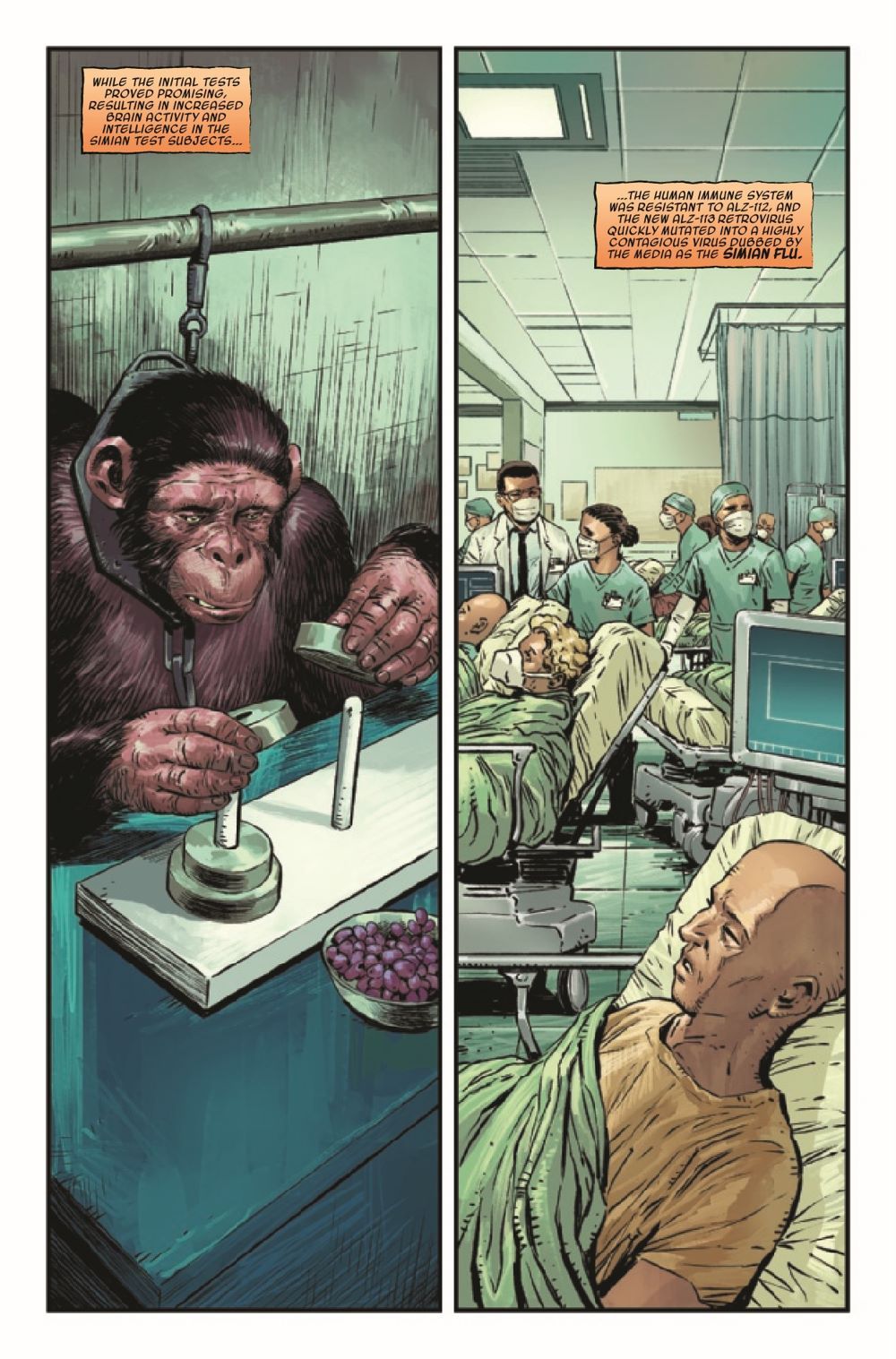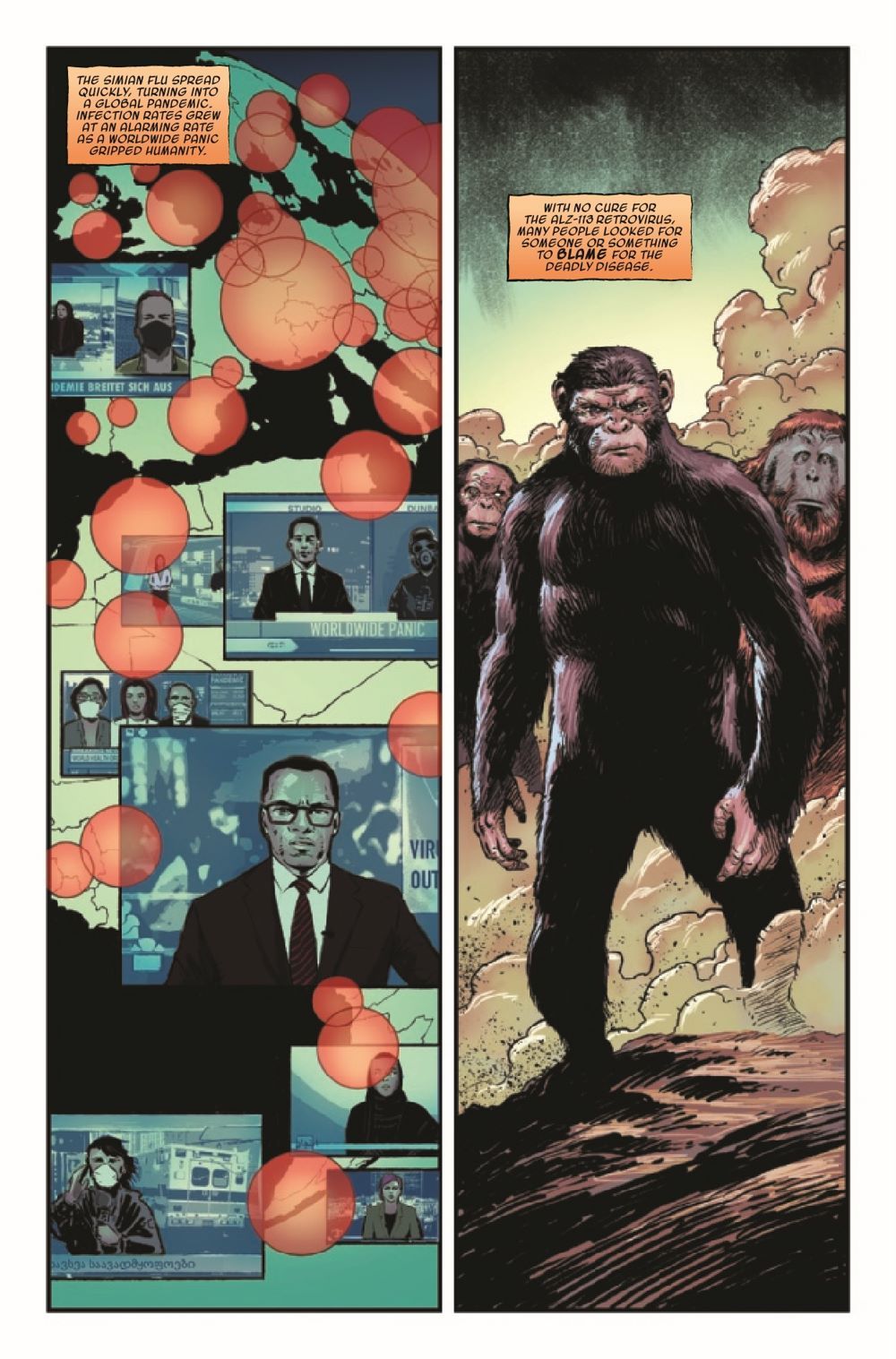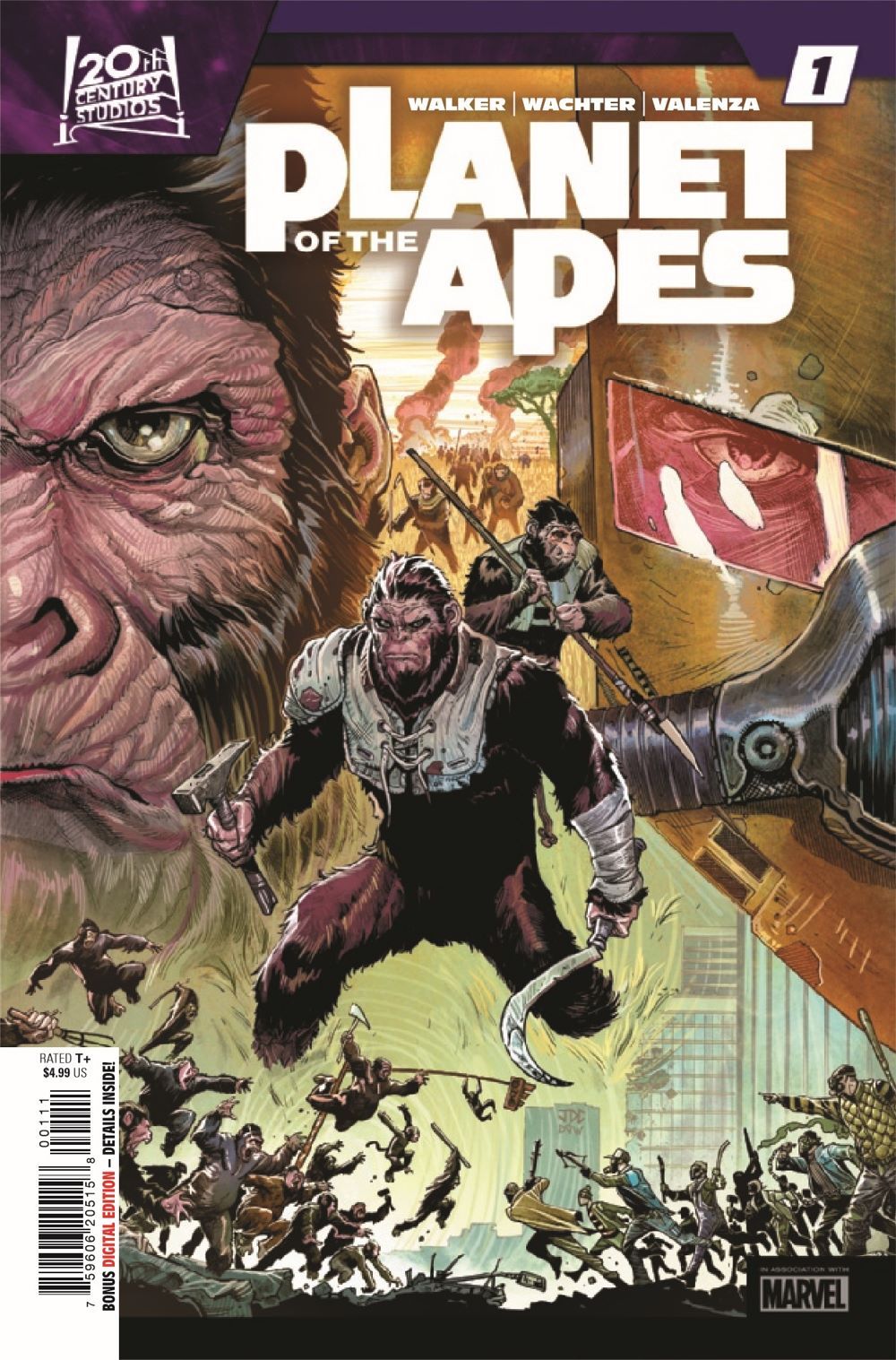 DAVID F. WALKER & DAVE WACHTER BRING PLANET OF THE APES BACK TO MARVEL COMICS IN SPECTACULAR STYLE! A new era of apes kicks off with part 1 of "Devolution"! The ALZ-113 virus has rampaged across planet Earth, and humanity is crumbling. While well-meaning researchers hunt for a cure, a fanatical group of humans has their own solution: Kill all apes. Peacekeeper Juliana Tobon is one of the few willing to stand against them, but the crisis is spreading, and soon apes will witness the true depths of human cruelty… Eisner-winning writer David F. Walker (Luke Cage, Bitter Root) joins forces with artist Dave Wachter (Iron Fist: Heart of the Dragon, Star Wars: The High Republic – Trail of Shadows) on one of the most beloved sci-fi franchises in history!