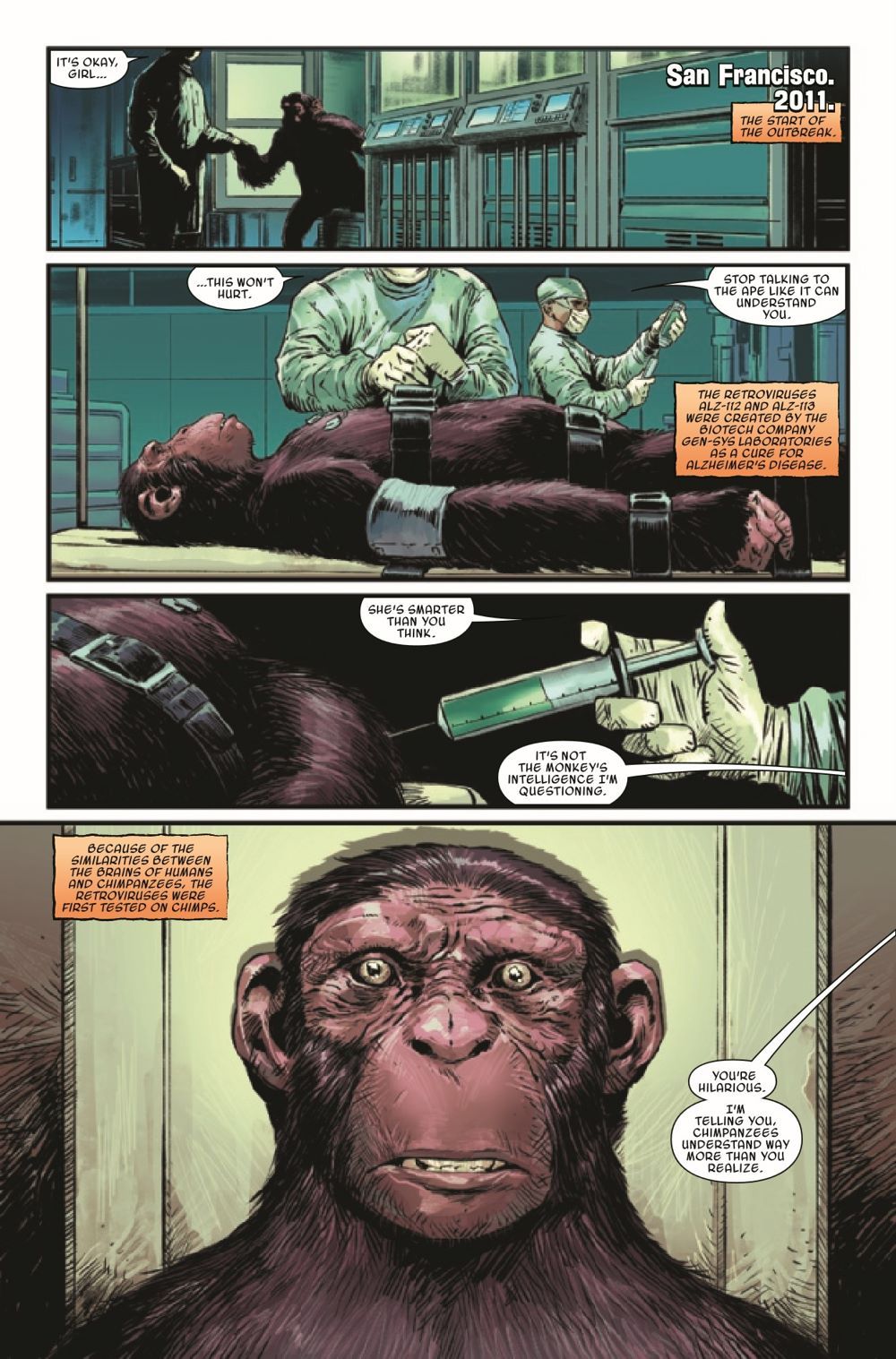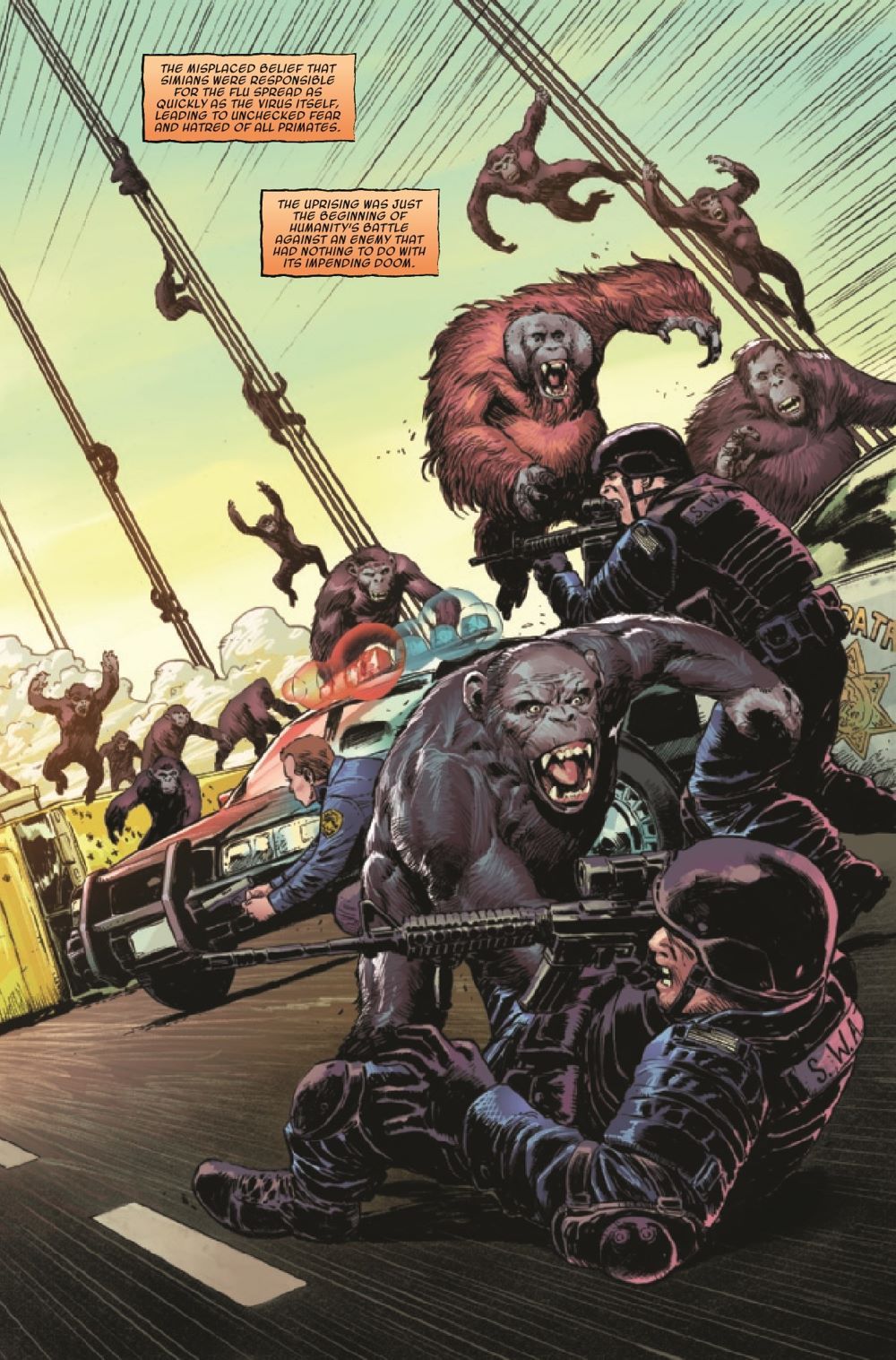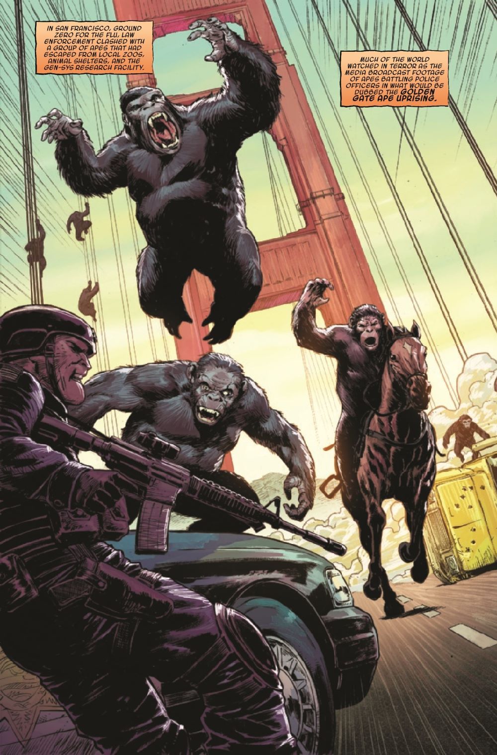 DAVID F. WALKER & DAVE WACHTER BRING PLANET OF THE APES BACK TO MARVEL COMICS IN SPECTACULAR STYLE! A new era of apes kicks off with part 1 of "Devolution"! The ALZ-113 virus has rampaged across planet Earth, and humanity is crumbling. While well-meaning researchers hunt for a cure, a fanatical group of humans has their own solution: Kill all apes. Peacekeeper Juliana Tobon is one of the few willing to stand against them, but the crisis is spreading, and soon apes will witness the true depths of human cruelty… Eisner-winning writer David F. Walker (Luke Cage, Bitter Root) joins forces with artist Dave Wachter (Iron Fist: Heart of the Dragon, Star Wars: The High Republic – Trail of Shadows) on one of the most beloved sci-fi franchises in history!