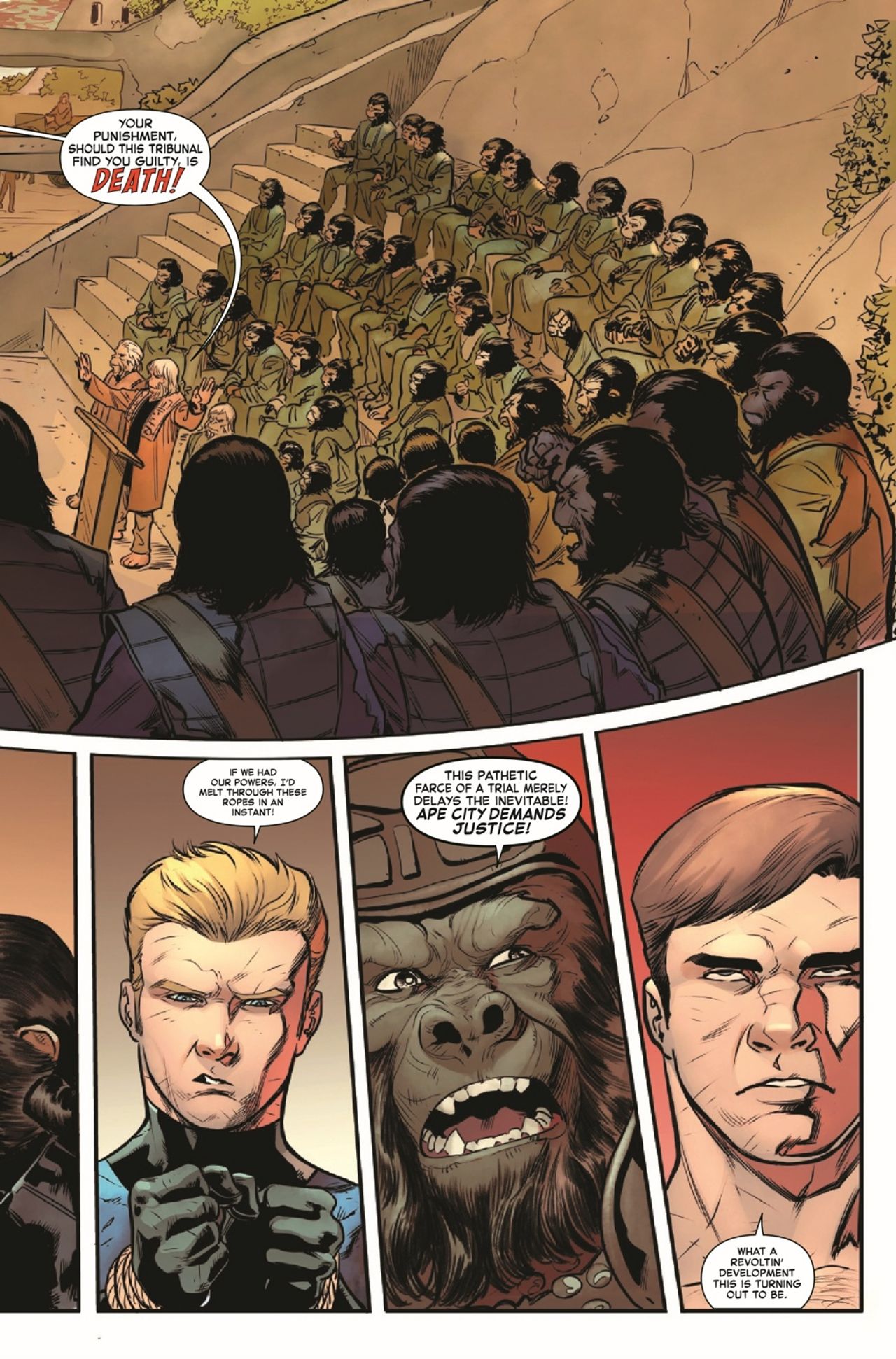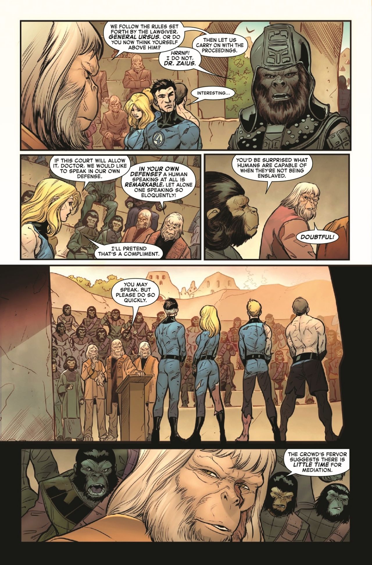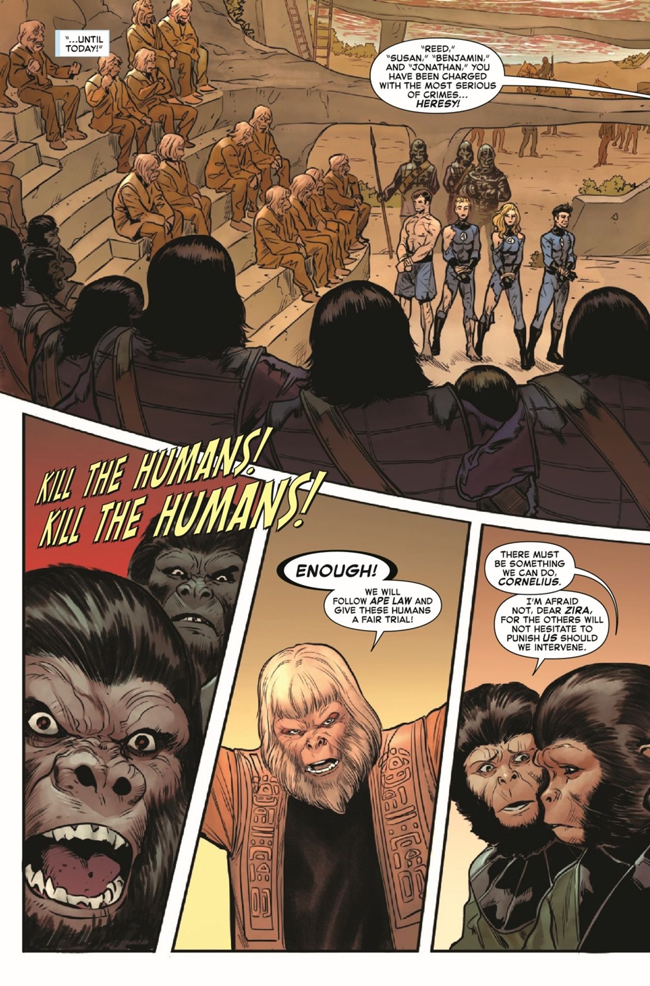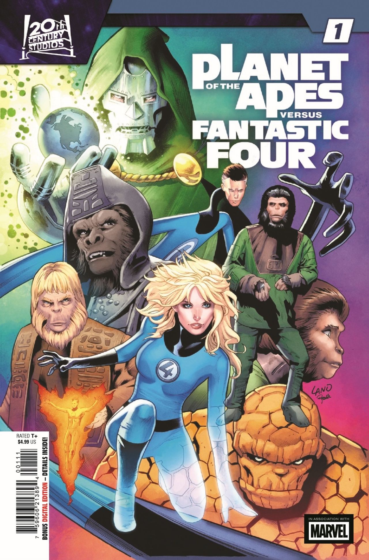 WORLDS COLLIDE! Marvel's First Family find themselves stranded on the Planet of the Apes! Witness history as the Fantastic Four cross paths for the very first time with Cornelius, Zira, Ursus - and of course Dr. Zaius! But they won't be going alone! Familiar foes from the Marvel Universe have set their sights on Ape City, setting the stage for a battle royale that fans won't soon forget!