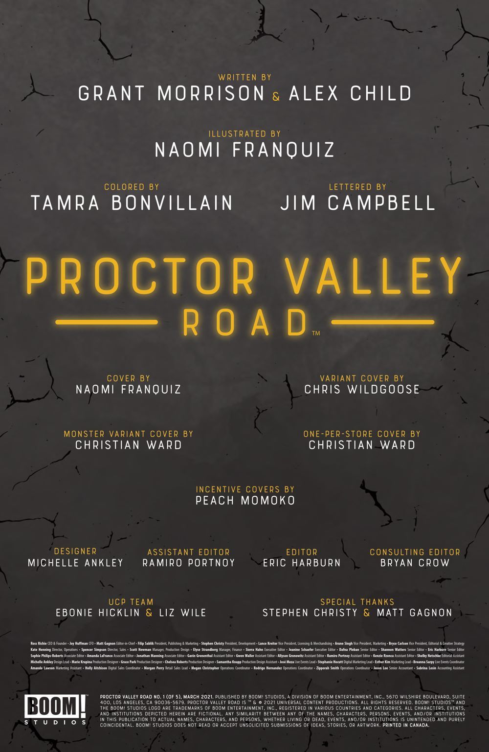 NEW SERIES. Perfect for fans of Paper Girls and Die, visionary writer Grant Morrison (Klaus), Alex Child (BBC's Holby City) and Naomi Franquiz (Tales from Harrow County) present a chilling new horror series about the mysterious monsters that haunt Proctor Valley Road - and the four misfit teenagers who must stop them.