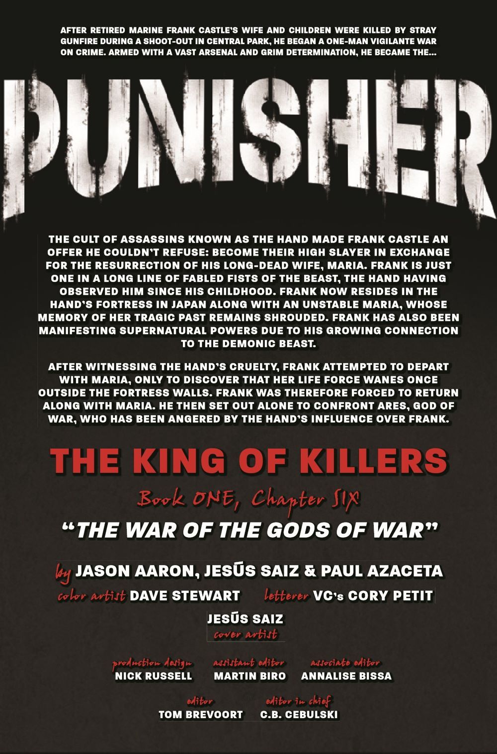 Frank Castle wants to end his war once and for all. But standing in his way is none other than the God of War himself, Ares, who sees the Punisher as his greatest disciple. A disciple who has forgotten his true self and must be reminded of the ways of war.