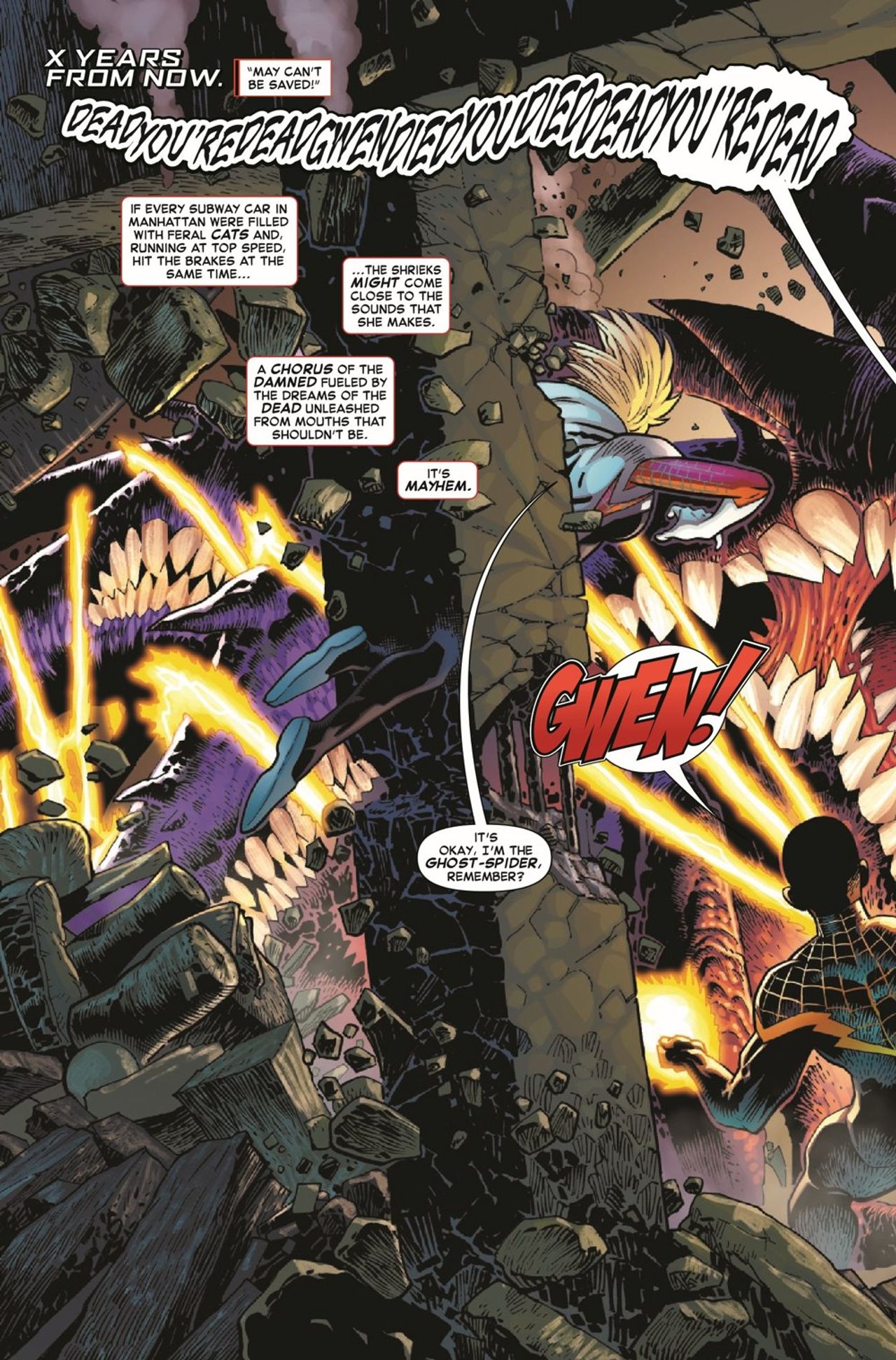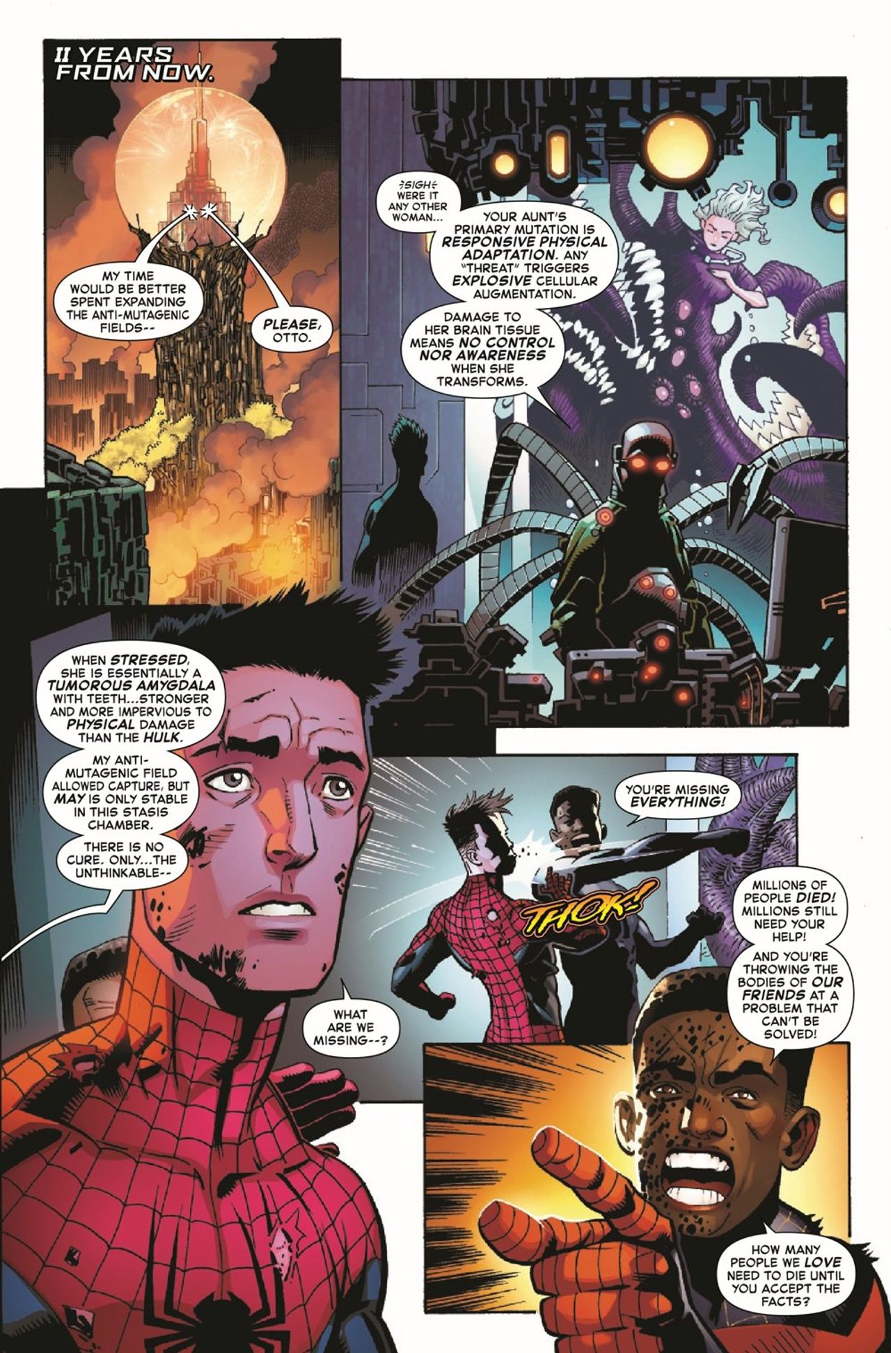 SPIDER-MAN VERSUS…SPIN! X YEARS LATER, when push comes to X-Gene-infected, monster-riddled, postapocalyptic wasteland, who does a RADIOACTIVE Spider-Man have a greater responsibility toward, the people of NYC or the people he loves most in the world?! EX-Spider-Man, Miles Morales and Ghost-Spider know the answer - and they'll go THROUGH Peter Parker to do the right thing!