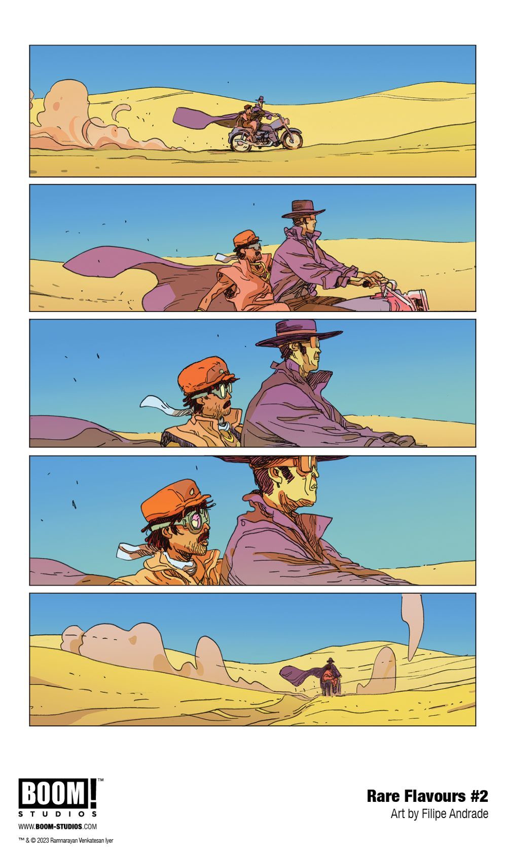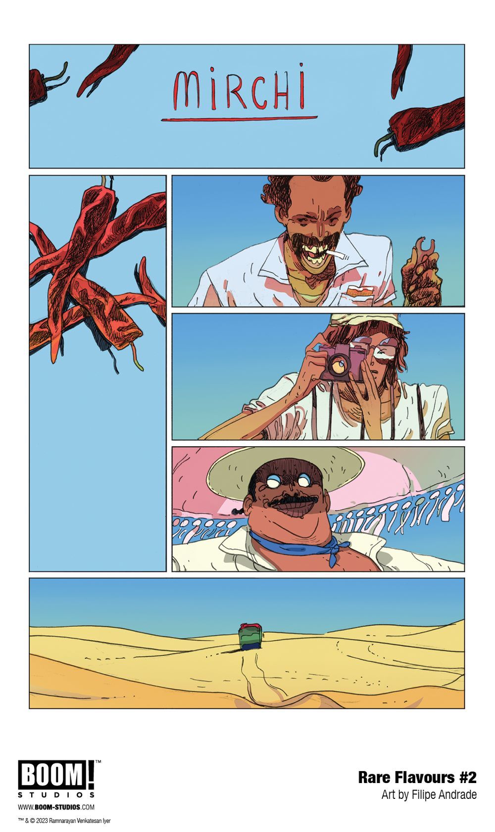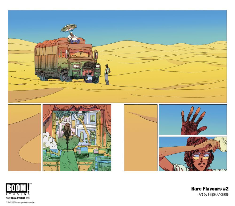 The next masterpiece from Ram V and Filipe Andrade (The Many Deaths of Laila Starr) continues as Rubin and Mo journey deep into the scorching Rajasthan desert in search of a mythical pepper, but supernatural detectives Dilshan & Dilkush are hot on their trail! Meanwhile, their driver, Manish, takes them on a historical journey concerning those who ferry the peppers through the fiery landscape.