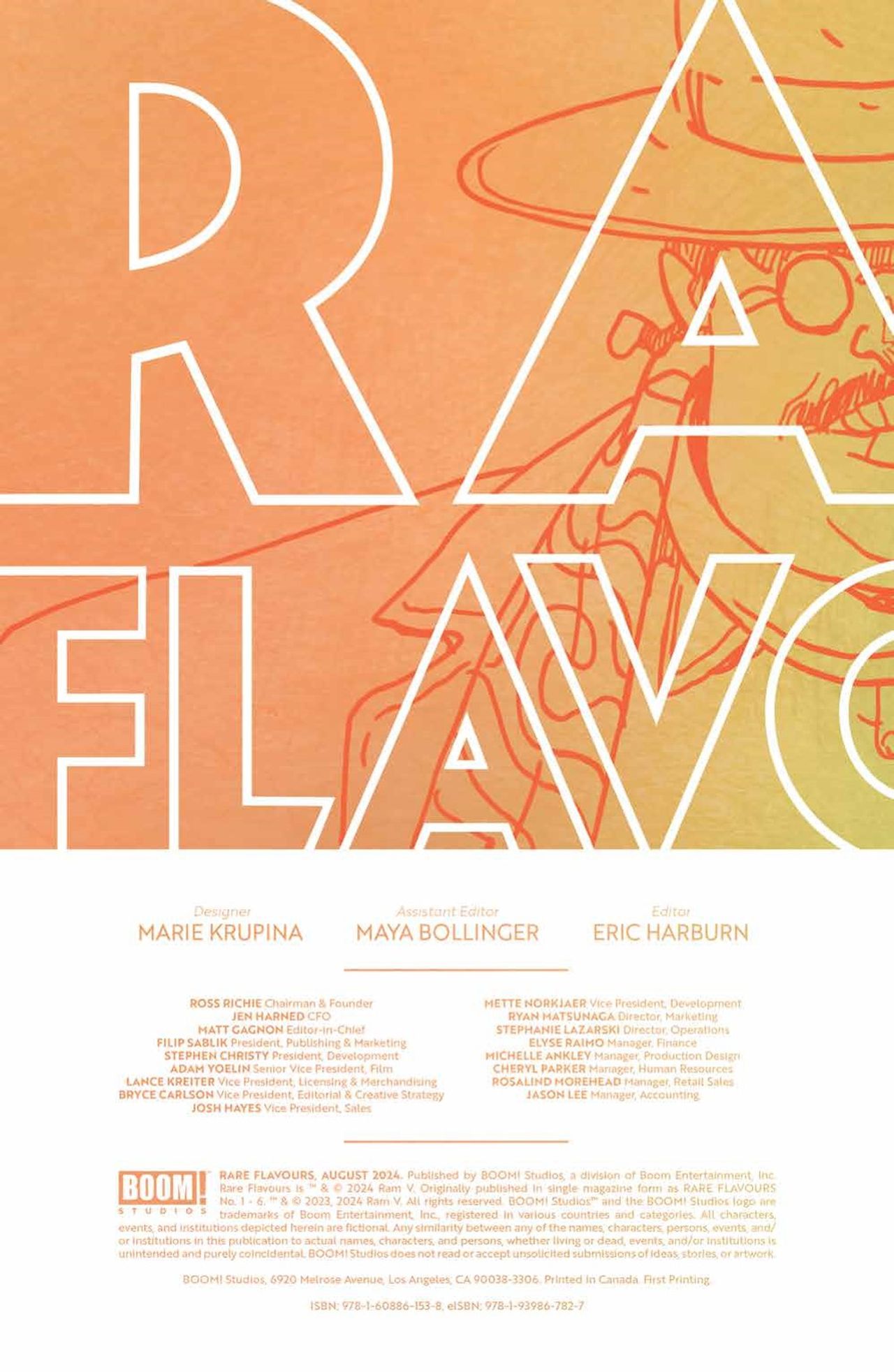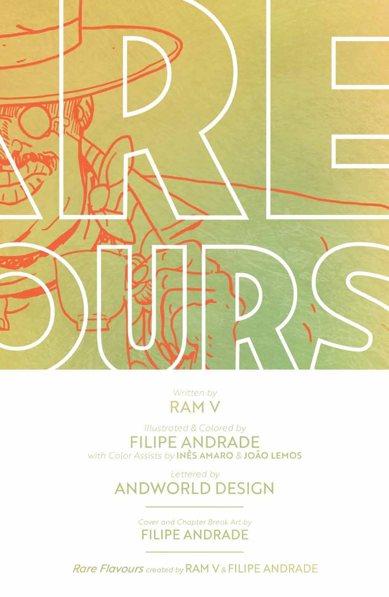 Discover the tantalizing tale of Rubin Baksh, a demonic Rakshasa with a down-to-earth dream of being the next Anthony Bourdain. To achieve his vision, Rubin enlists Mo, a filmmaker who has seen better days, to document the world-renowned cuisine of India and the people behind such glorious food. But little does Mo know that there's more to Rubin than meets the eye, and the mortals play a darker role in the show than they were prepared for… Entice your palate and feast on the follow up offering from the Eisner, Harvey, and Ringo Award-nominated The Many Deaths of Laila Starr team of Ram V (Detective Comics, Blue In Green) and Filipe Andrade (Fantastic Four, Star) with this masterpiece marrying the supernatural, Indian cuisine, and the cutthroat world of chef-driven celebrity! Collects Rare Flavours #1-6.