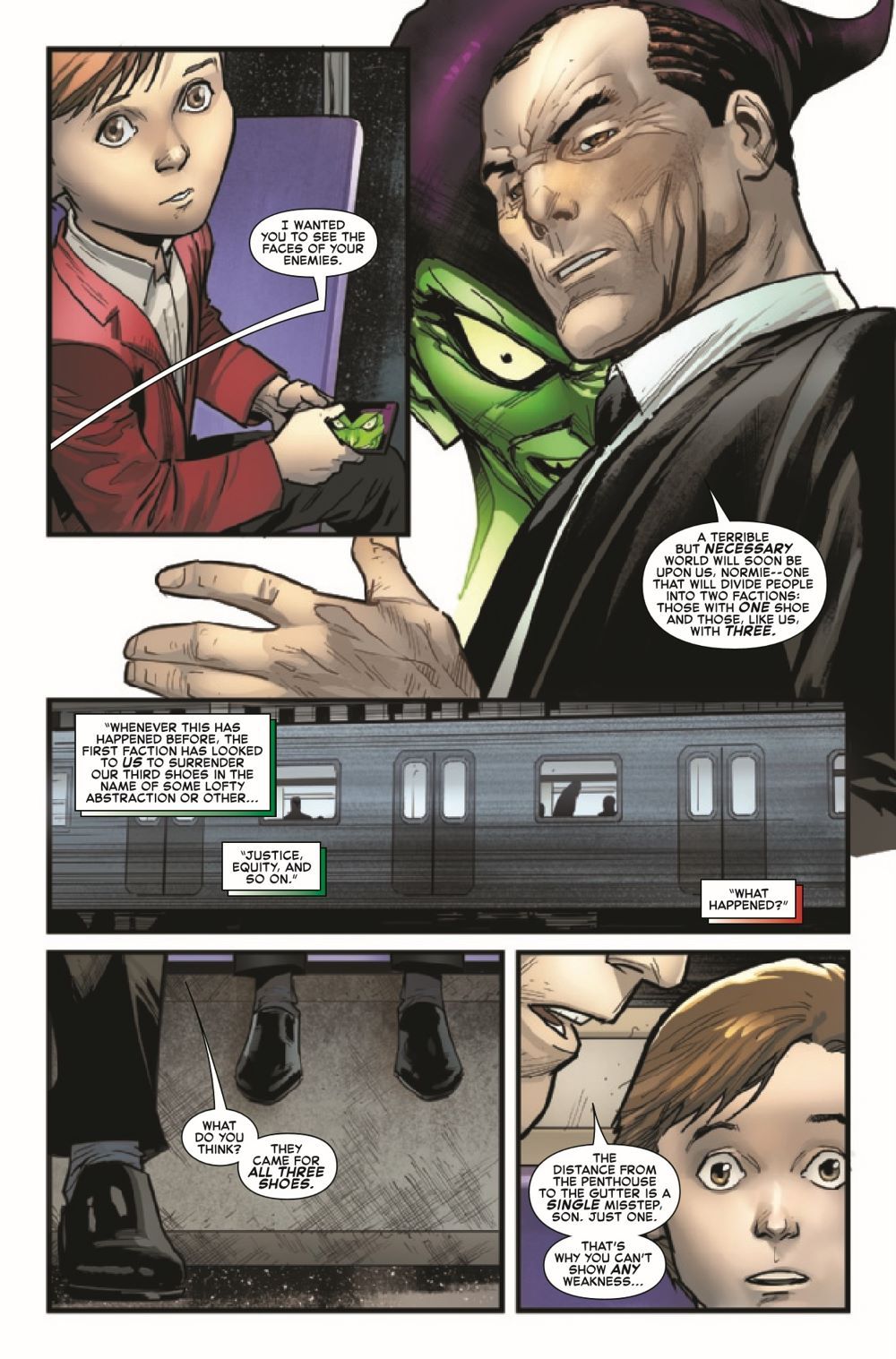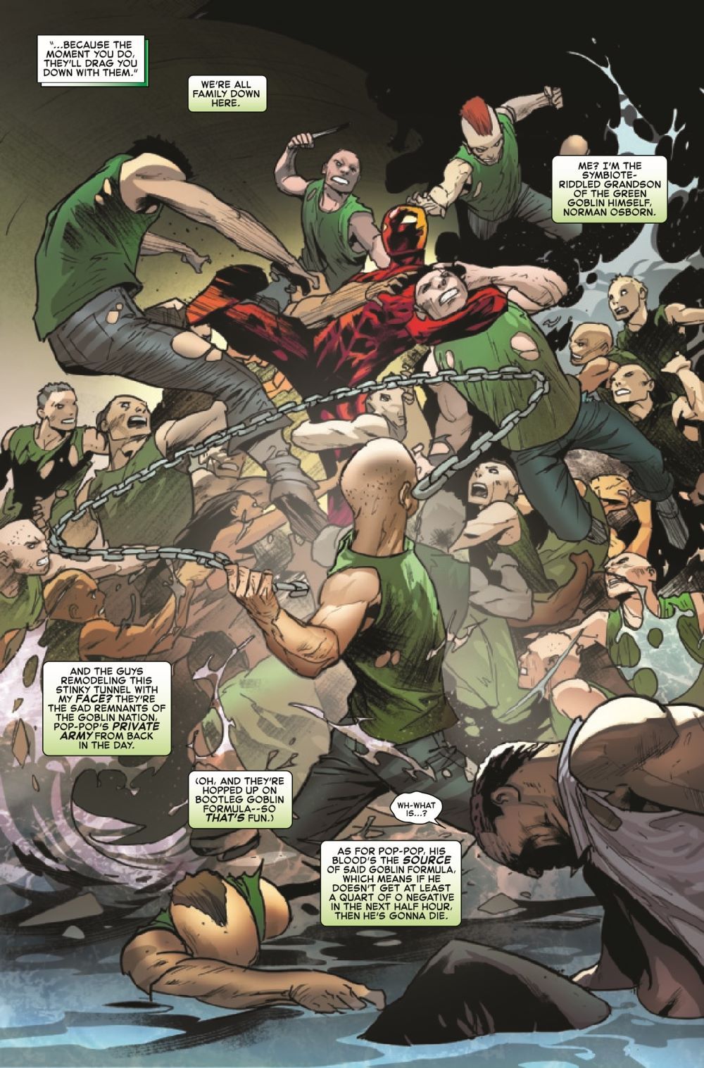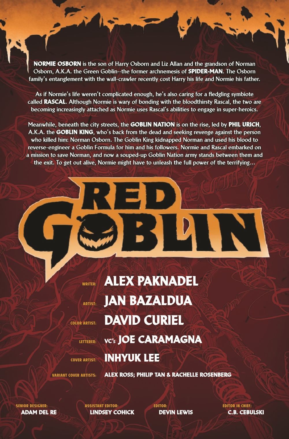 IT RUNS IN THE FAMILY… Norman Osborn has been targeted by a resurgent and terrifying GOBLIN KING for the precious GOBLIN FORMULA running through his veins – but why?! And with the emboldened remnants of the GOBLIN NATION at the undead King's command, will Normie Osborn be able to save his grandfather, or will the RED GOBLIN be the new King's latest victim?!