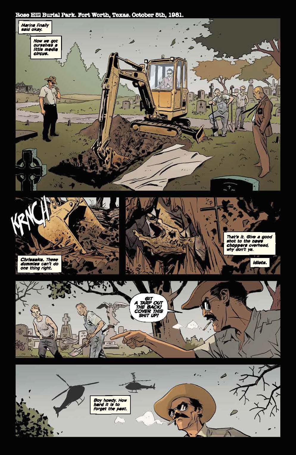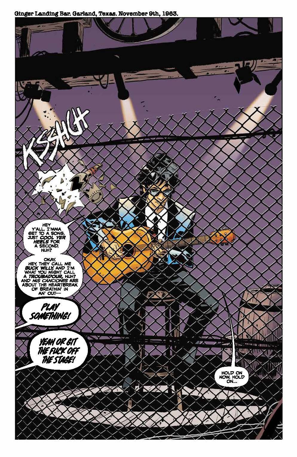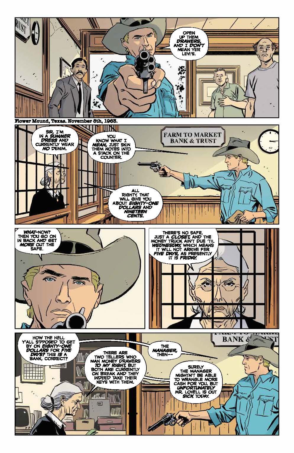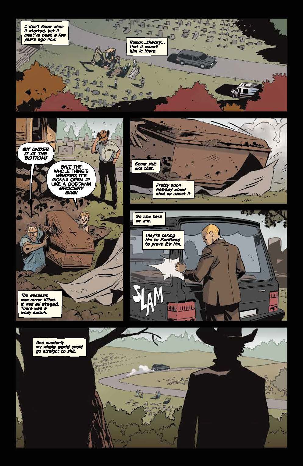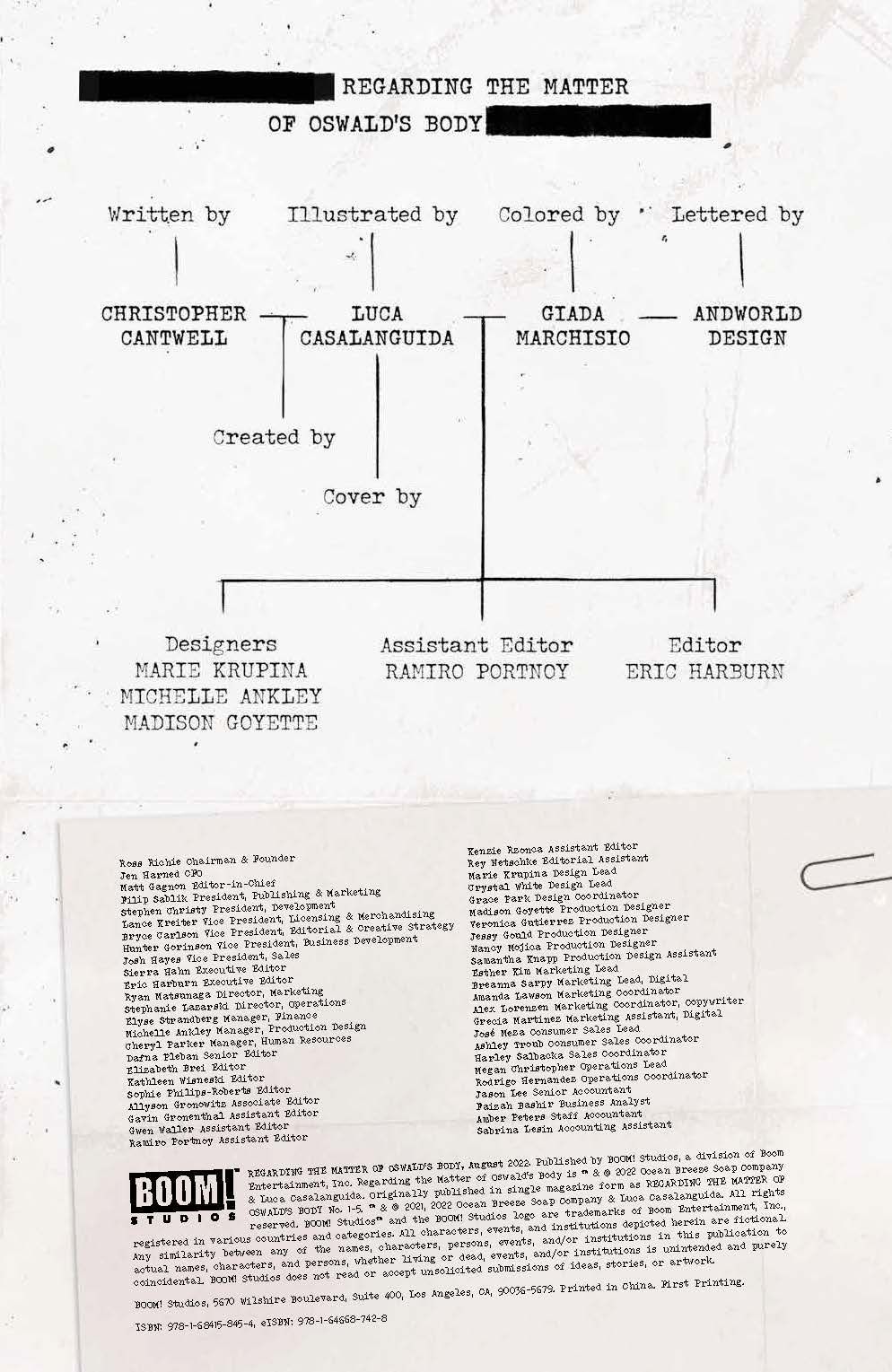Where is Lee Harvey Oswald's body? The Kennedy assassination is a rat's nest of conspiracy theories: mafia involvement, the second gunman, government cover-up… but the most important one may just be the theory that the body in Oswald's grave is not actually Lee Harvey. Meet the ragtag group of "useful idiots," unwittingly brought together to clean up the crime of the century – a wannabe cowboy from Wisconsin, a Buddy Holly-idolizing (former) car thief, a world-weary Civil Rights activist ready for revolution, and a failed G-Man who still acts the part – and specifically, regarding the matter of Oswald's body. Eisner Award-nominated writer, producer, and director Christopher Cantwell (Iron Man, The United States of Captain America) and artist Luca Casalanguida (Lost Soldiers, Scout's Honor) deliver an off-kilter crime thriller set in the shadows of history's greatest conspiracy. Collecting REGARDING THE MATTER OF OSWALD'S BODY #1-5.