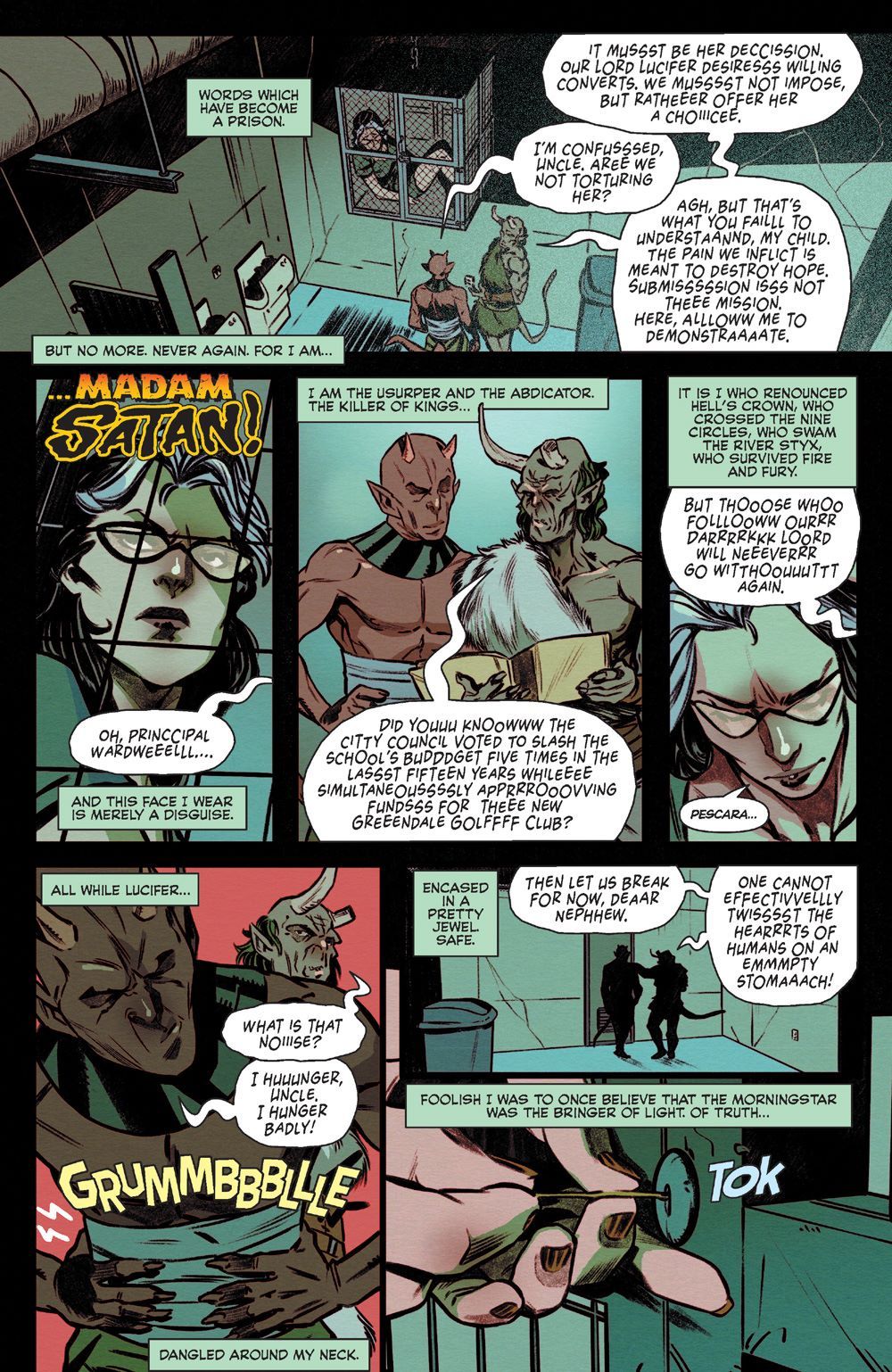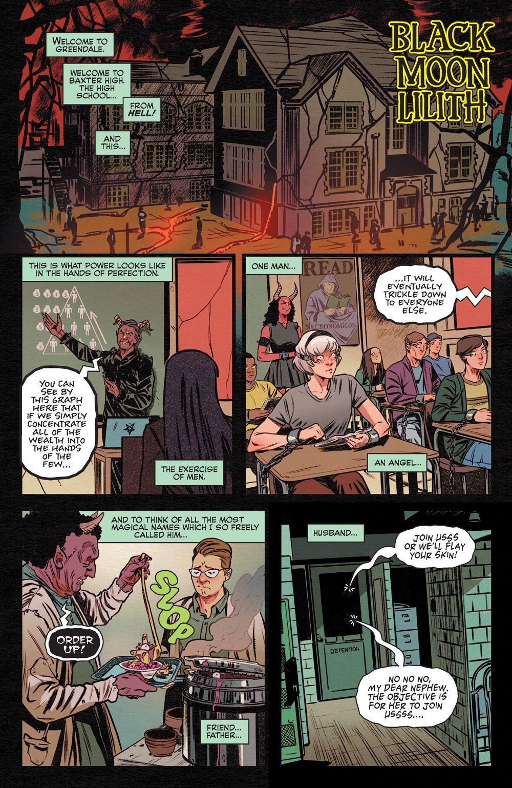 Madam Satan escaped Hell a fugitive and hated woman by Satan and his thralls. She's now principal of Baxter High and Hell has come to Earth. With each classroom acting as a portal to the different circles in Hell, Madam Satan must recruit similar tortured souls if she has any chance of survival… all leading up to a Madam Satan and her army vs. Satan and his in this highly-anticipated follow-up to last year's hit Chilling Adventures in Sorcery!