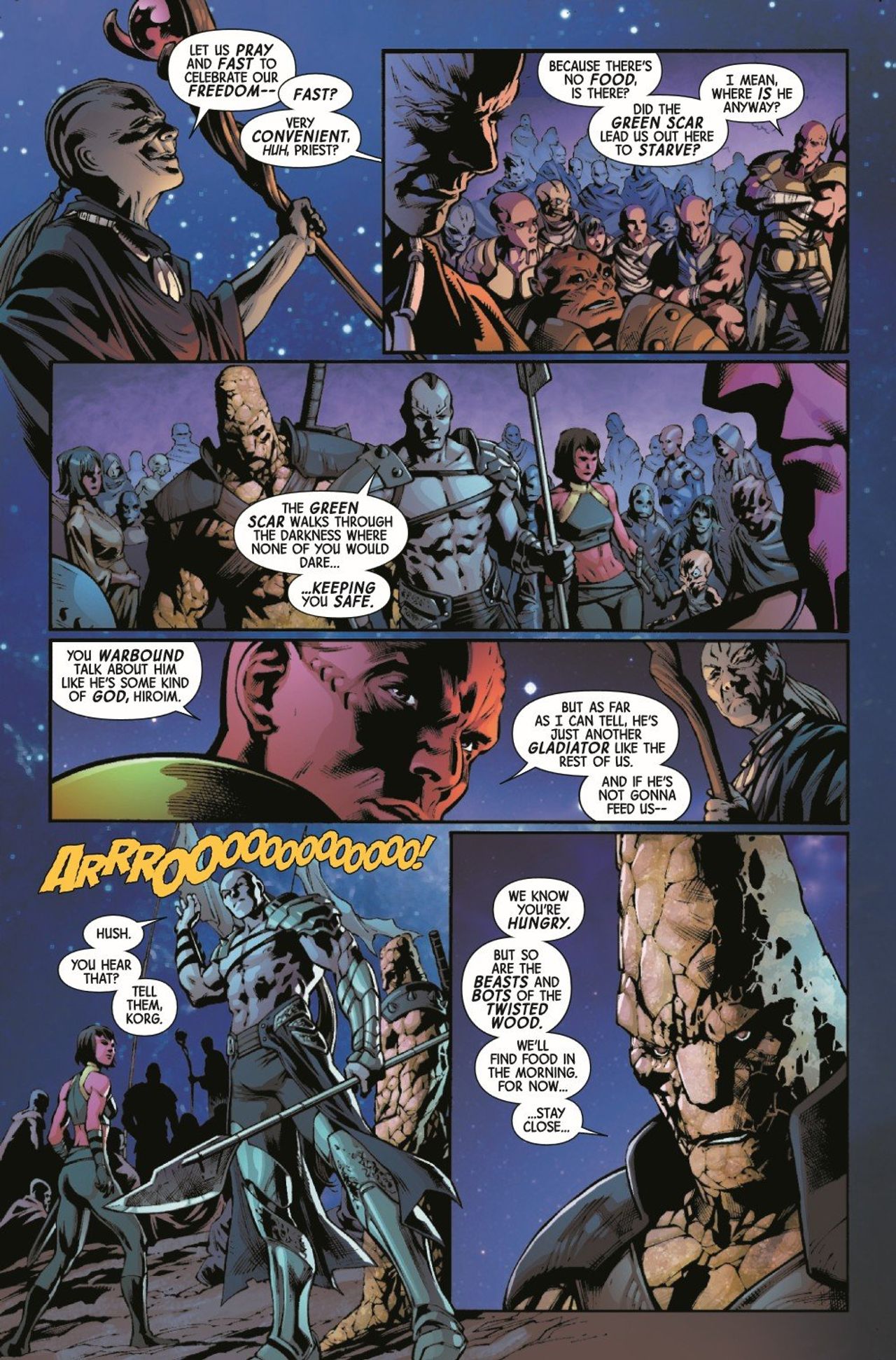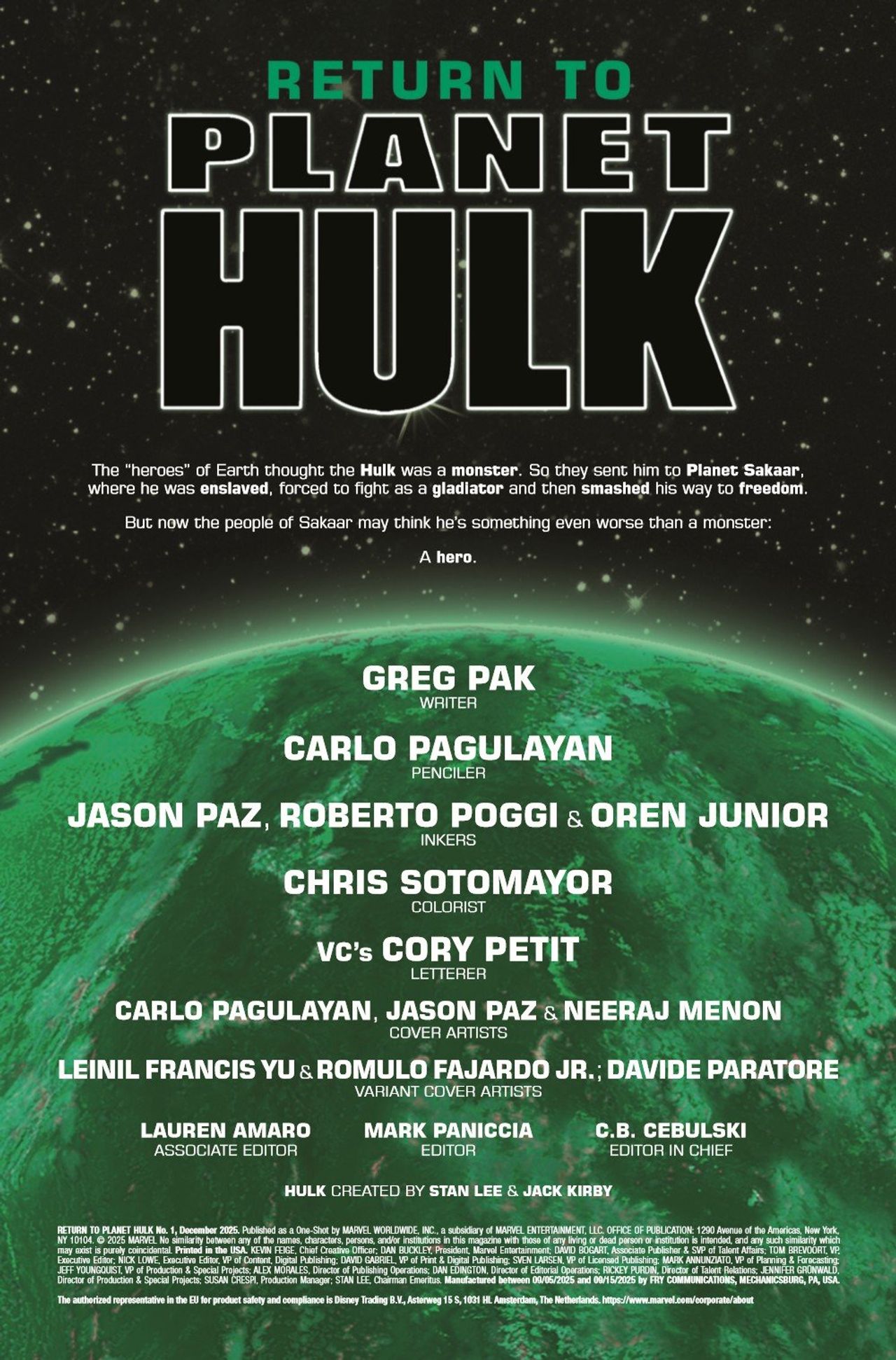 GAMMA-IRRADATED GLADITORIAL ACTION ON PLANET HULK! ALL-NEW STORY! Green blood will flow and sparks will fly! After escaping the RED KING'S deadly arena, HULK faces ferocious monsters and smashes his way through malicious machines and wild robotic terrors in one of his most important battles of survival on the war-torn planet of SAKAAR! Two possible destinies are at stake! The SAKAARSON, savior of the planet, or the WORLDBREAKER, the legendary destroyer! Will his rage only fuel the chaos of this alien world? Trust us, you're not going to want to miss out as superstar writer Greg Pak returns to his seminal run in this epic, gripping tale!