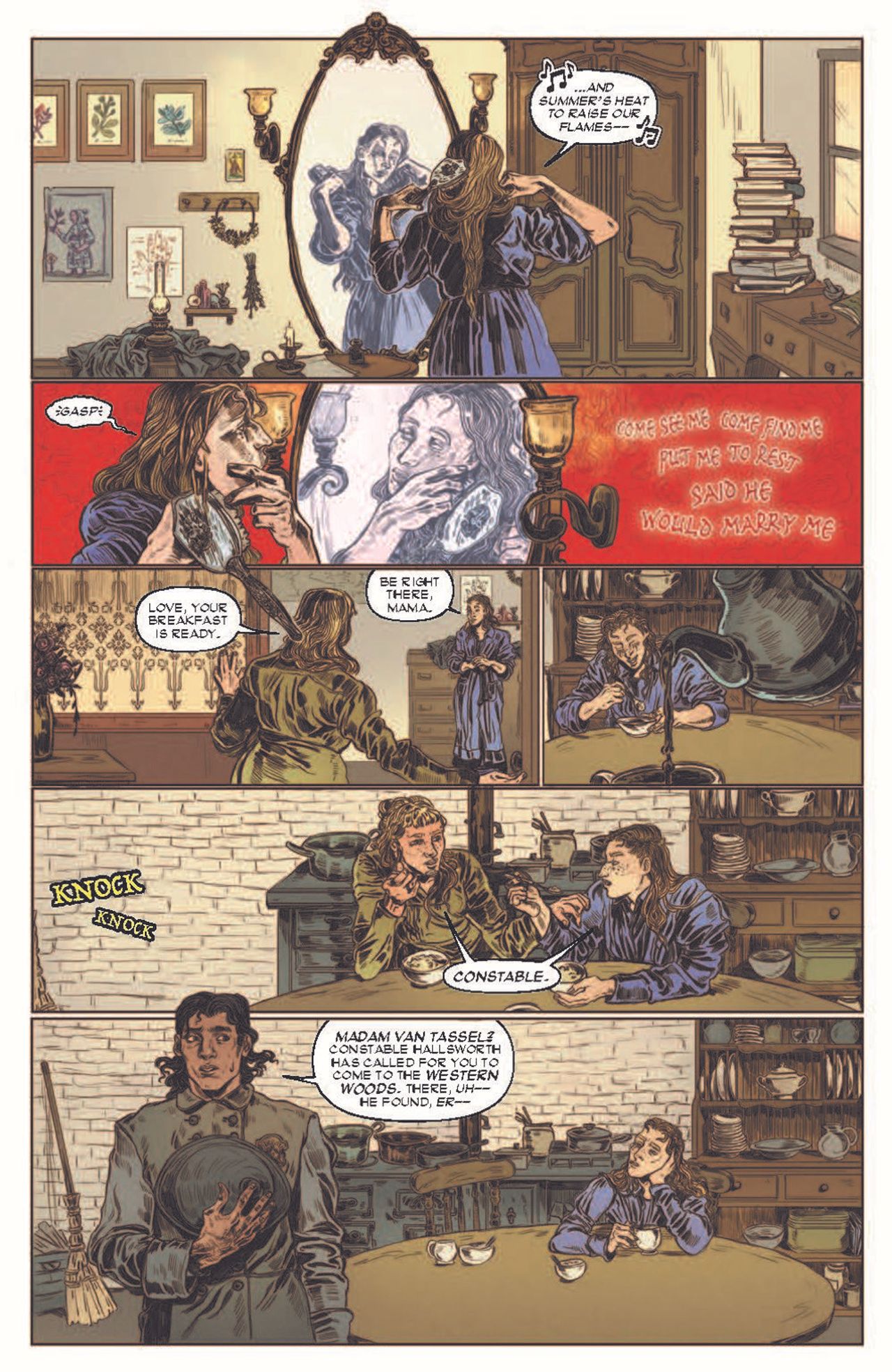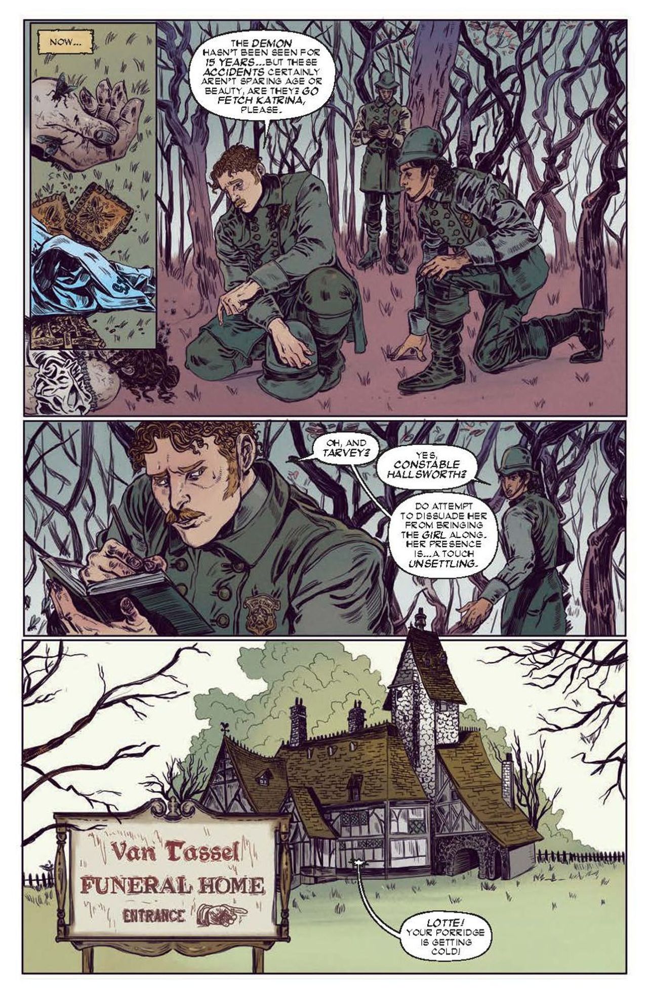 Tim Burton's Sleepy Hollow (1999) continues in Return to Sleepy Hollow! From Eisner Award–winning author Casey Gilly (Buffy the Last Vampire Slayer, "A Funeral in Foam") comes a tale of buried truths, decaying bodies, and rotting gods. The Headless Horseman hasn't plagued Sleepy Hollow for 15 years now, but unbeknownst to the residents of the drowsy valley, a deeper evil lurks in the roots of the town, and it will stop at nothing to quench its thirst for blood. Ichabod Crane is a man of science and, despite his indisputable brush with the supernatural, has built a name for himself debunking claims of the occult across the world. However, when he receives a frantic letter urging him to return to Sleepy Hollow, Ichabod must reunite with his now estranged love, Katrina Van Tassel, to investigate a string of strange, unexplainable murders. Together, they will uncover the truth of Sleepy Hollow's origins and the roots that connect them all.