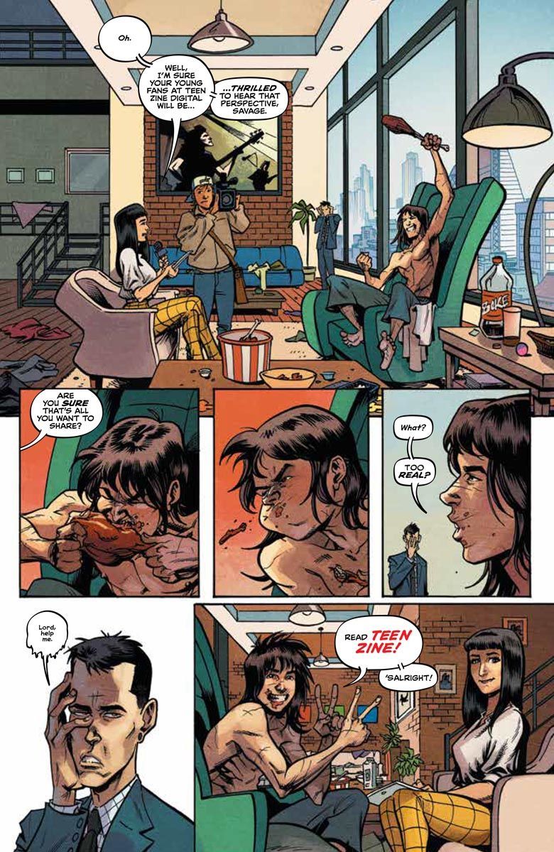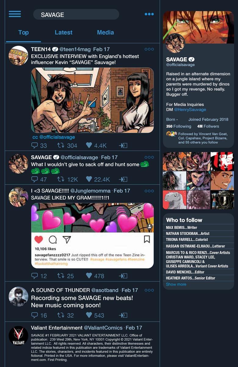 From the mad minds of international superstar Max Bemis and powerhouse artist Nathan Stockman comes the craziest action book of 2021. Teenage heartthrob. Feral social icon. Dinosaur hunter? Raised on an uncharted island full of prehistoric dangers, Kevin Sauvage has a taste of home when a mutant dino threat invades England!