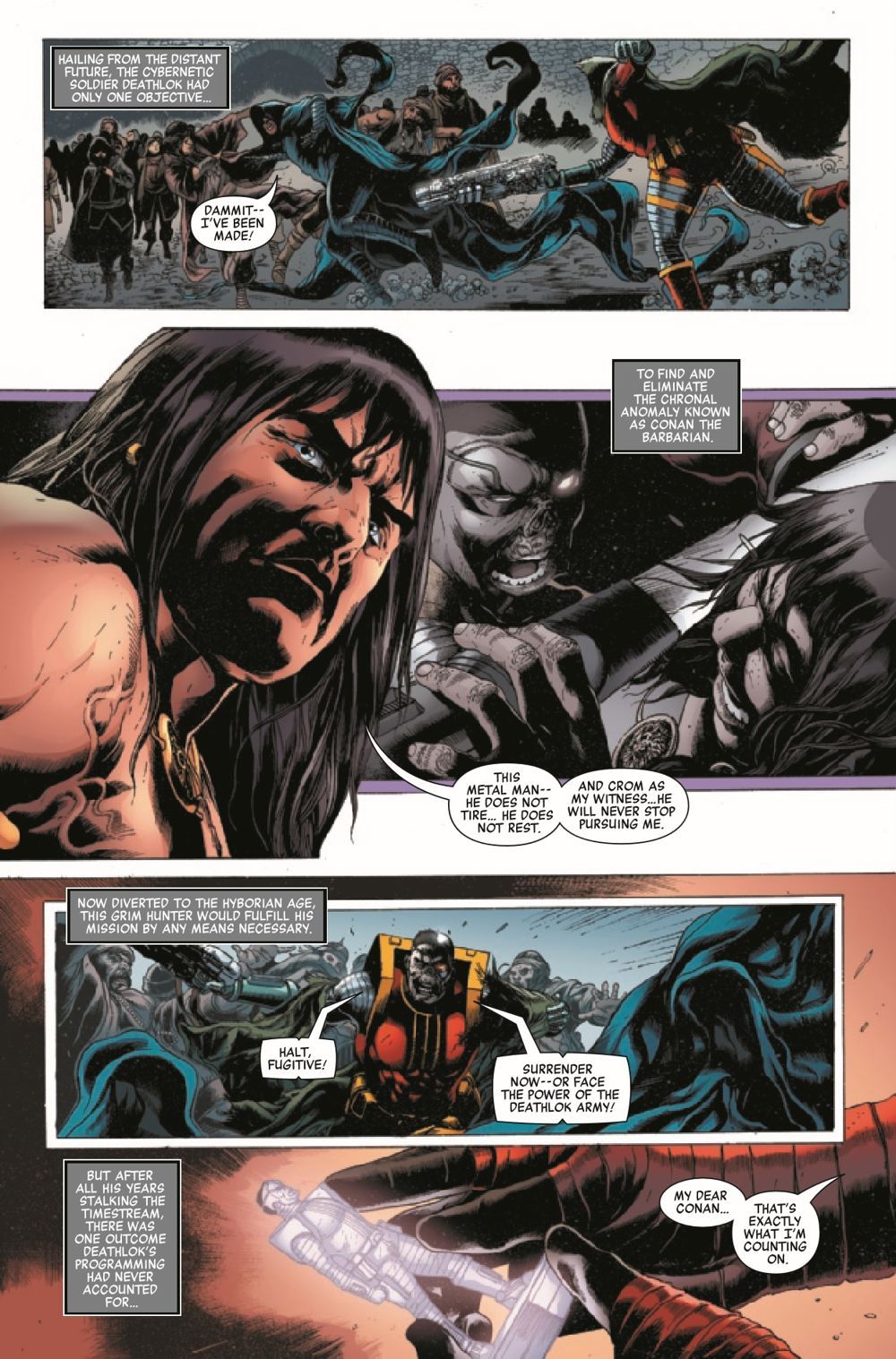 JOURNEY TO THE TEMPLE OF THE BEAST! Banding together the deadliest warriors of the Marvel Universe, Conan and the Savage Avengers have never been accustomed to playing defense. But after being hunted across the Hyborian Age by DEATHLOK THE DESTROYER, only one thing's for certain - our heroes aren't running anymore. Armed with a death-defying plan in the heart of a forbidden temple, can even the Savage Avengers fight against the future? Or will an ancient evil crush their victory before they've even begun? Everything changes in this sword-and-sorcery showdown between Cyborg and Cimmerian!