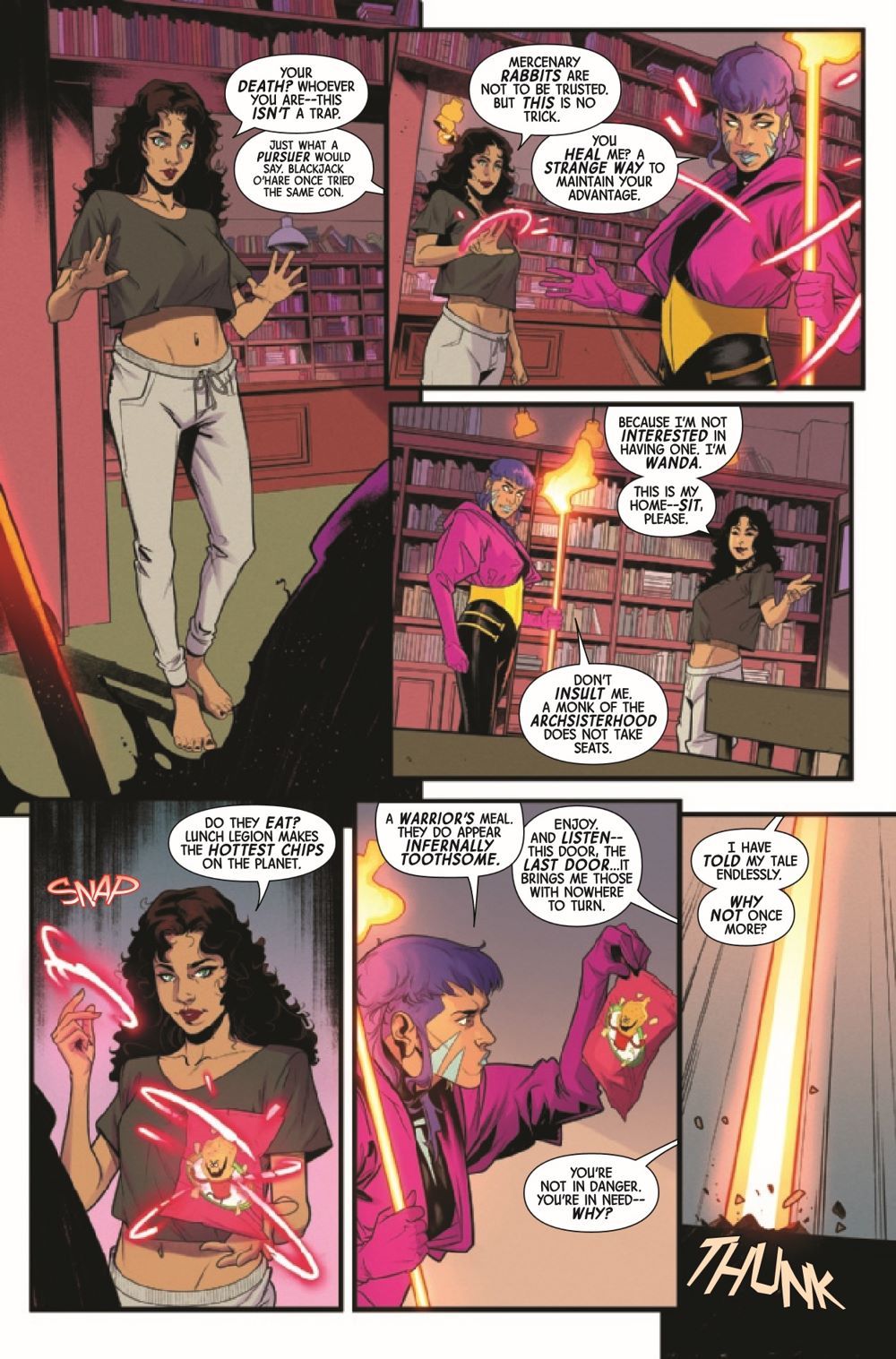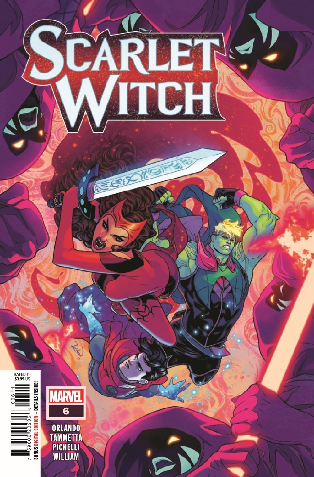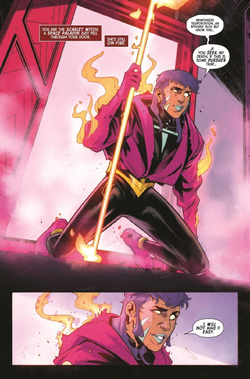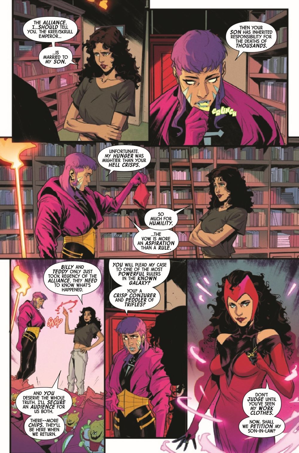 FAMILY MATTERS! Wanda's loyalties are tested when an enemy of the Kree/Skrull Empire falls through the Last Door desperate for help avenging their fallen comrades. Will Wanda honor the commitment she made to helping those in need - whoever they are - or will her love for her son Wiccan and his husband, Hulkling, triumph over all? PLUS: A familiar figure appears at Wanda's shop…and it seems rumors of his death have been greatly exaggerated. But does he come as friend or foe?