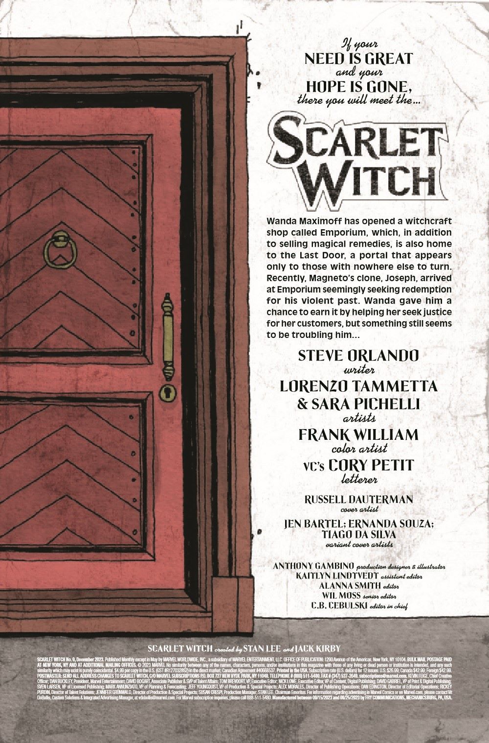 Being the hero to the hopeless is a full-time job, and Wanda Maximoff could certainly use some help. When she teams with a mysterious new ally to assist the people seeking help through the Last Door, things seem to be looking up. But is he everything he appears to be? Or has Wanda put her trust in the wrong person? Plus! A backup story celebrating Latin/x heroes and creators! Wanda Maximoff teams up with Strange Academy student Eva Quintero in a backup story by Juan Ponce and Ig Guara!