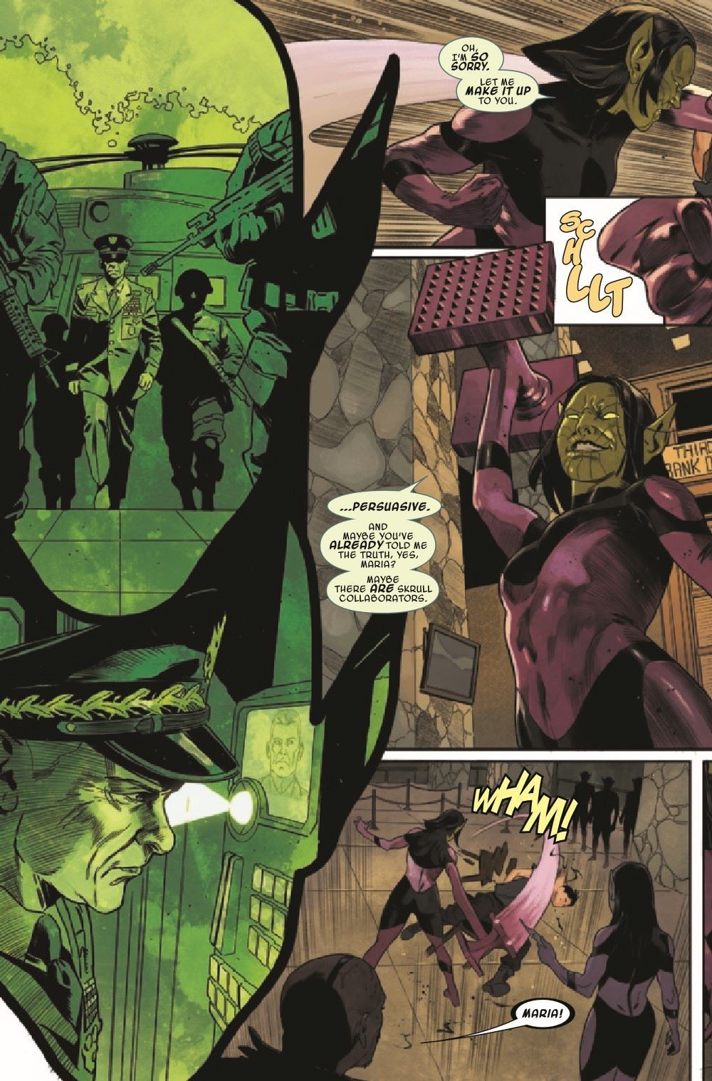 The Skrulls have tightened their envious grasp on the world as their plan creeps toward its ultimate culmination…and with Maria Hill, Nick Fury and Tony Stark off the board, all seems lost! The Skrulls have nuclear codes. They've got people in positions of power. But for once, they DON'T have the element of surprise. Twists, turns, shocking reveals and a conclusion you won't want to miss! This invasion is going out with a BANG.