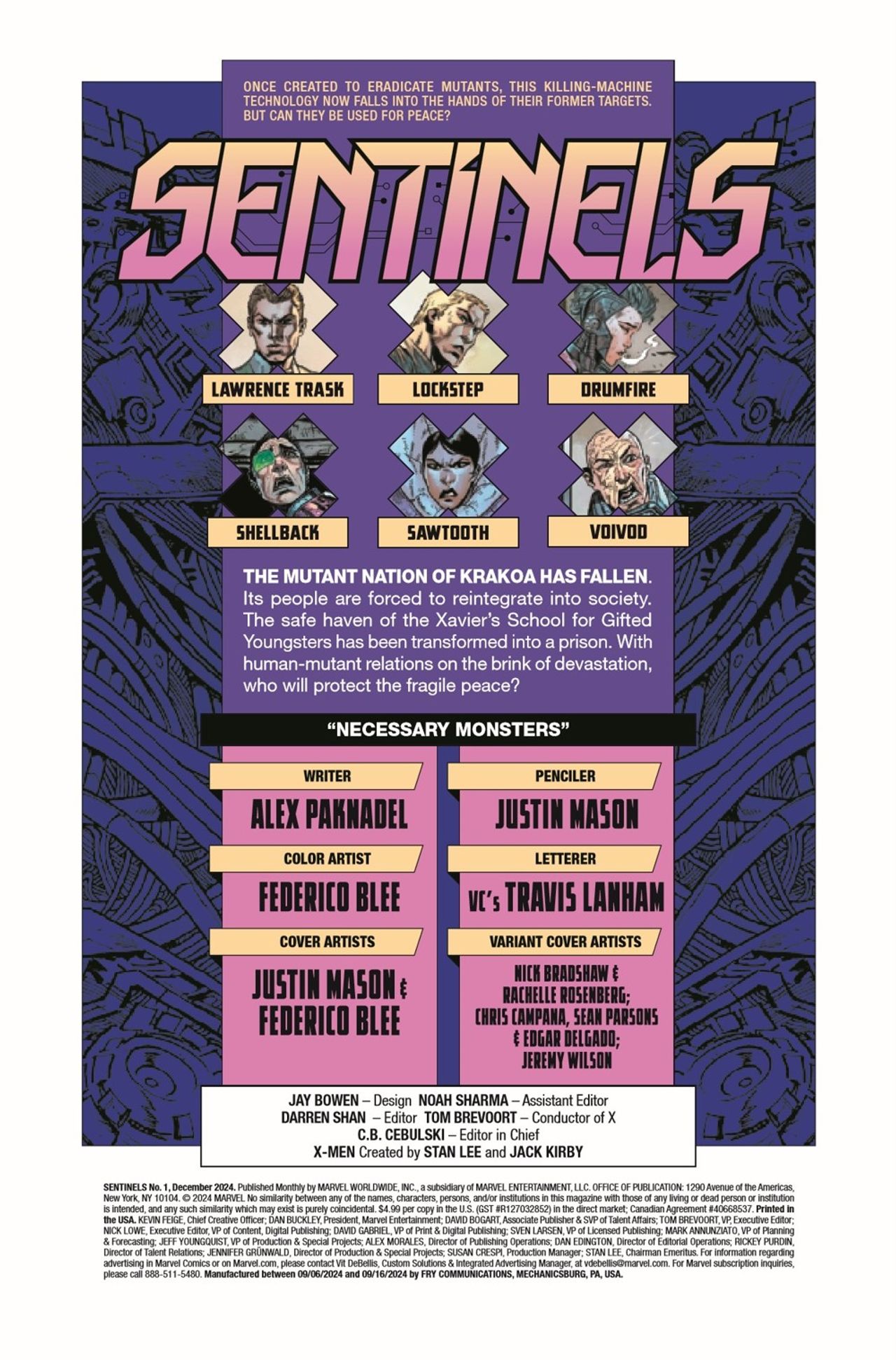 WHO ARE THE NEW SENTINELS? The original Sentinel Program was human supremacy and fear coded into circuitry. But now their legacy falls into the hands of mutantkind! Powered by cutting-edge nanotech, this new generation of Sentinels protects a fragile peace between mutants and humans. But when being a Sentinel is your job - your life - is it possible to stay human? Mount up as Alex Paknadel (CARNAGE) and Justin Mason (SPIDER-PUNK) bring you a brand-new team of heroes that will take on the most heinous mutants! Their first mission: Capture Omega Red!