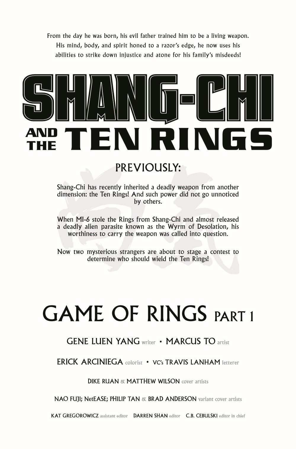 THE GAME OF RINGS STARTS HERE! Shang-Chi must compete in a martial arts tournament against some of his deadliest foes. The winning prize? The Ten Rings! But who has staged this contest? And does Shang-Chi truly want to win?!