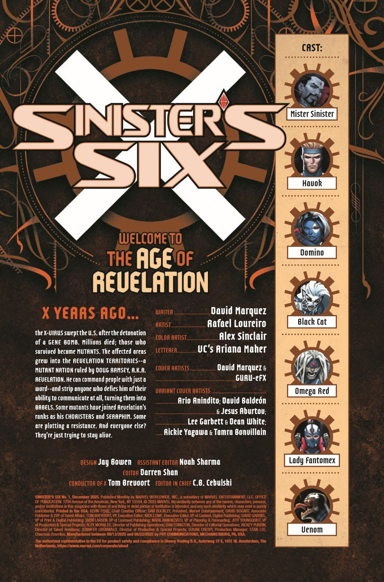 A SINISTER HEIST! X YEARS LATER, Mr. Sinister assembles an elite strike force to take his rightful place…on the throne of Revelation! What has Sinister offered Havok, Black Cat, Domino, Omega Red, Fantomex and Venom to convince them to take on impossible odds? Are Sinister's misfits throwing their lives away, or has Revelation underestimated how far his subjects will go when there's nothing left to lose?