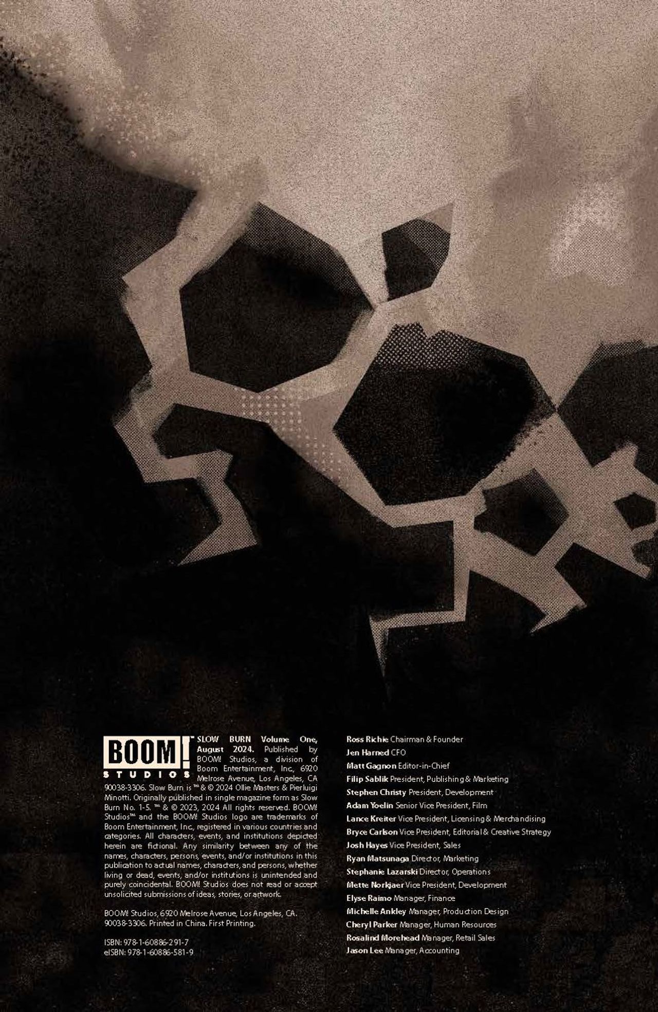 Fleeing a botched robbery in New York City, a junkie, her dying partner, and a dementia-ridden old man pull into a coal mining ghost town in central Pennsylvania. Obscured by the caustic mists spewed forth by the coal-seam fire from the 1960s–still burning–Trier is the perfect place to lay low, score a fix, and take a hostage... or is it? As the caustic origins of a town of fire are revealed, along with the guilt, fear, and penance tied to the past, and those who stayed in Trier, they will discover a horrific truth while on the run from death. Acclaimed crime writer Ollie Masters (Snow Blind, The Kitchen) and artist Pierluigi Minotti (Lost Falls) transport readers into a bleak, violent world, perfect for fans of Gideon Falls and Stray Bullets. Collects Slow Burn #1-5.