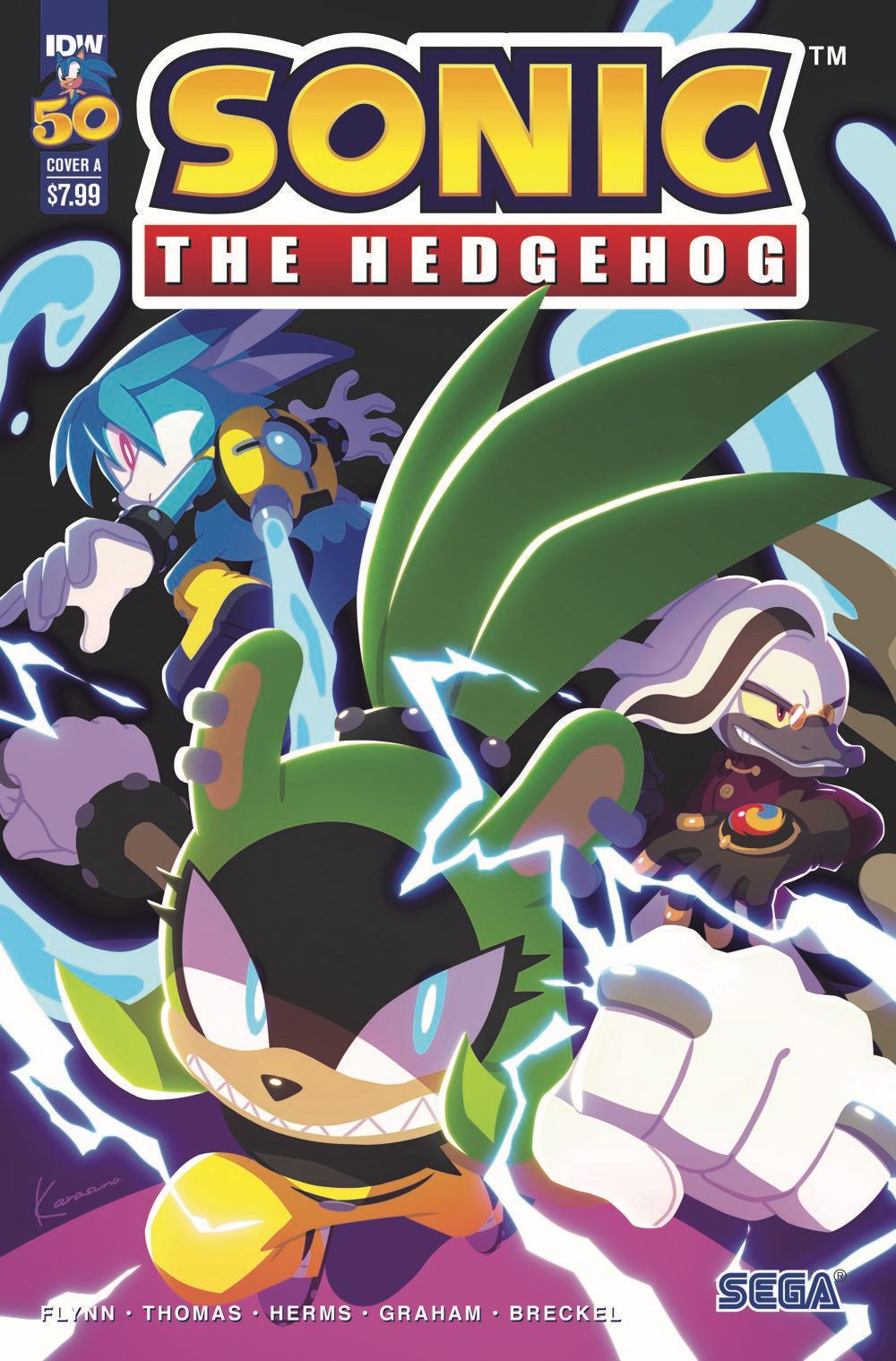 Sonic the Hedgehog #50 is here! To celebrate, this issue features two Sonics! And two Tails! Wait… One of them is green… And the other has tails made out of water?! Imposters! And they're working with Dr. Starline?! After assembling a squad of bad guys, kidnapping Belle, starting a forest fire, and causing chaos in Central City, Starline is finally ready to unleash his monstrous imposters: Surge and Kit! Will his meticulous planning be enough to defeat Sonic and Dr. Eggman? The throne is only big enough for one…