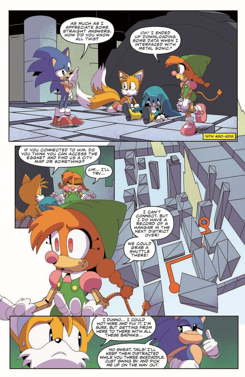 After fighting for their lives in issue #50, both the heroes and bad guys need some time to heal and regroup…except Dr. Eggman, of course, who is always ready to destroy that darn hedgehog. Can Sonic, Tails, and Belle escape the city, or will Eggman finally bumble his way to victory?