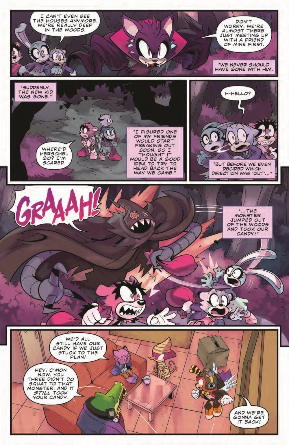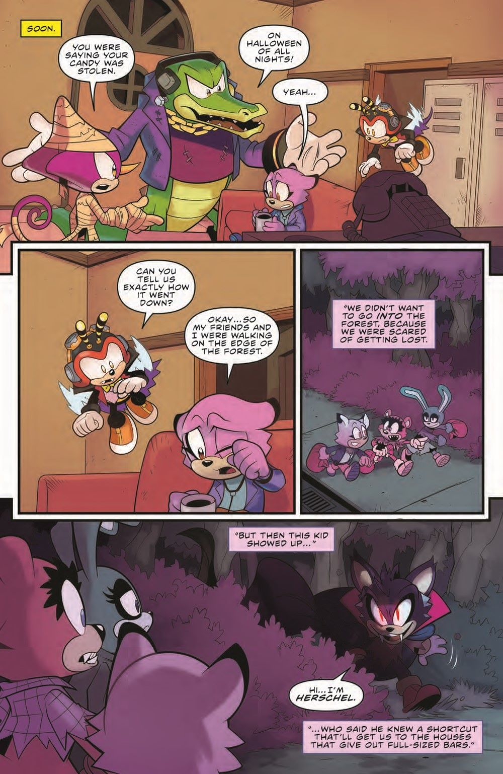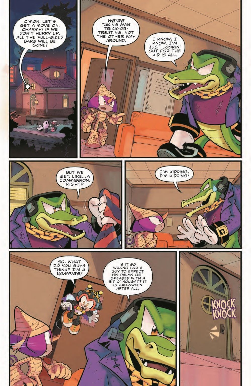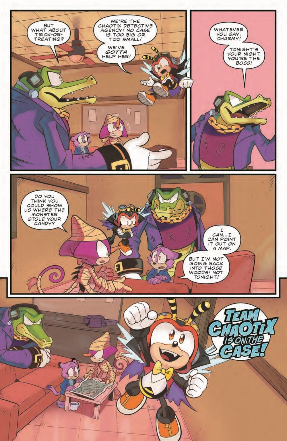 Trick or treat, it's Charmy Bee...t! It's "A Very Chaotix Halloween" as Vector and Espio take their little buddy out in search of sweet rewards. Little do they know, there's a monster stealing candy from all the kids! Fortunately, there's no mystery the Chaotix Detective Agency can't solve, especially when they've got a little help from Sonic and Tails!