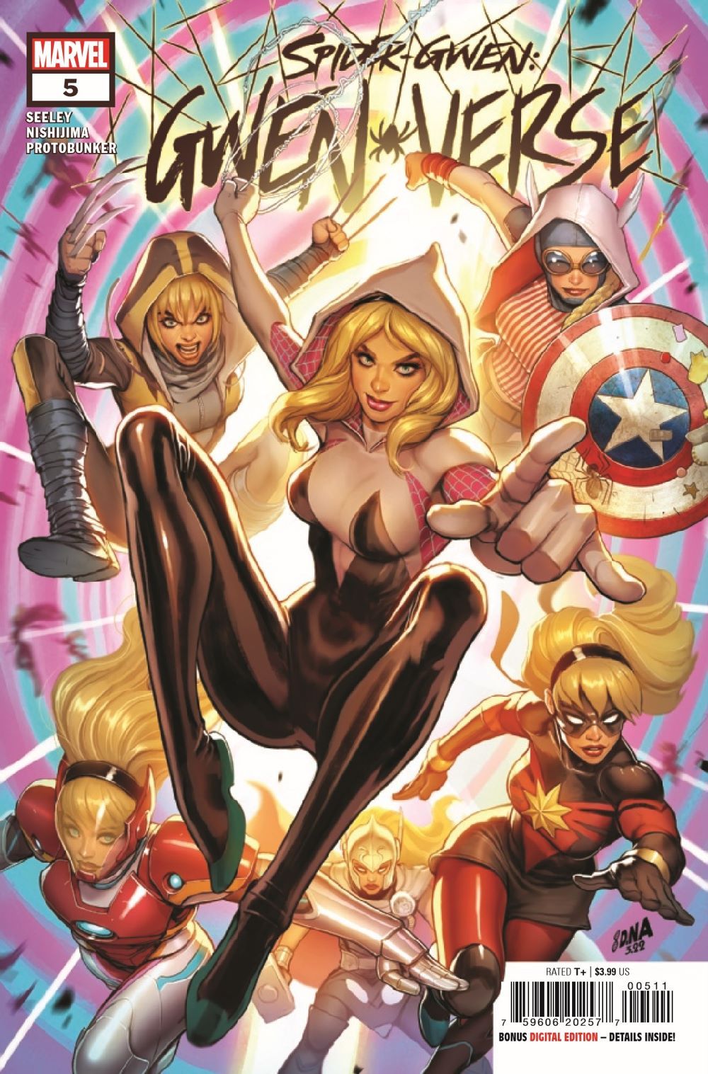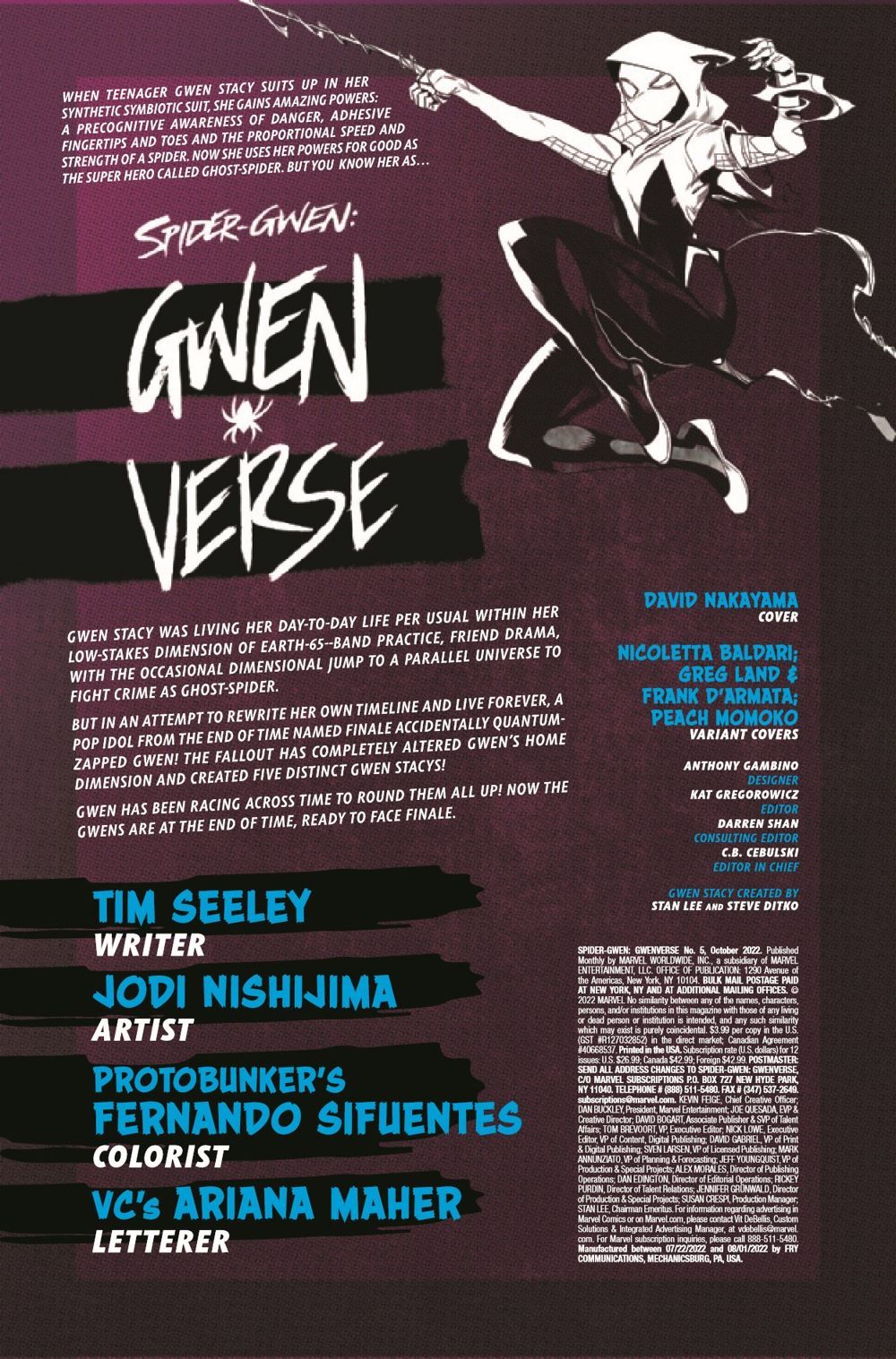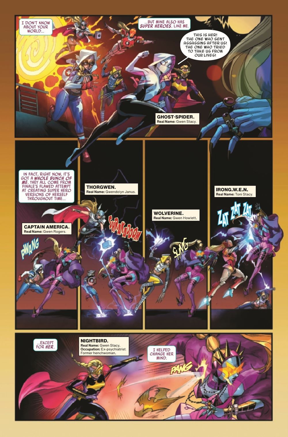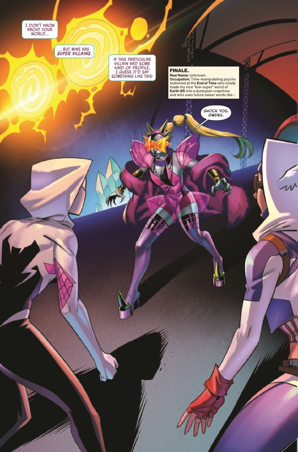FACE TO FACE WITH FINALE! Gwen has one last stop and it's at the end of time to face the one who started it all, Finale! But if Gwen defeats Finale will her time be fixed? Perhaps not as she remembers it... And what's to happen to the other Gwens?! Don't miss the epic final issue that will impact Gwen Stacy's entire timeline!