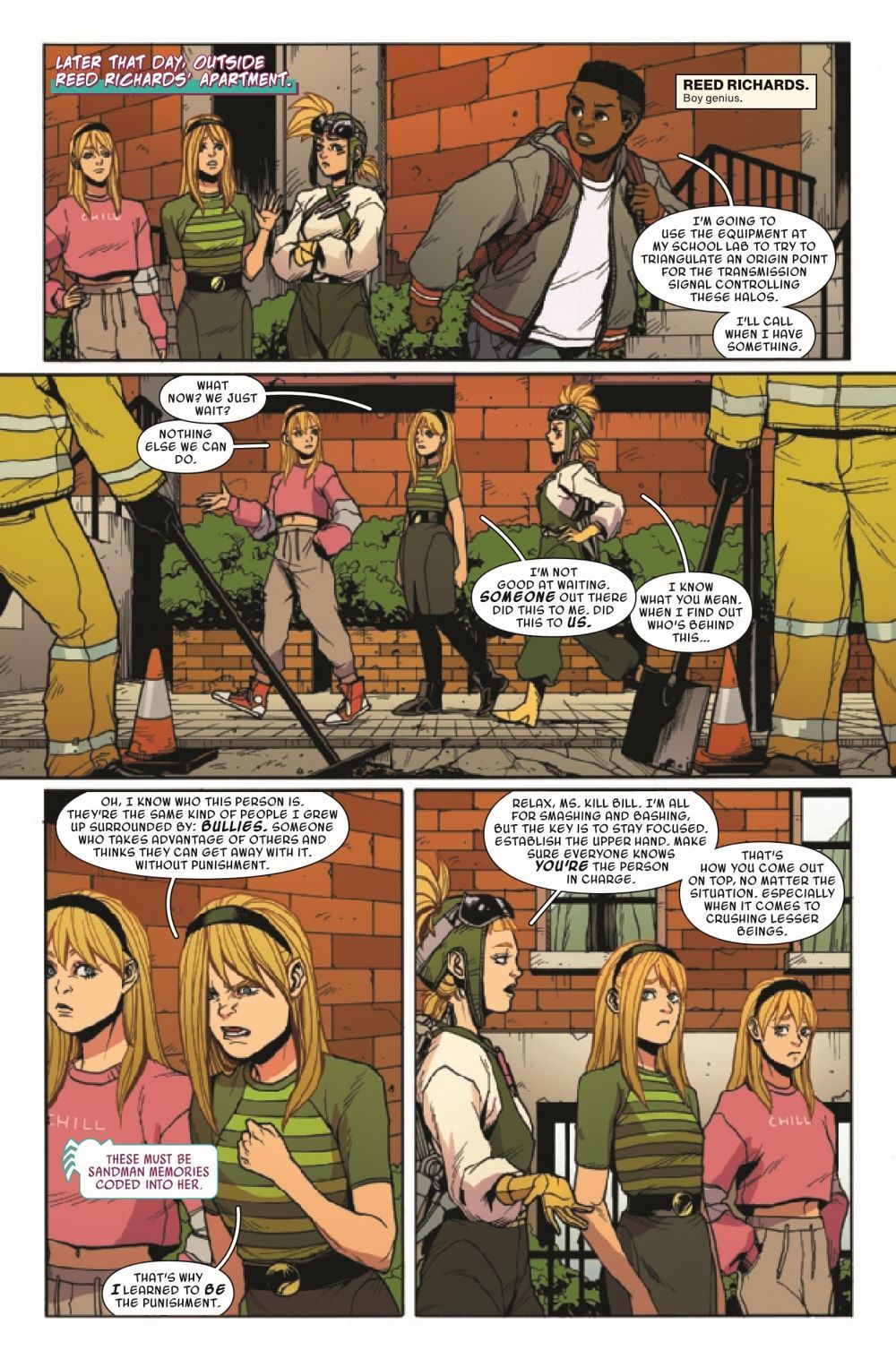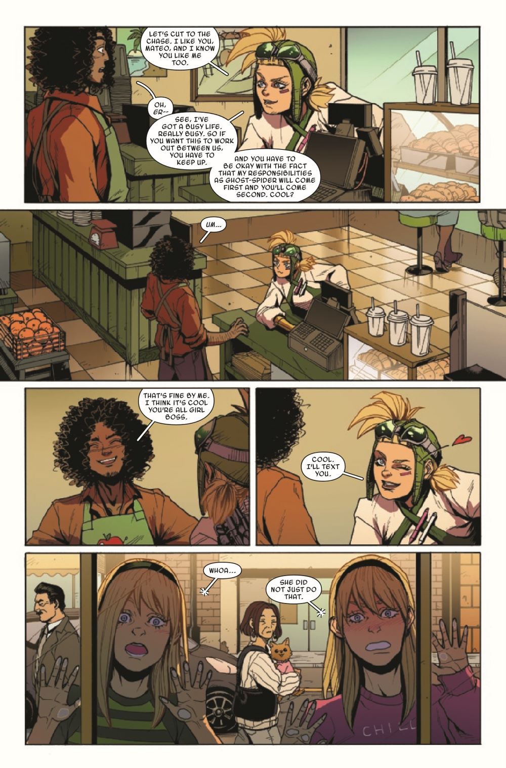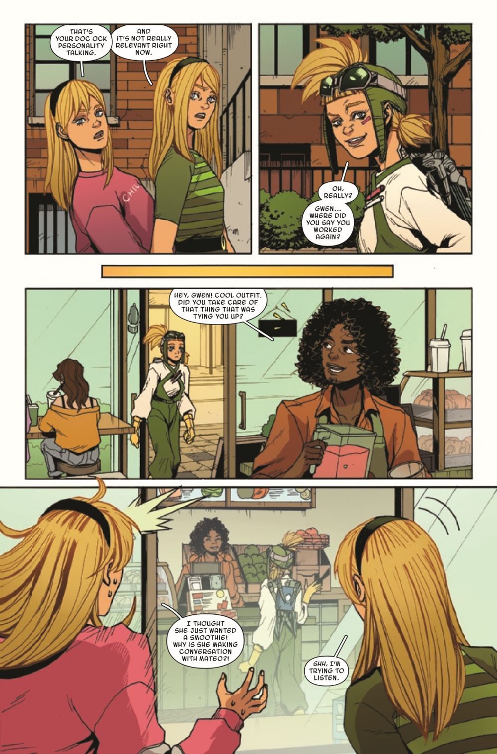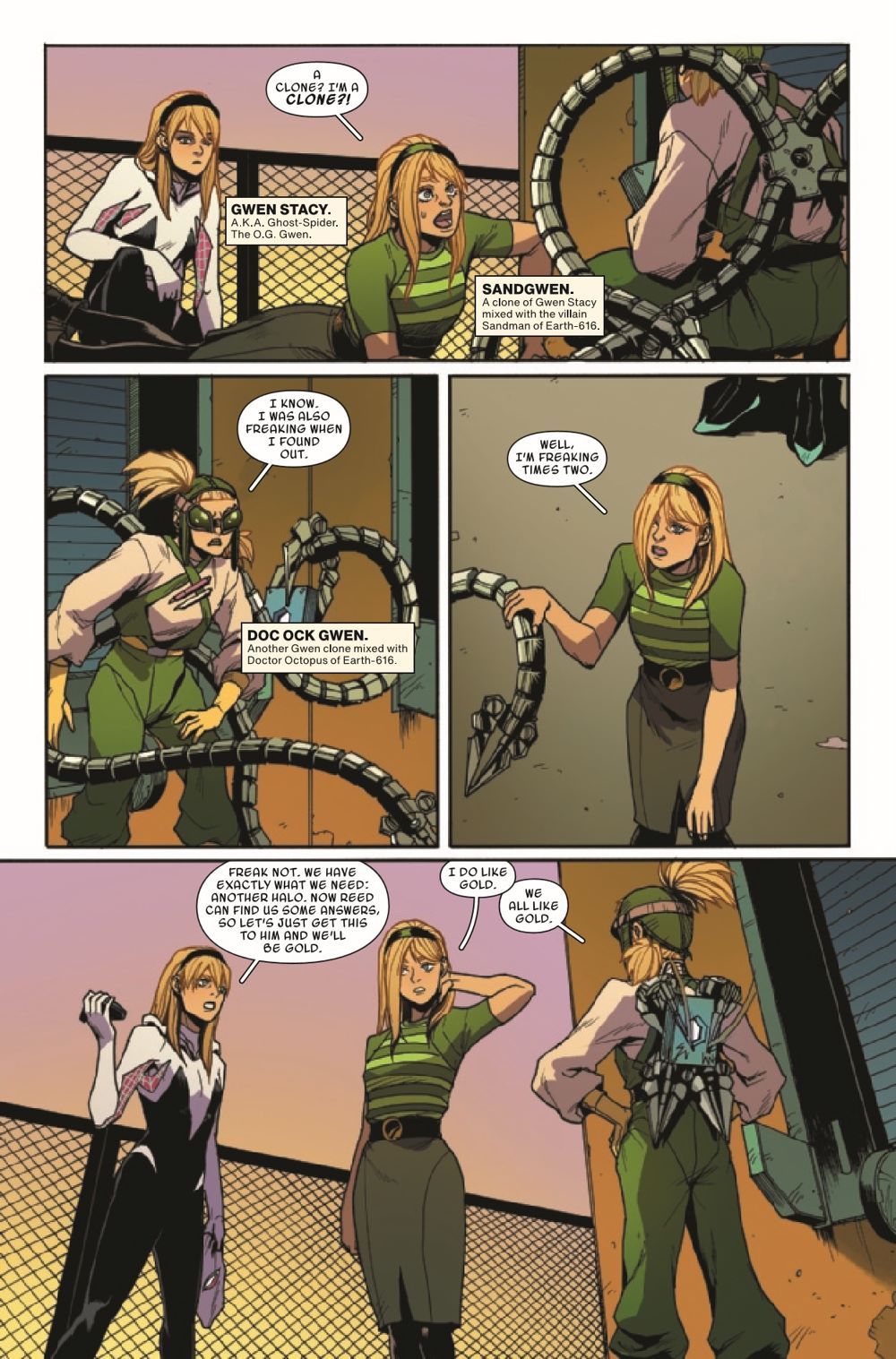 WHO CREATED THE CLONES? Things are not looking good for Spider-Gwen! Surrounded by three more clones who are ready for one less Gwen to be in this world, Ghost-Spider is beaten and alone. Unfortunately, that is not all she has to be worried about... Someone lurks in the shadows, as the mastermind behind the clones is revealed!