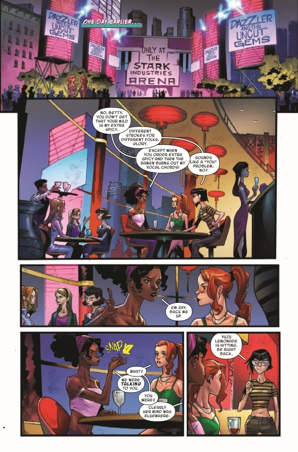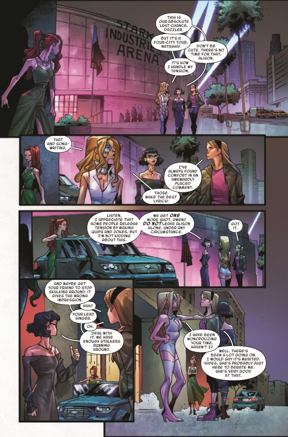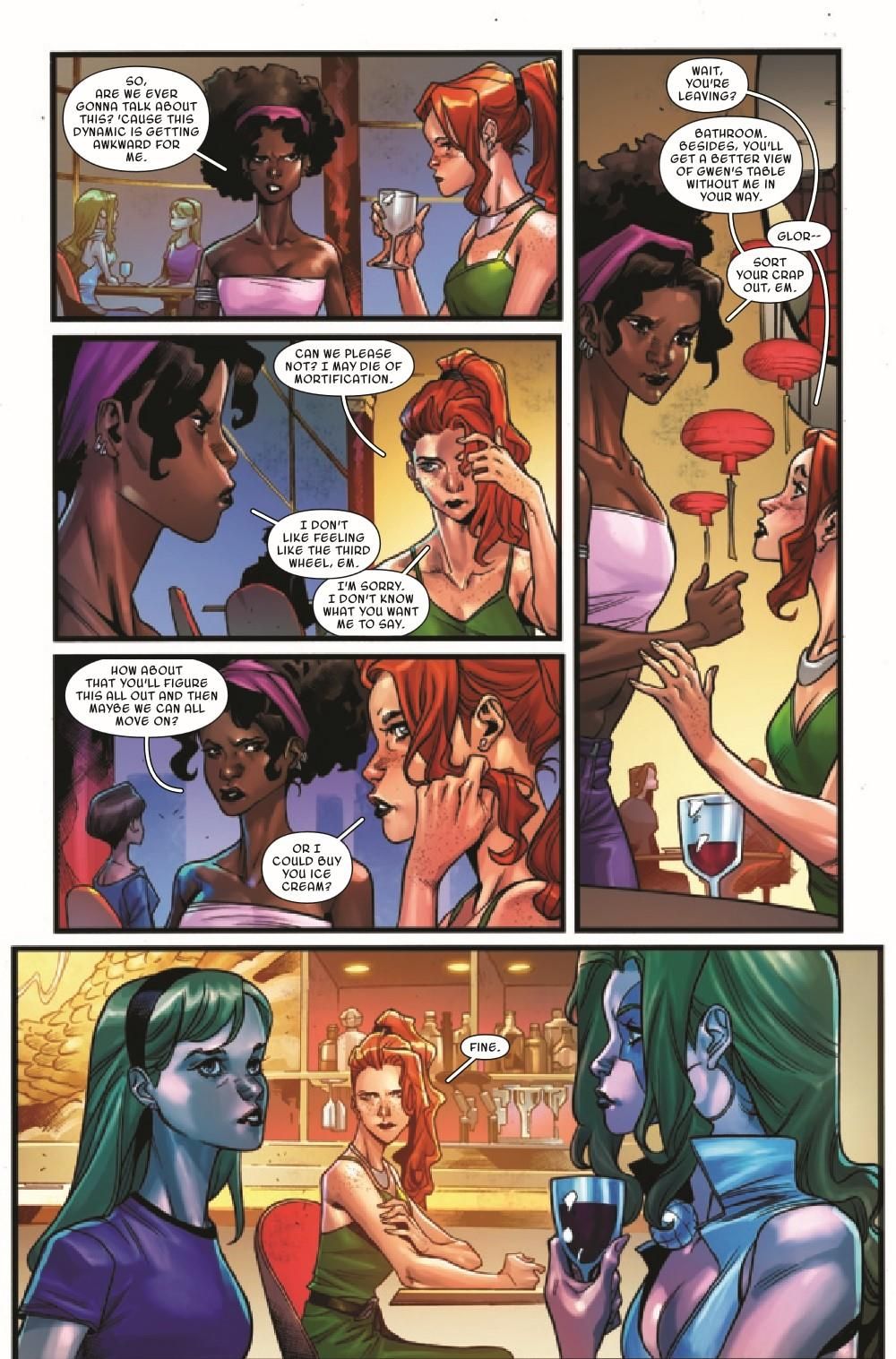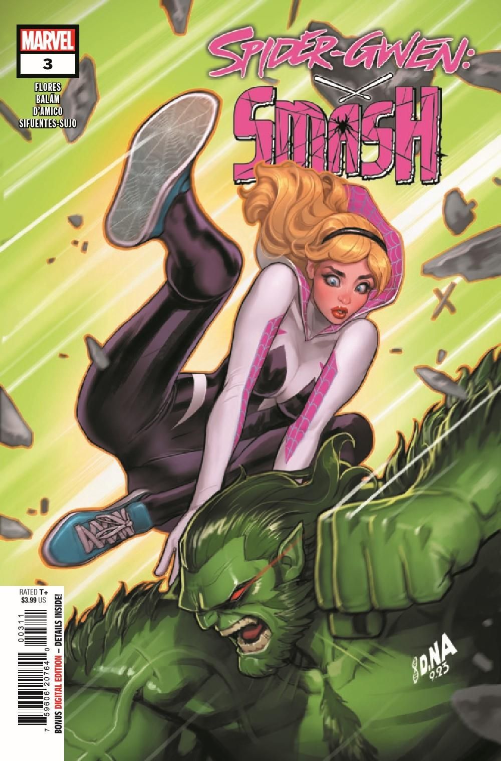 After an amazing concert in Los Angeles, Gwen is hoping for a quiet day off with the Mary Janes, but that is quickly ruined when Dazzler goes missing! Plus the secret origin of Earth 65's HULK is finally revealed!