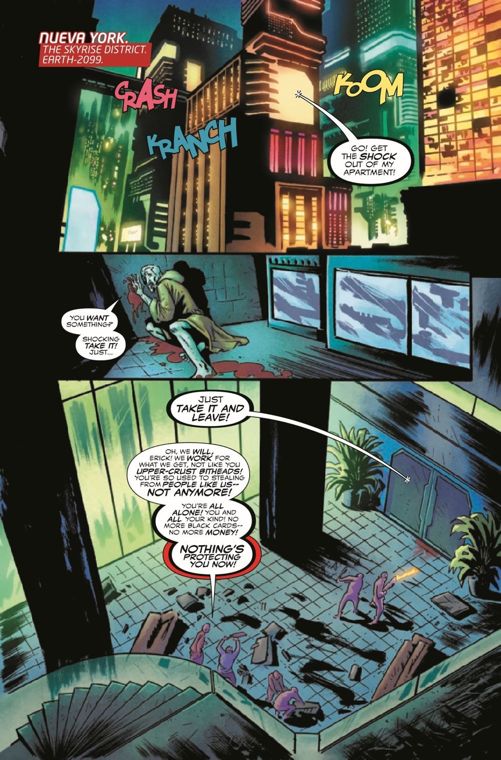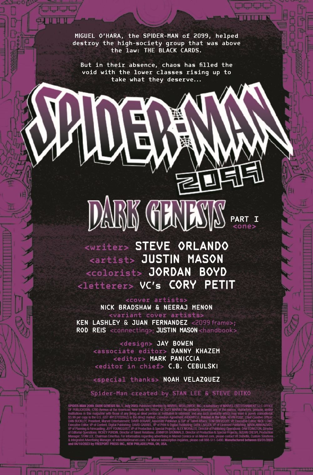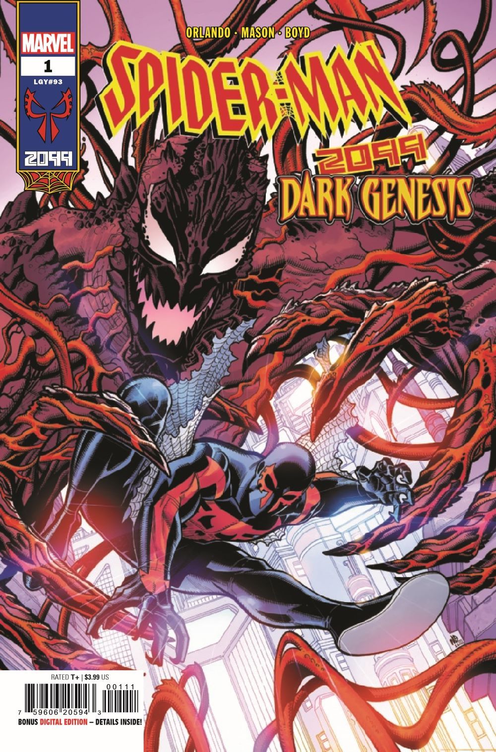 FROM THE SHADOW OF EXODUS…COMES THE DARK GENESIS! MIGUEL O'HARA, THE FUTURISTIC SPIDER-MAN OF 2099, MUST FACE A SINISTER CARNAGE LIKE NEVER BEFORE! As society begins to crumble, SPIDER-MAN 2099 will need all the help he can get - but does the public even want his help? Or do they all just want to watch this world burn? STEVE ORLANDO (SCARLET WITCH, SPIDER-MAN 2099: EXODUS) continues his journey through the future world of 2099, this time paired with bombastic artist JUSTIN MASON (SPIDER-PUNK) - get ready for the debut of the NEW HEROES and VILLAINS that populate the future!