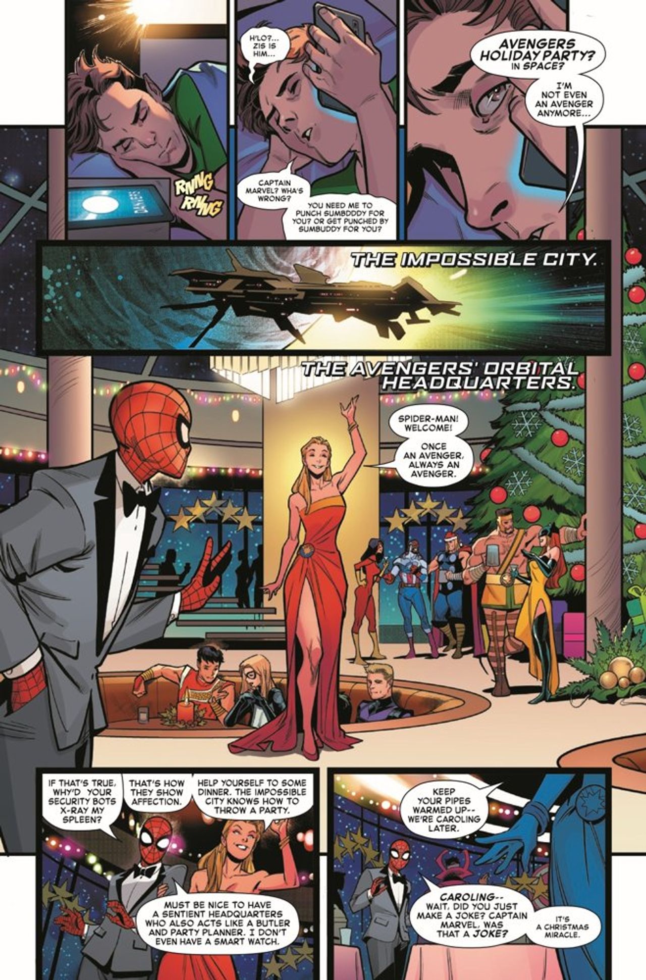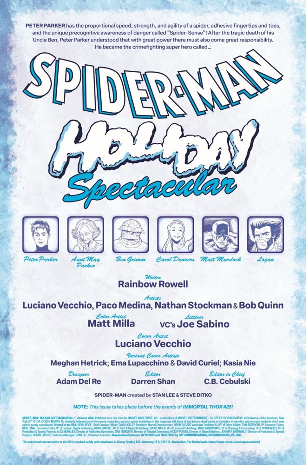HOLIDAY PLANS NO MORE! Peter Parker is all alone for the holidays… Luckily, the Spectacular Spider-Man has some amazing friends he can celebrate with! But can the Fantastic Four, the Avengers, the X-Men, Daredevil and more handle winter with the wisecrackin' Web-Head? Or will the Thing have to send Spidey packing to ensure a silent night? Rainbow Rowell and a bevy of Marvel's finest artists deliver a holiday romp to all the good boys and girls who read magnificent Marvel mags!