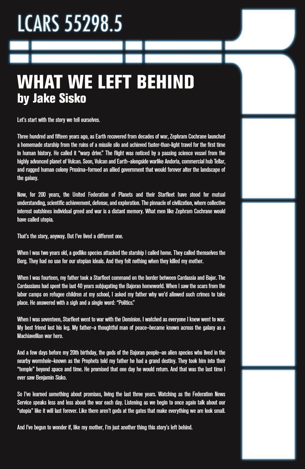 It's stardate 2378, and Benjamin Sisko has finally returned from the Bajoran Wormhole omnipotent—but his godhood is failing with every minute. Sent by the Prophets on a mission to the deepest parts of space aboard the U.S.S. Theseus, he witnesses the unthinkable…