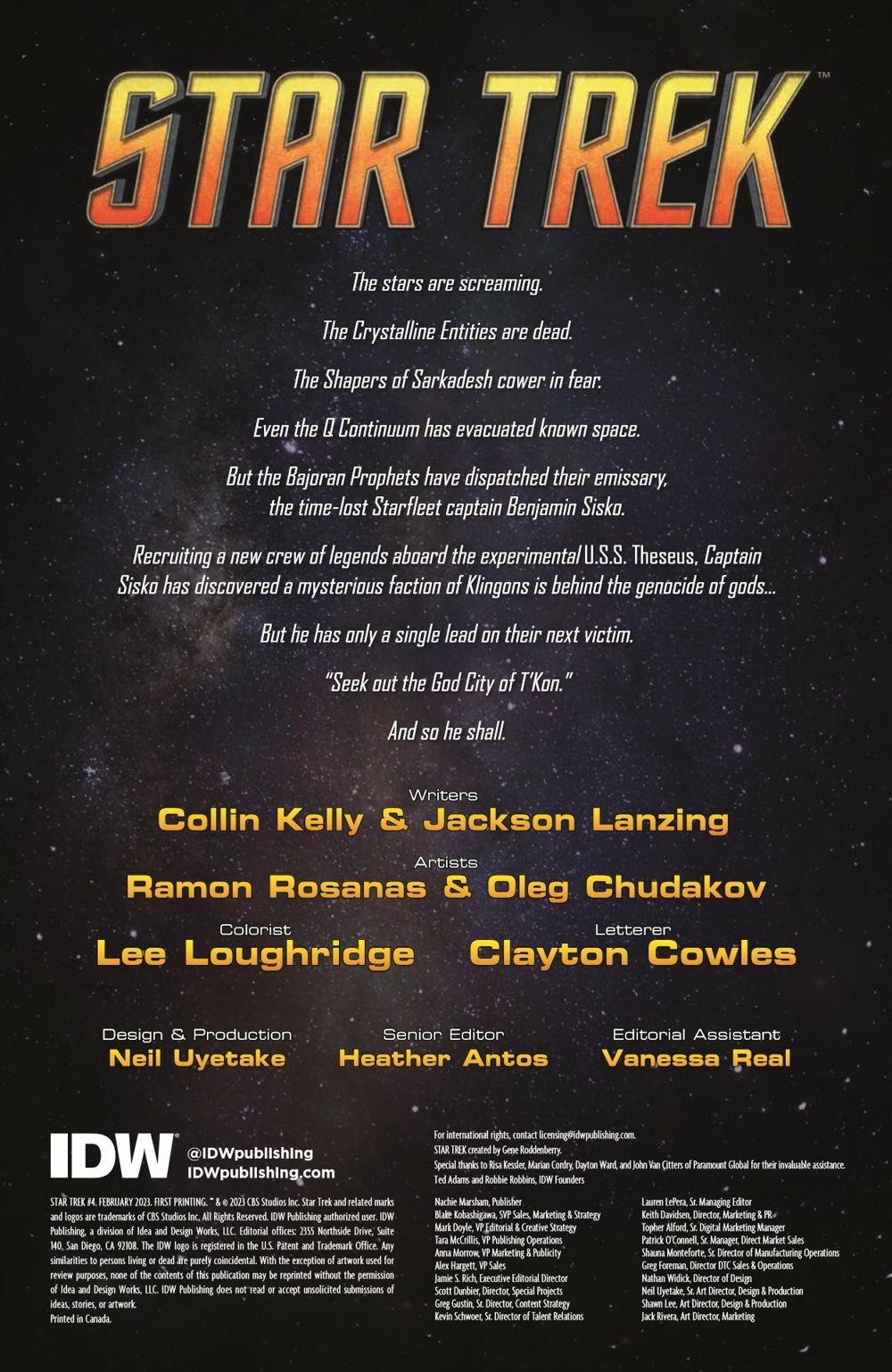 Fueled by an unsettling discovery that makes their mission all the more urgent, the Defiant crew come face to face with the god killer. Written by Star Trek: Year Five duo Jackson Lanzing and Collin Kelly (Batman Beyond, Captain America) and illustrated by Ramon Rosanas (Star Wars), IDW's brand-new flagship Star Trek ongoing series continues the bold adventure.