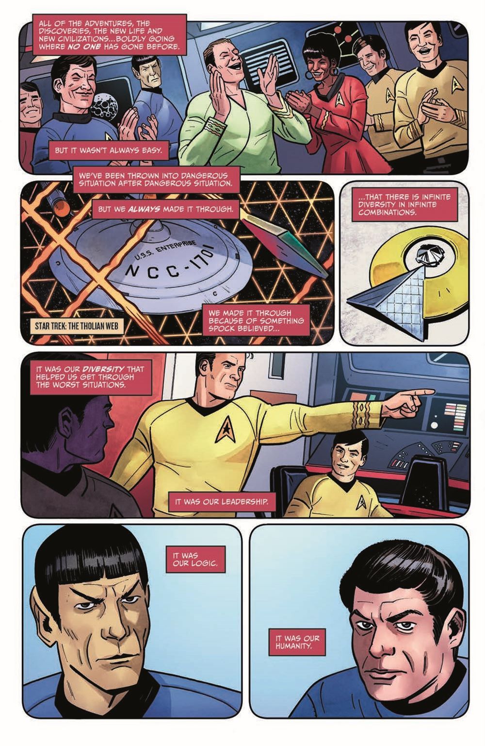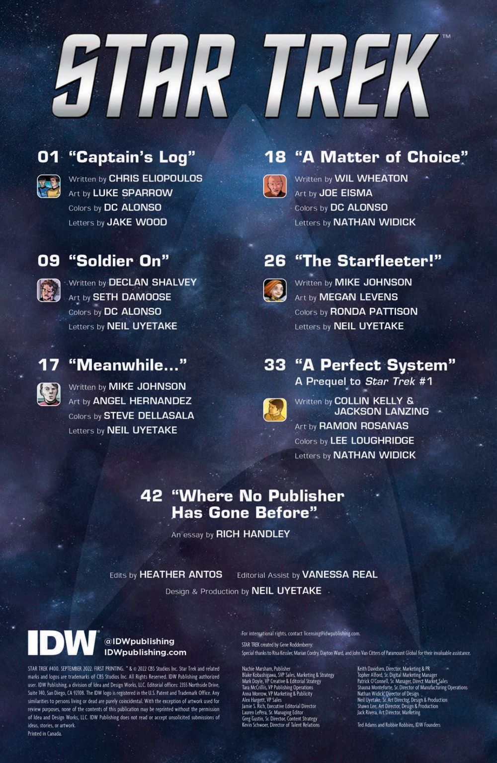 Celebrate IDW's 400th issue of Star Trek comics with this monumental issue highlighting fan-favorite eras of the acclaimed series. This collection of minis brings together Star Trek comics veterans in an equal celebration of IDW's Star Trek comics past and future. Join little Keyla Detmer—as seen in Star Trek: Discovery—Adventures in the 32nd Century #3—on a new expedition, visit the Kelvin Universe, witness a heartfelt tale by TNG's very own Wil Wheaton, and more by Chris Eliopoulos, Declan Shalvey, Rich Handley, and Mike Johnson, with art by Luke Sparrow, Seth Damoose, Megan Levens, Angel Hernandez, and Joe Eisma. Plus, don't miss out on the prelude to IDW's brand new Star Trek ongoing series written by Jackson Lanzing and Collin Kelly with art by Ramon Rosanas!