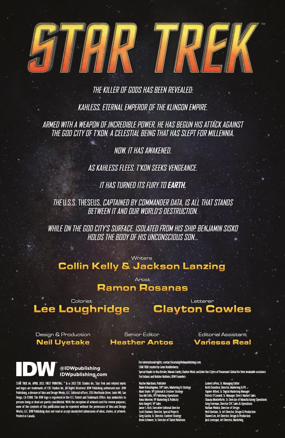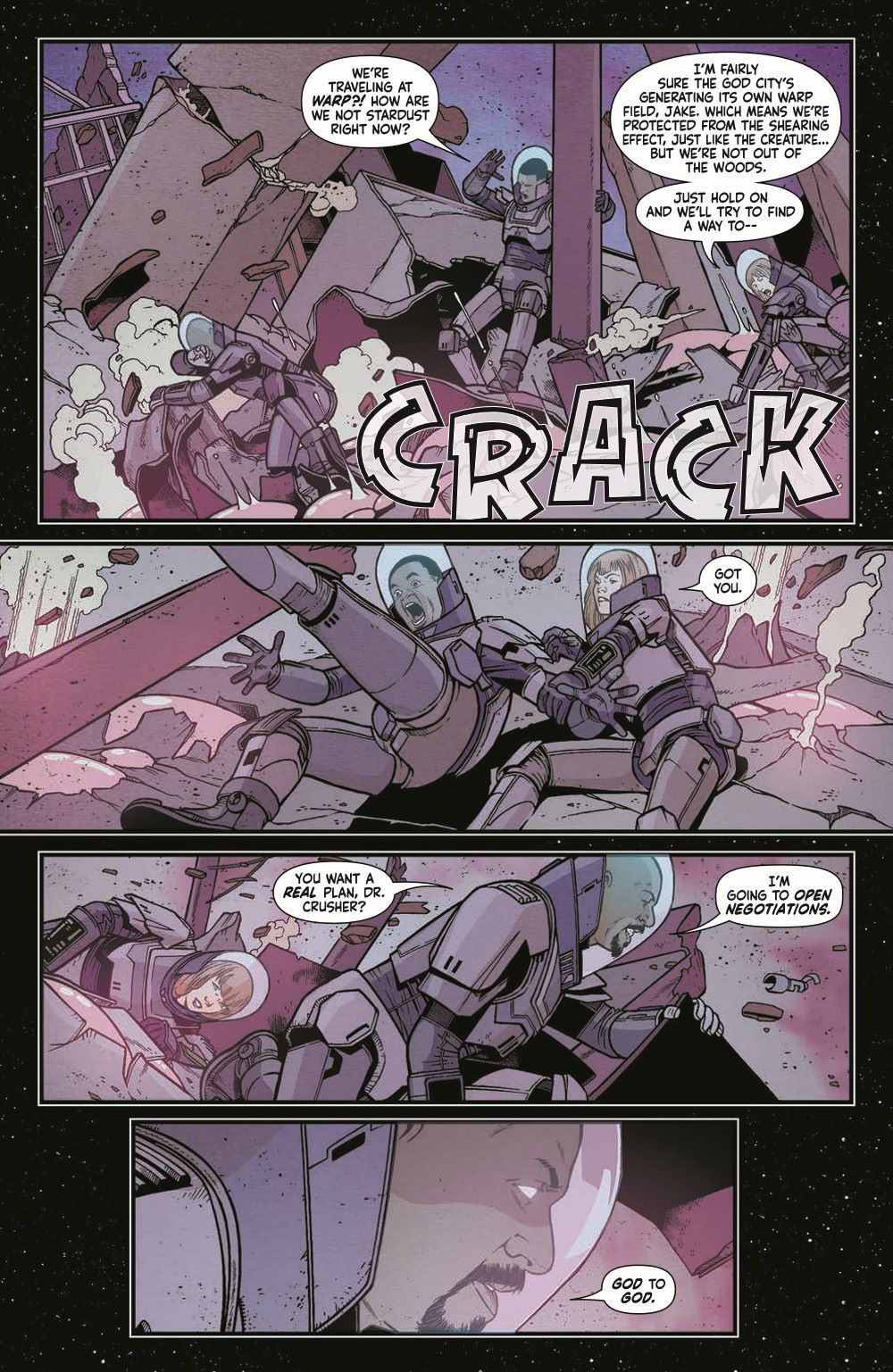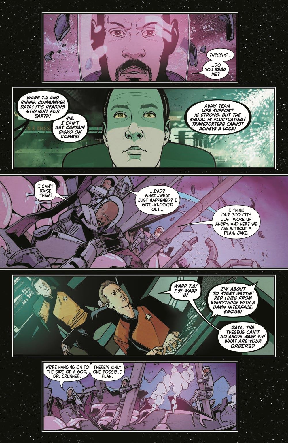 Chaos ensues as the God City sets out on a collision course for Earth! Inside the living city, Captain Sisko and Dr. Crusher face off against the cosmic being wearing the ancient city as armor. Meanwhile, Lieutenant Commander Data pushes the Theseus and its crew to their limits in trying to keep up with the being zooming across the quadrant. But where do ants stand among giants?