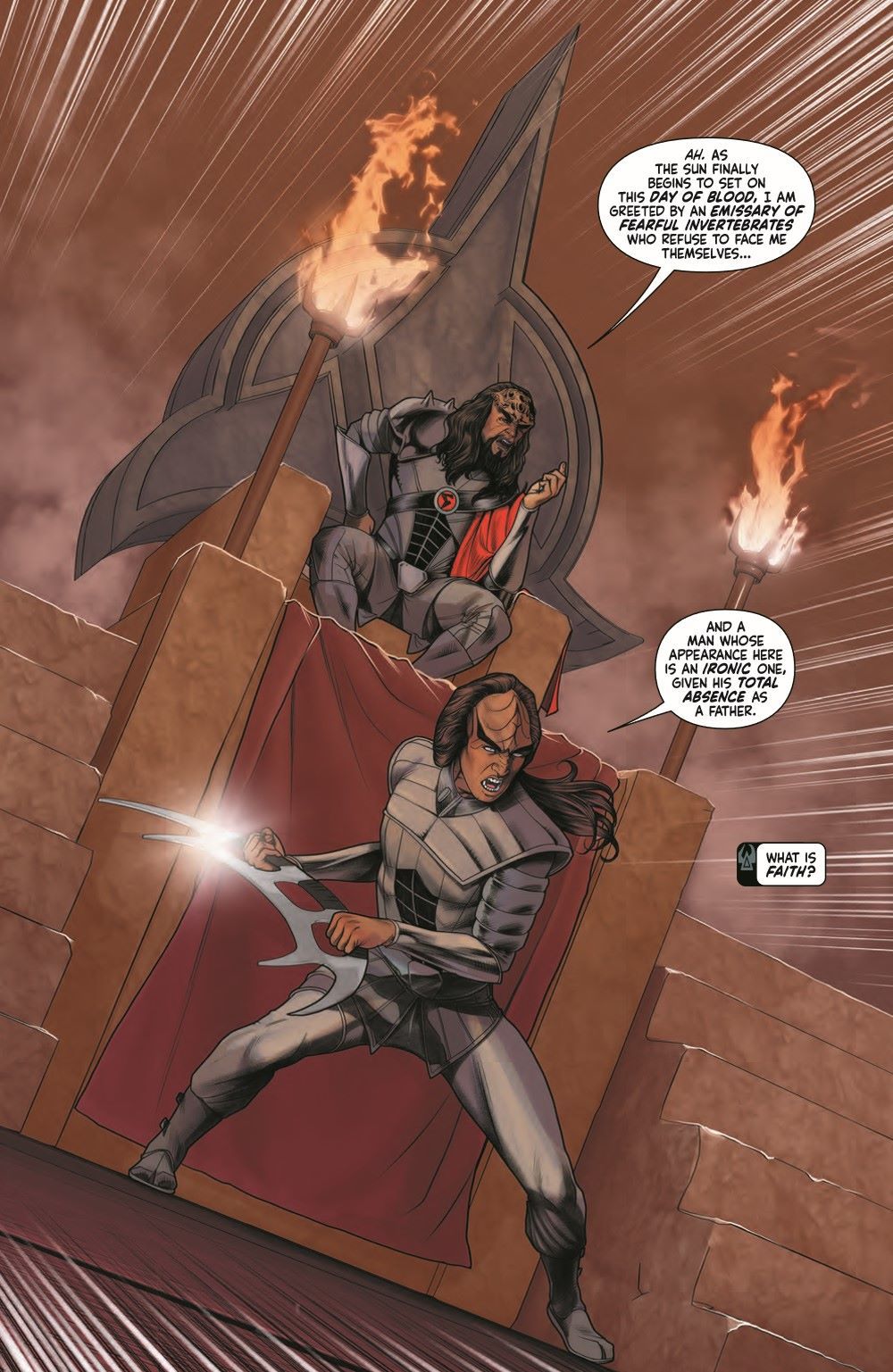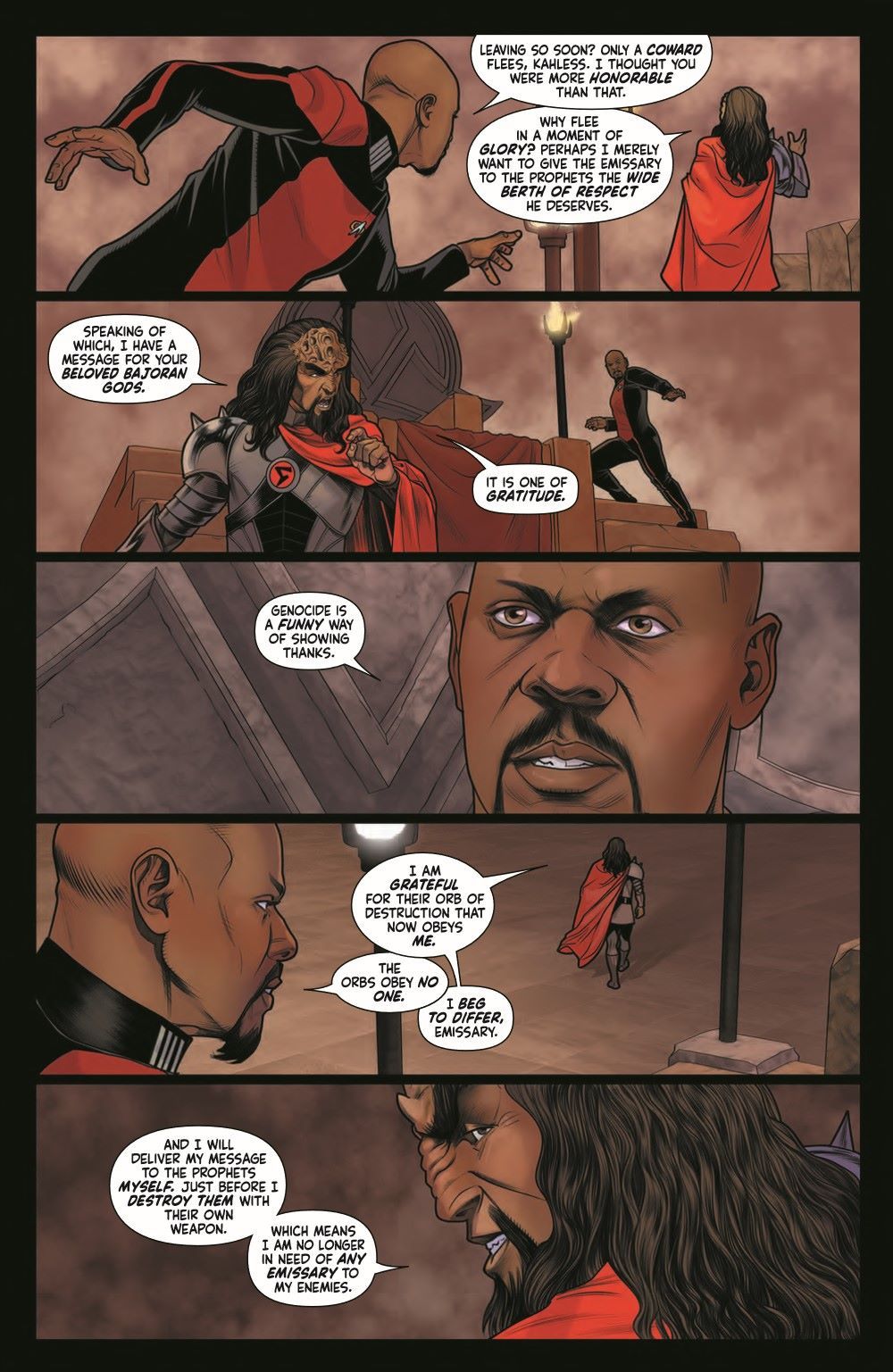 Part four of DAY OF BLOOD begins here! Thousands of years ago, Kahless the Unforgettable led his people to glory and raised an empire of honor. But his clone, Kahless II, has gone too far, murdering innocents in cold blood and hungering for power that can no longer be sated by Qo'noS and the Klingon people. He now stands alongside Alexander in front of Worf and Sisko, pitting father and son against each other and making a mockery of the Bajoran Prophets and their emissary. Meanwhile, the power of the Orb of Destruction surges from his ship above. Can Kahless be stopped, or will he once again prove to be the greatest warrior of them all?