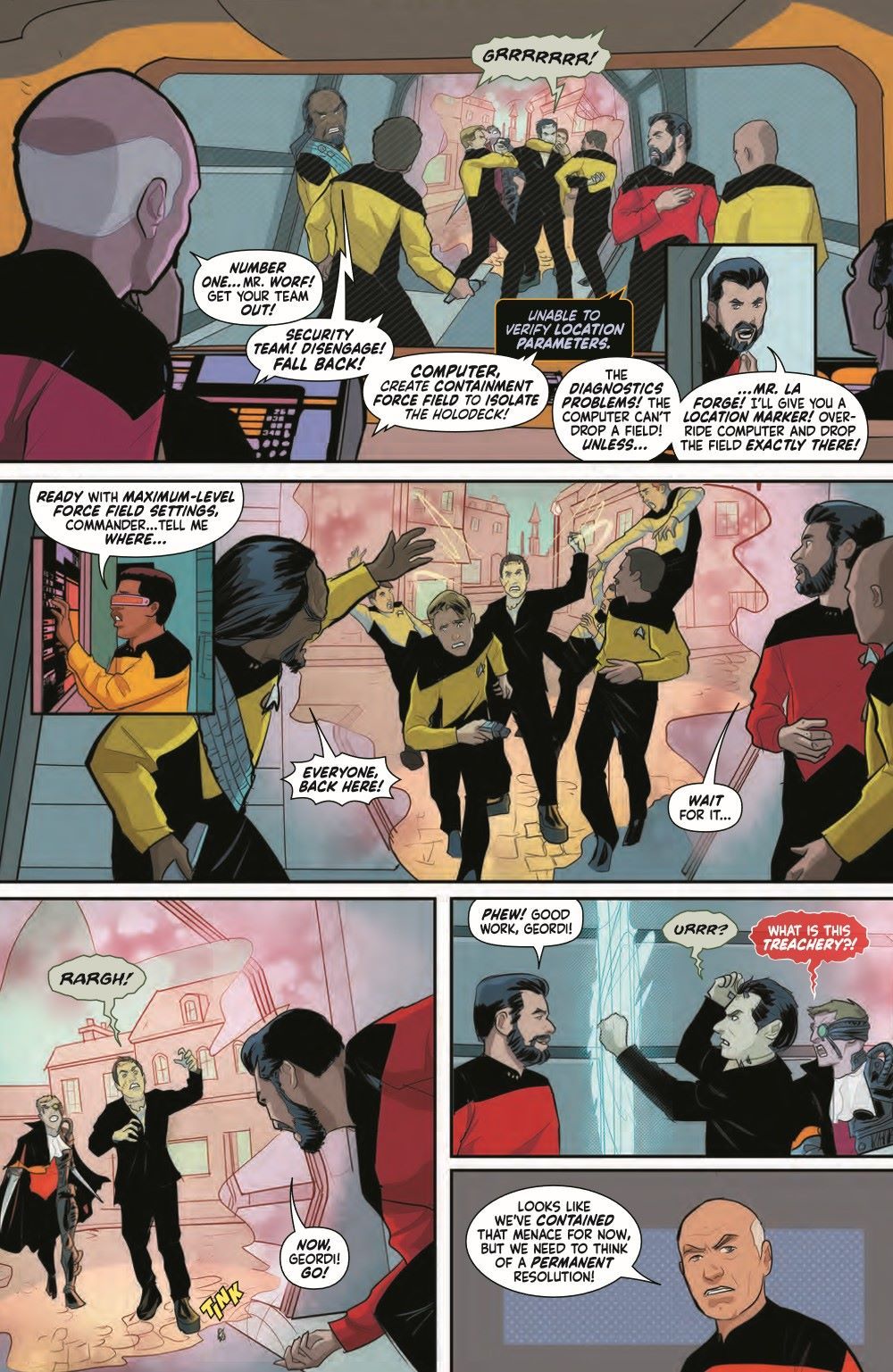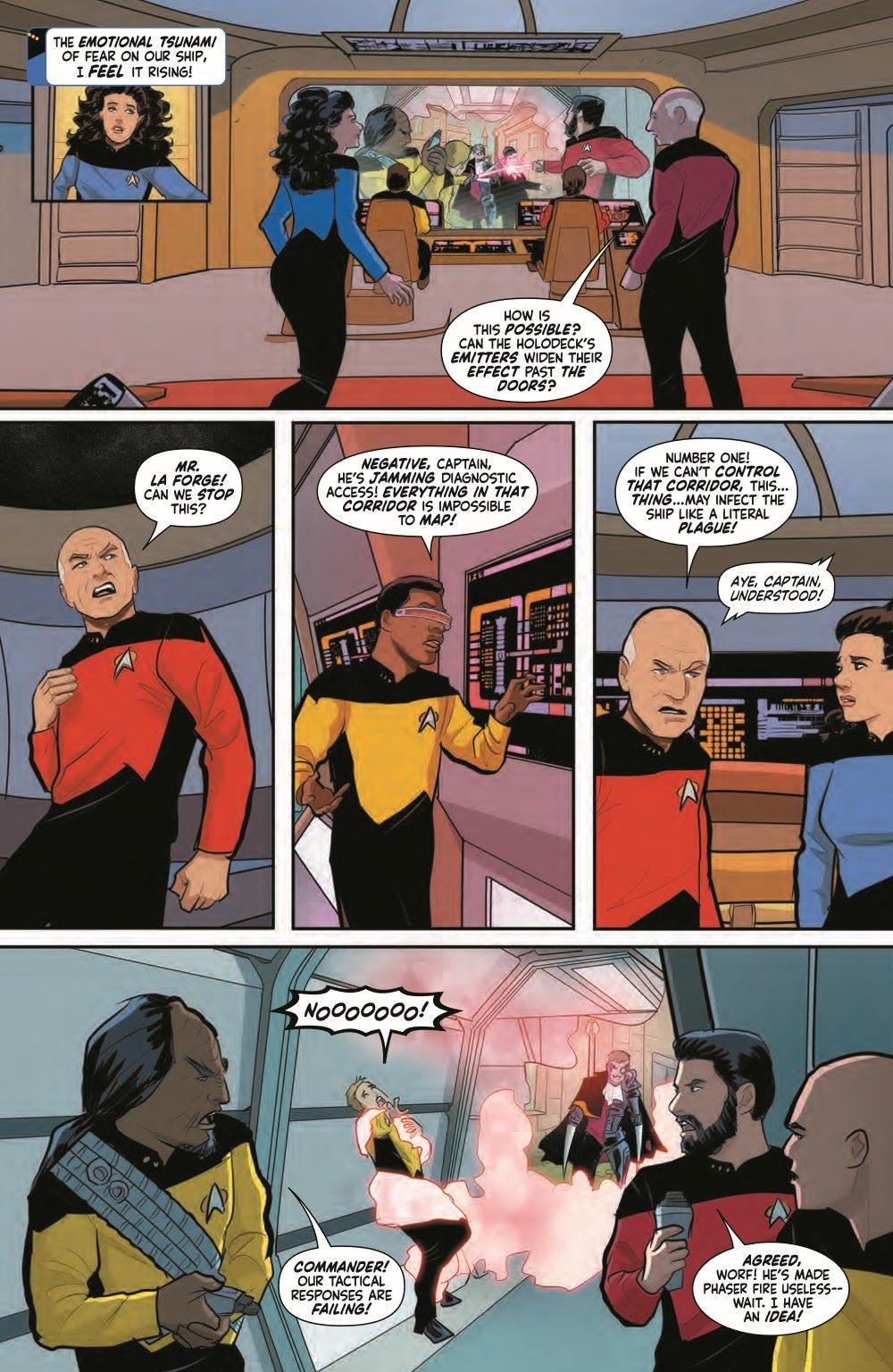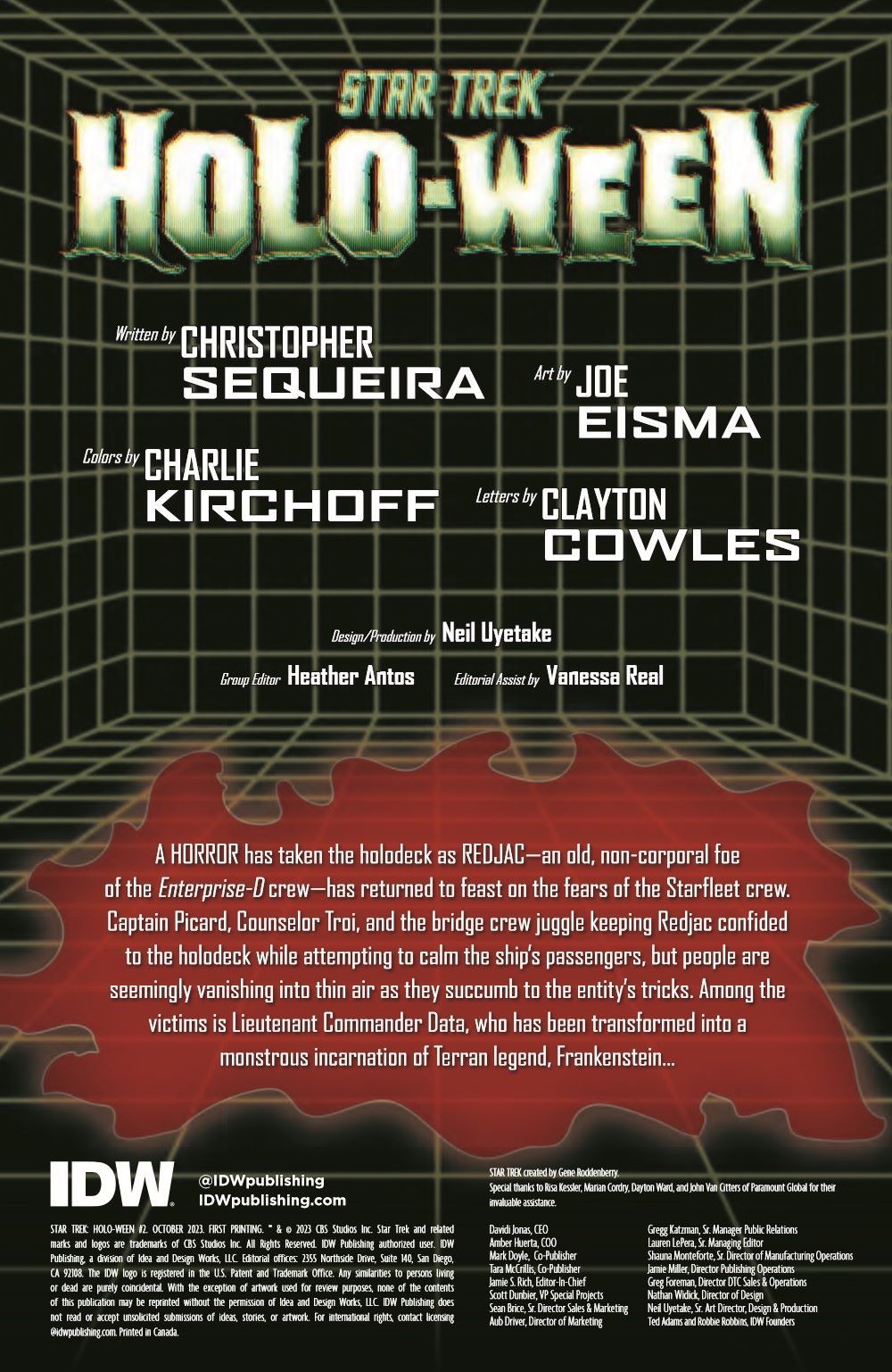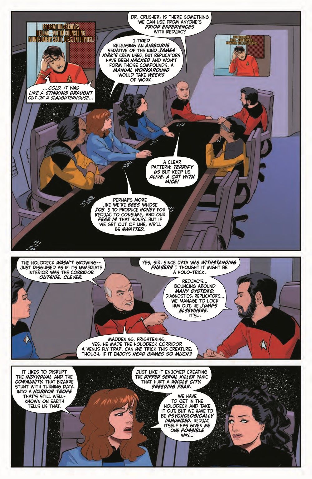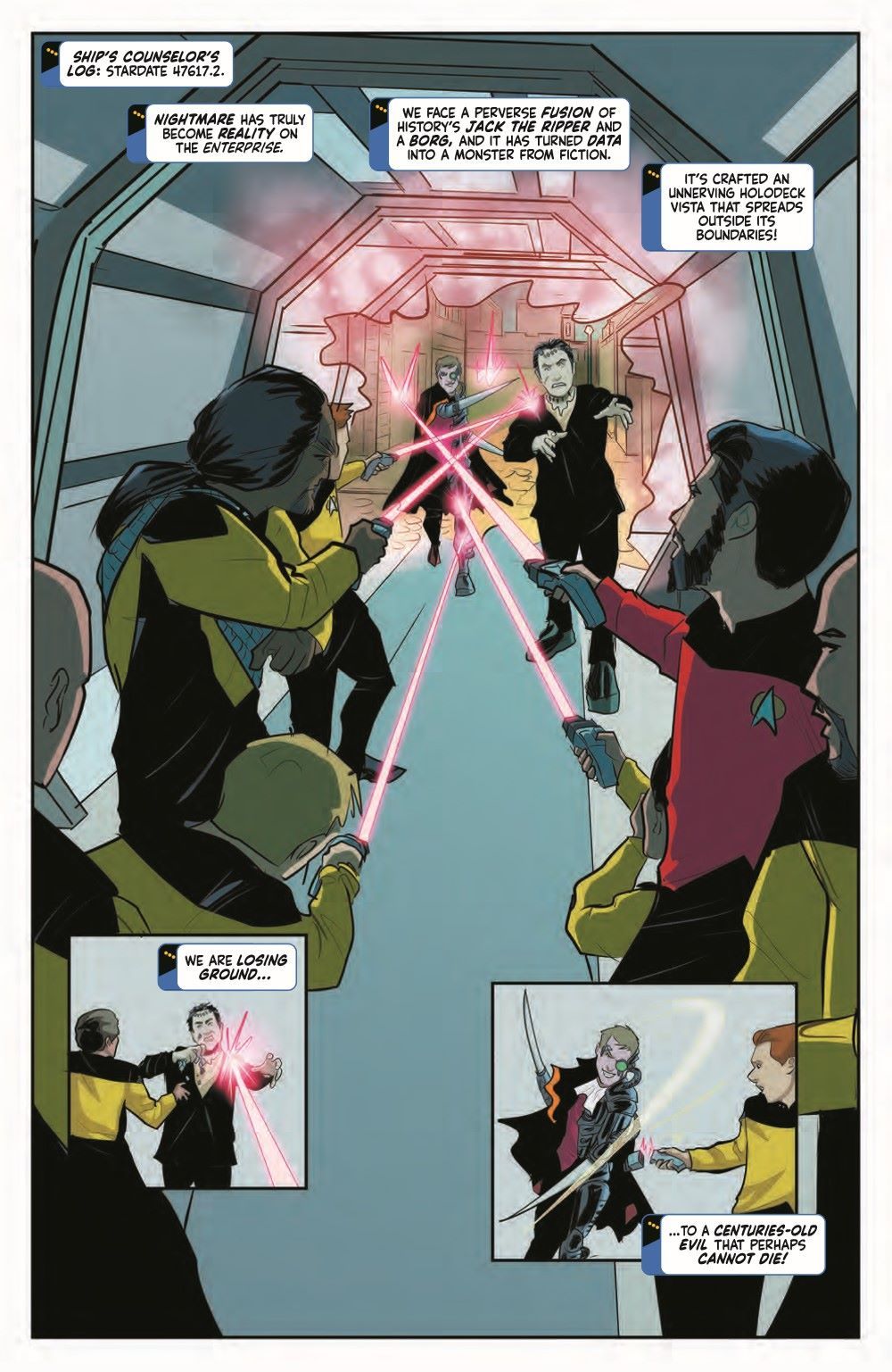 The exciting weekly Star Trek horror event continues through all of October! Redjac—posing as JACK THE RIPPER—has infiltrated the Enterprise-D and taken control of the holodeck, luring unsuspecting victims and feeding on their fear. Not to mention Redjac has turned Data into a monstrous incarnation of Frankenstein. With more and more crewmates falling victim, Captain Picard and his crew decide to fight fear with fear and turn themselves into classic Terran monsters to confront Redjac.