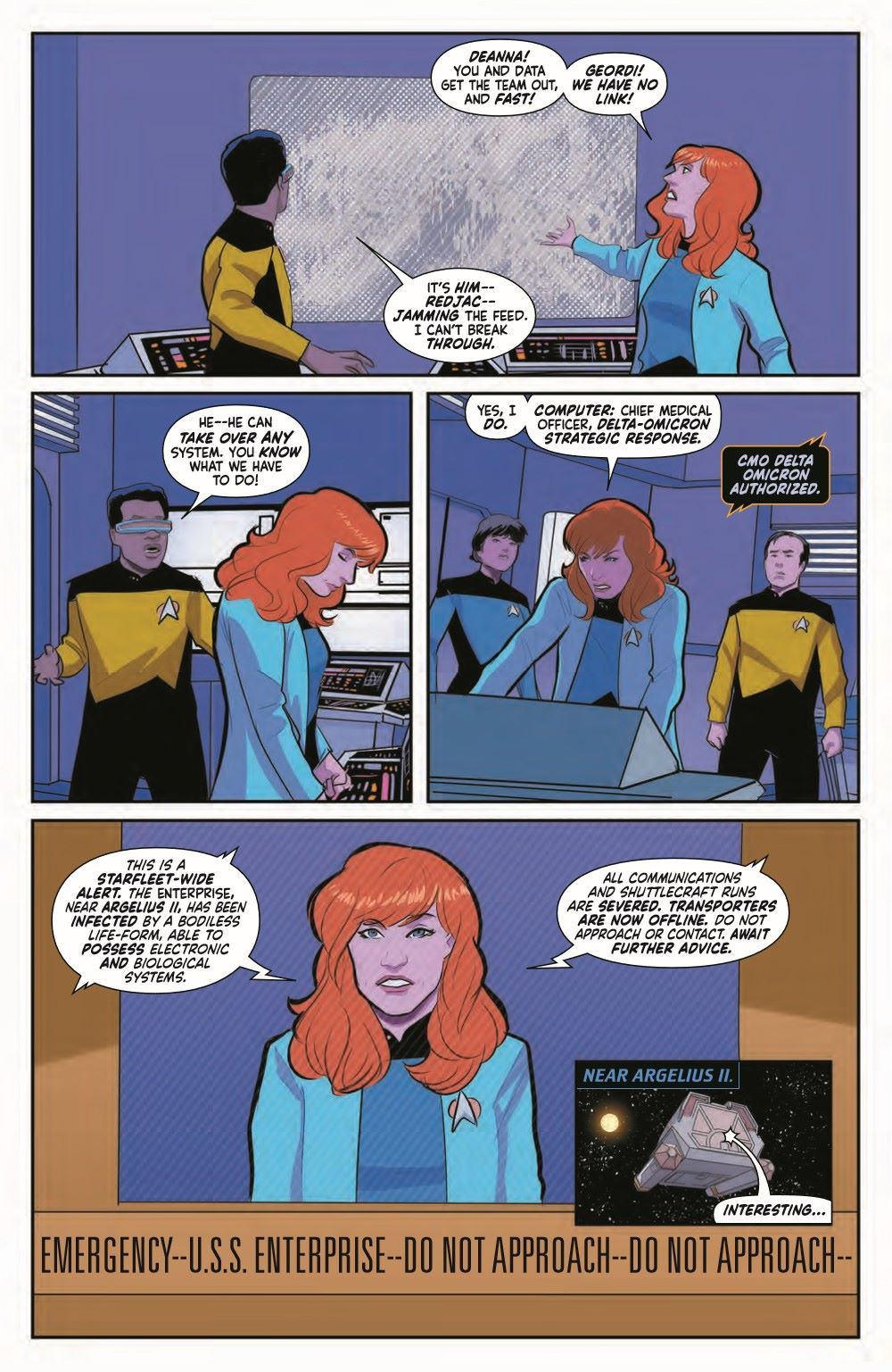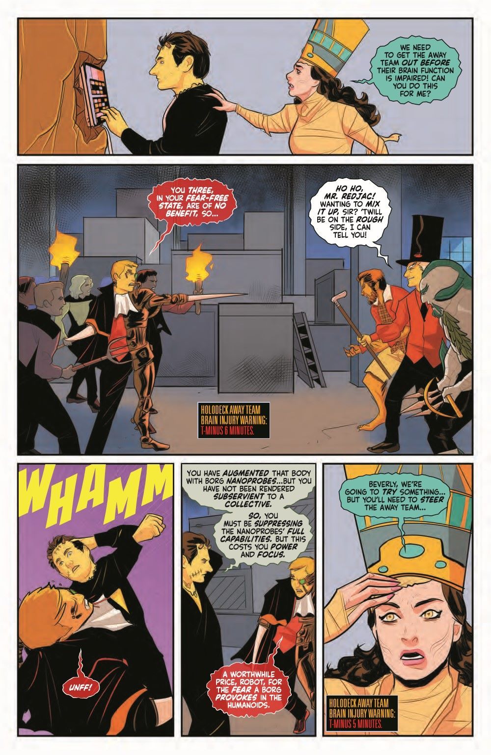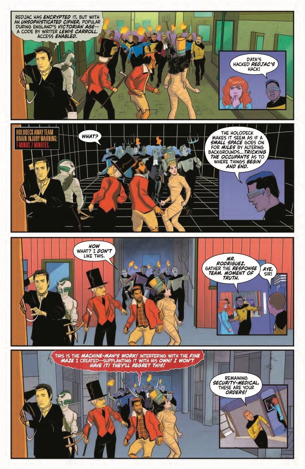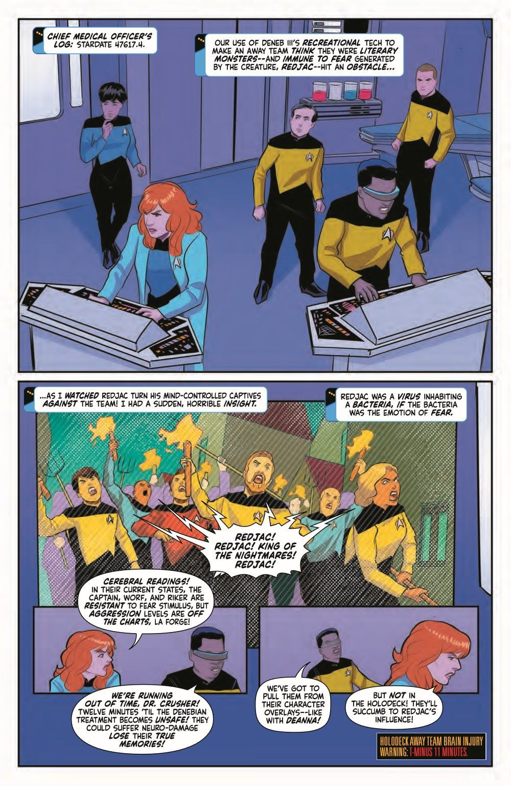 The fight for the holodeck is on! The Halloween "away" team, consisting of Troi as the Mummy, Riker as the Werewolf, Picard as Mr. Hyde, and Worf as an amphibious Klingon Mkr'an, are being chased by a mob of crazed Redjac-controlled crew members. Meanwhile, Dr. Crusher and Commander La Forge monitor their crewmates' neural outputs in a frantic attempt to keep them from entering irreversible states of psychoses and fully integrating with their monster personas.