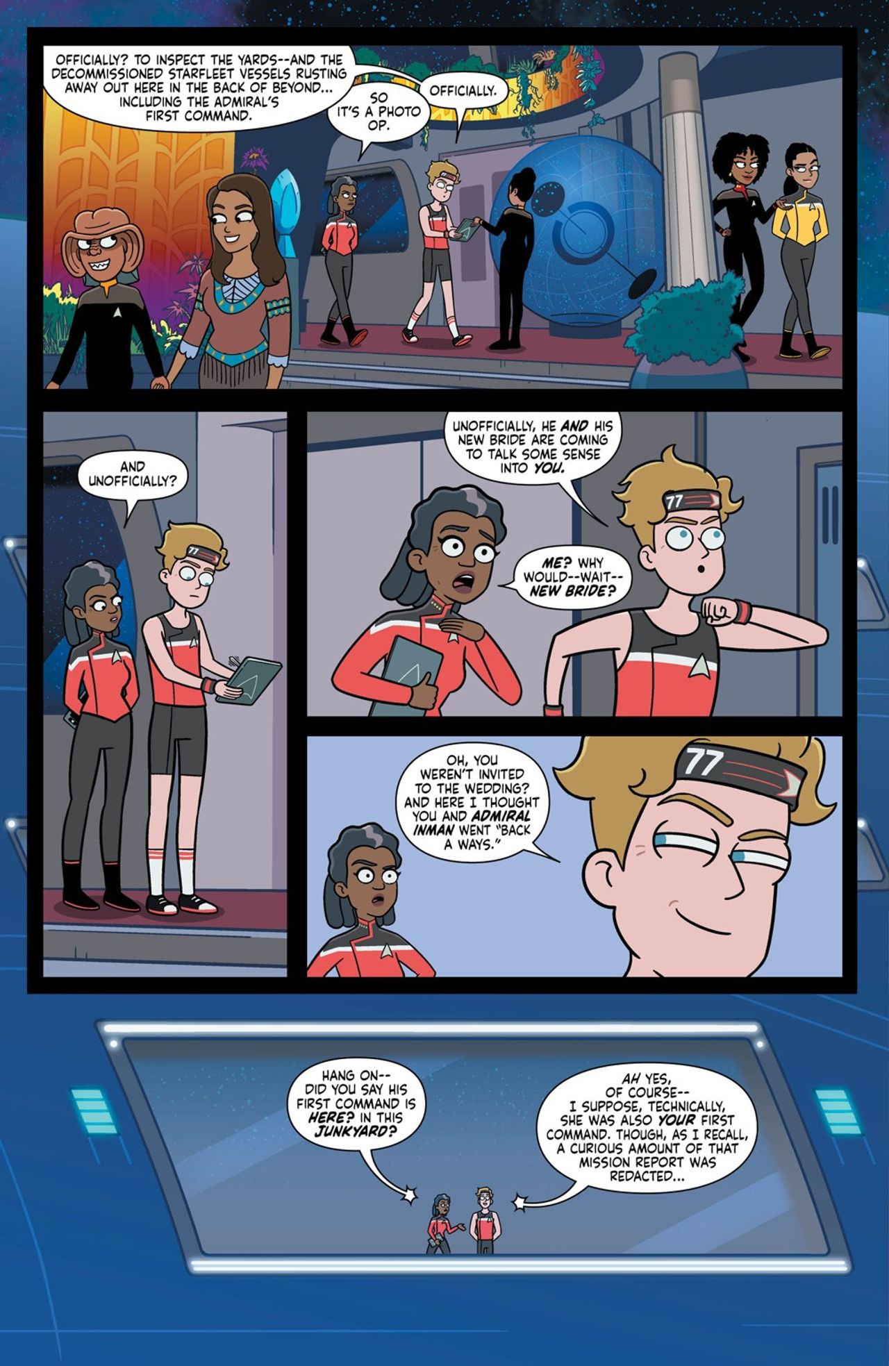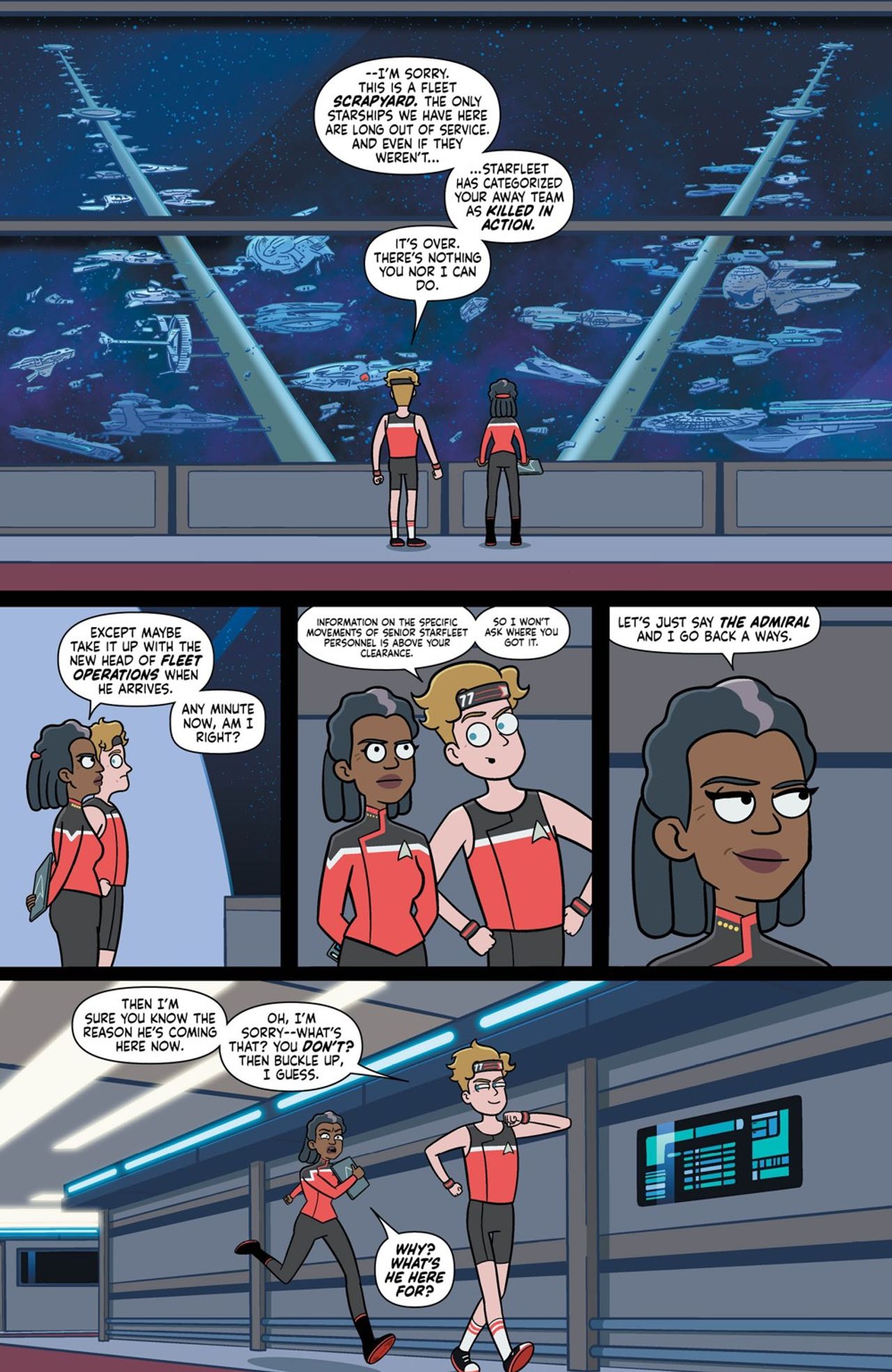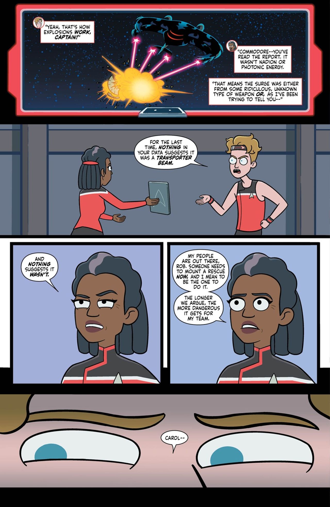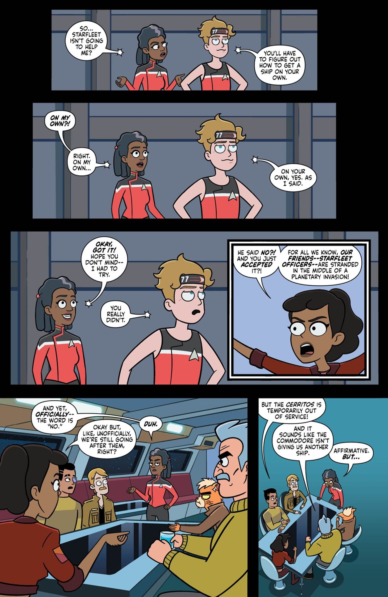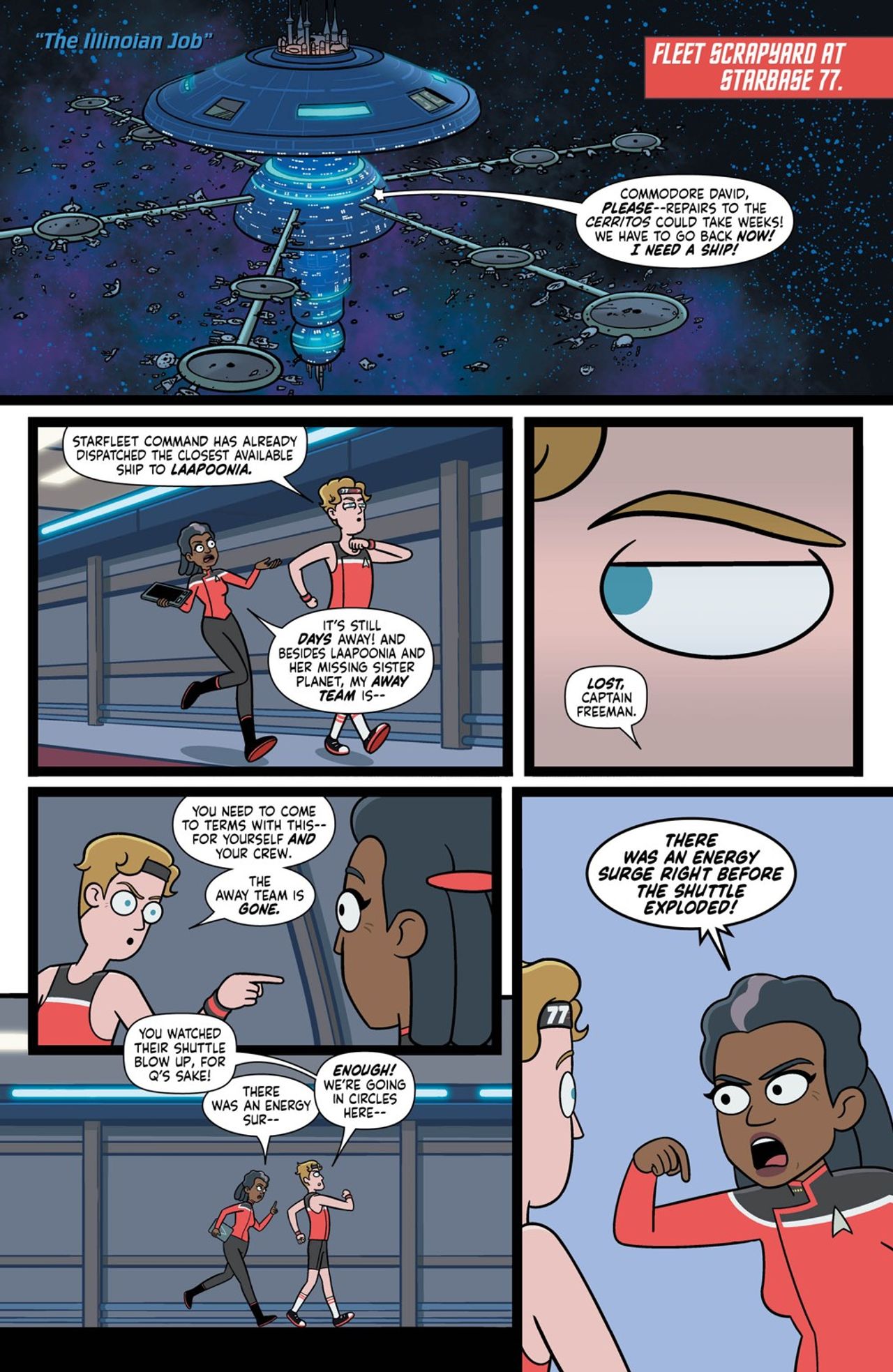 Just as the case of the missing Laapeerians was about to come together, the Cerritos was heavily damaged in a dogfight against an unidentified vessel and forced to return to Federation space…without the away team. Repairs on the Cerritos are bound to take weeks, but Captain Freeman and Mariner aren’t about to sit around and wait when they have an abandoned away team to rescue—especially one under Boimler’s command. Together, they formulate a heist to steal a decommissioned starship and mount a daring rescue before their unknown assailants blast Laapoonia, and their crew members, away.