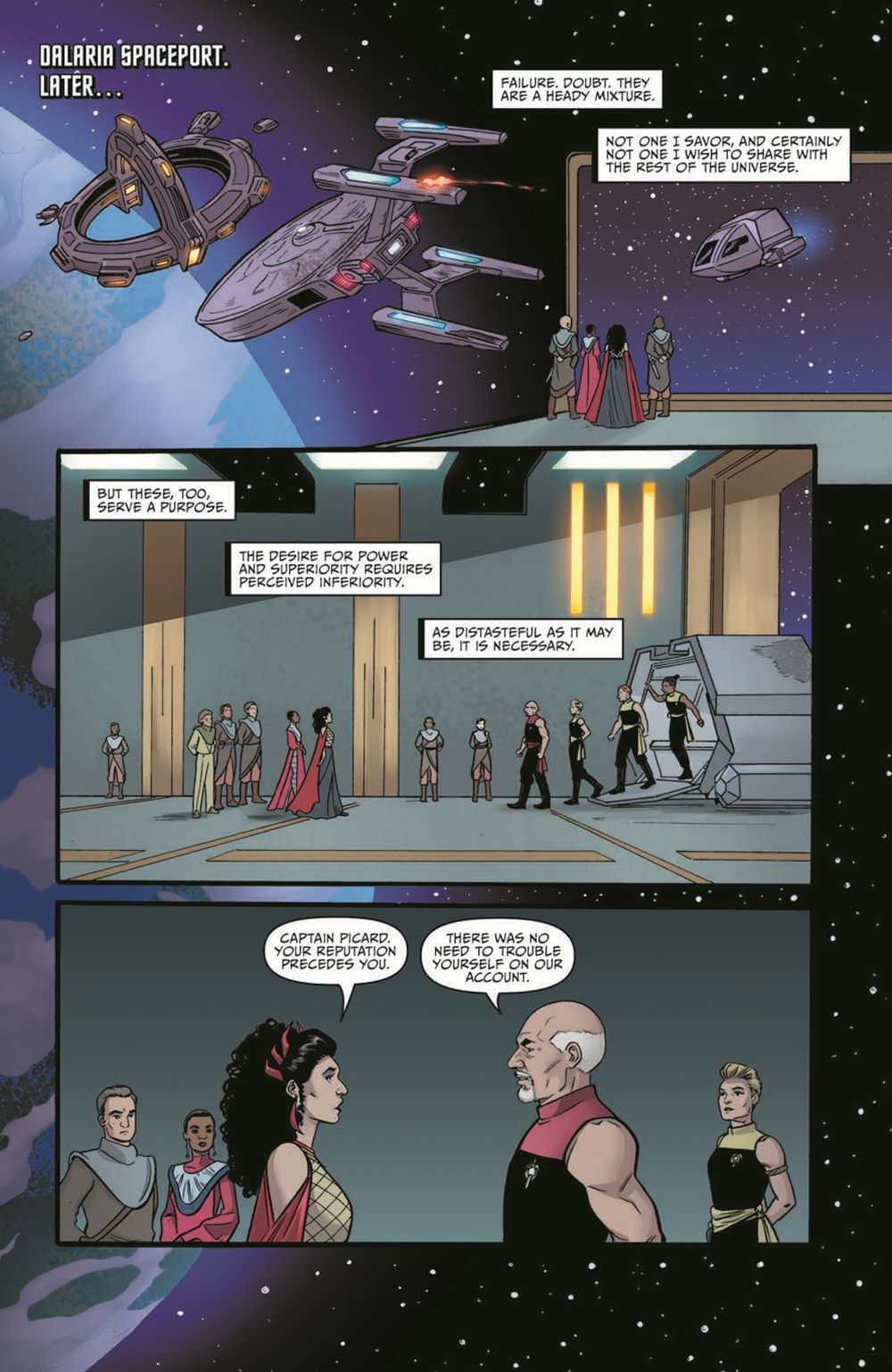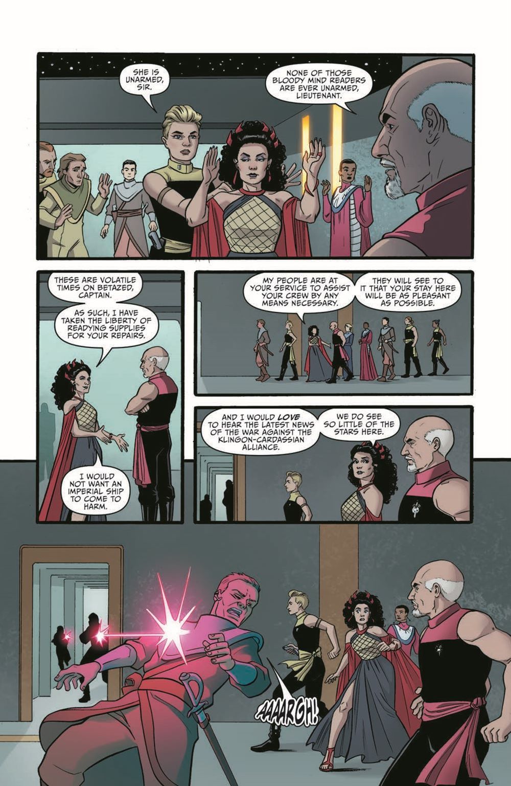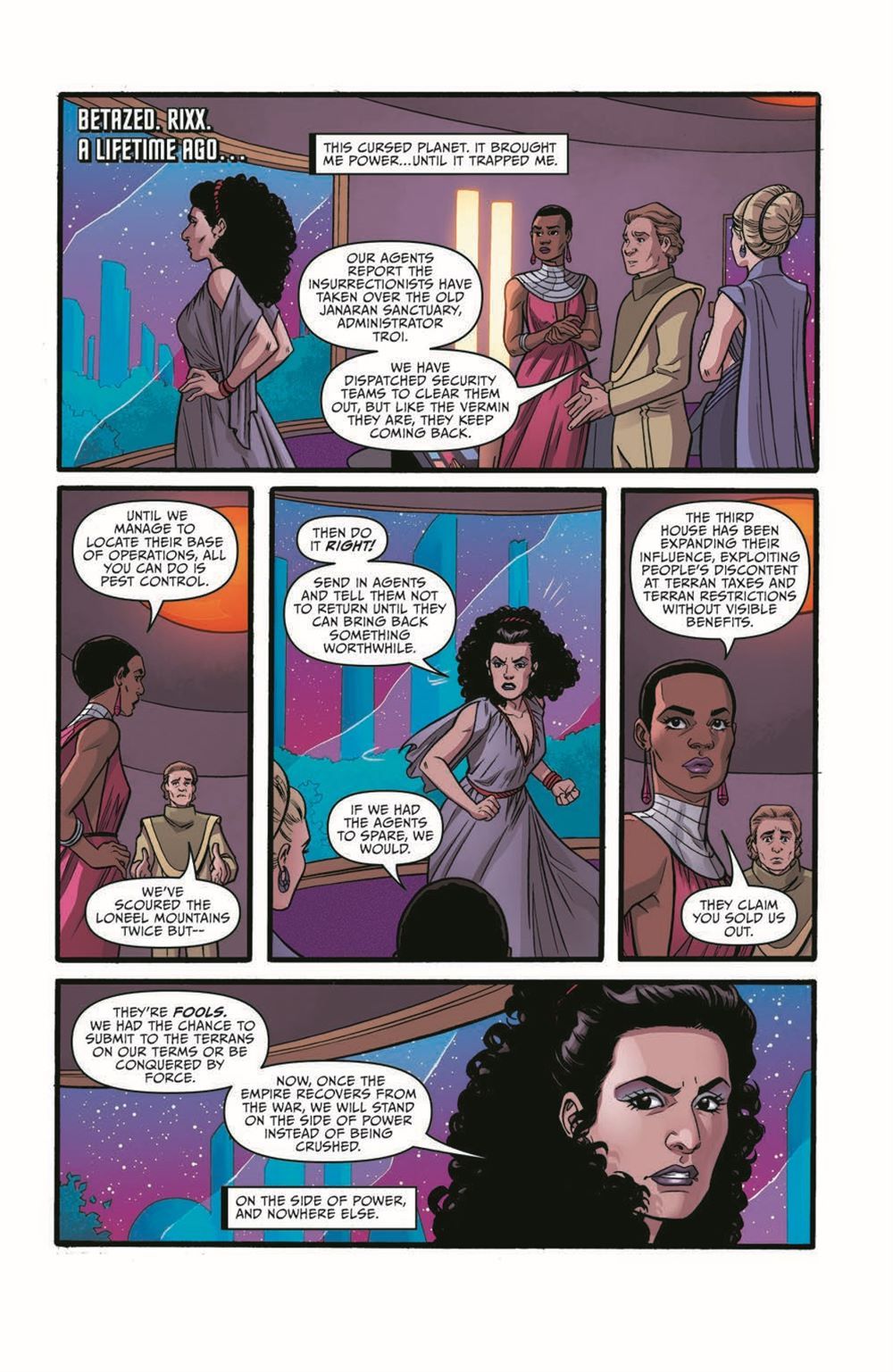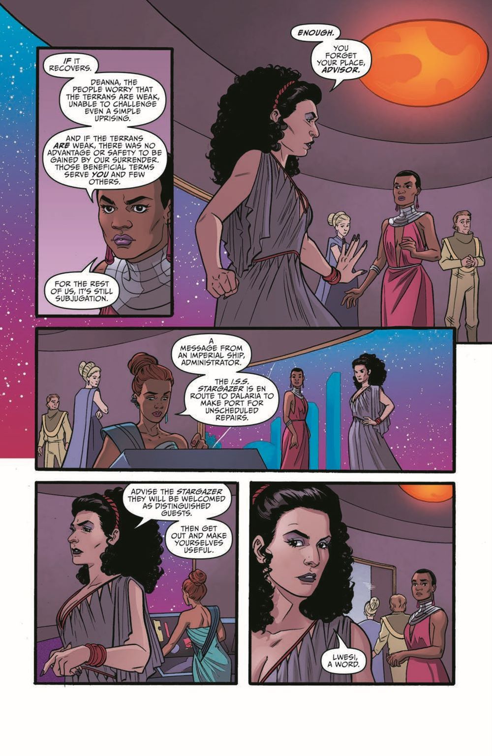 The spotlight turns to Deanna Troi in this one-shot set in the Mirror Universe of The Next Generation. Expand upon the world of The Mirror War! At the turn of a new dawn for the Terran Empire, having achieved victory over the Cardassian-Klingon Armada, Deanna Troi reflects on just how far her ambition has driven her on her calculating quest to seek power and escape among the stars.