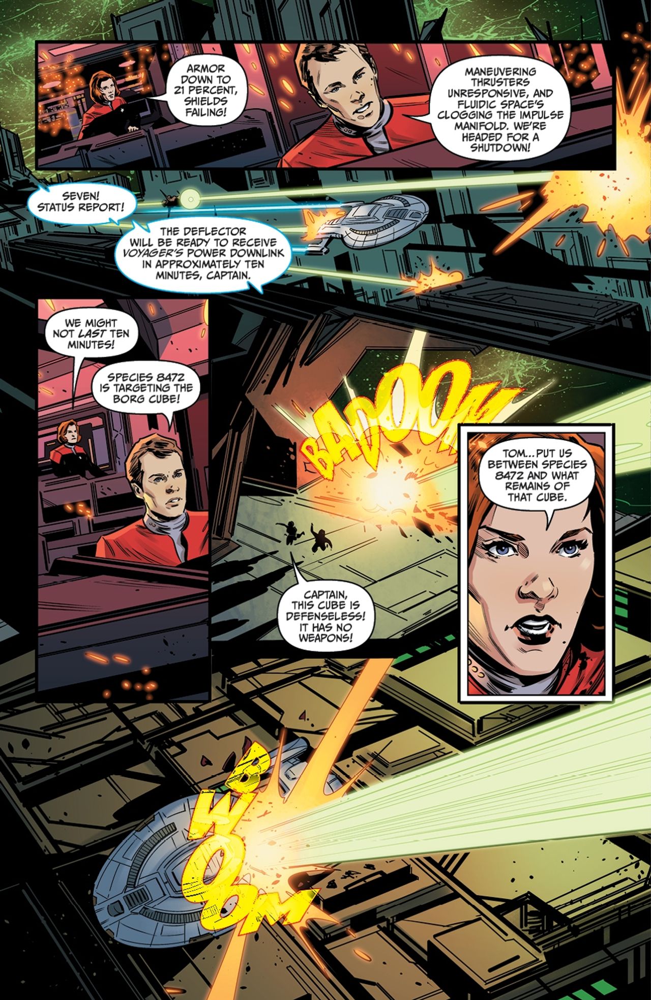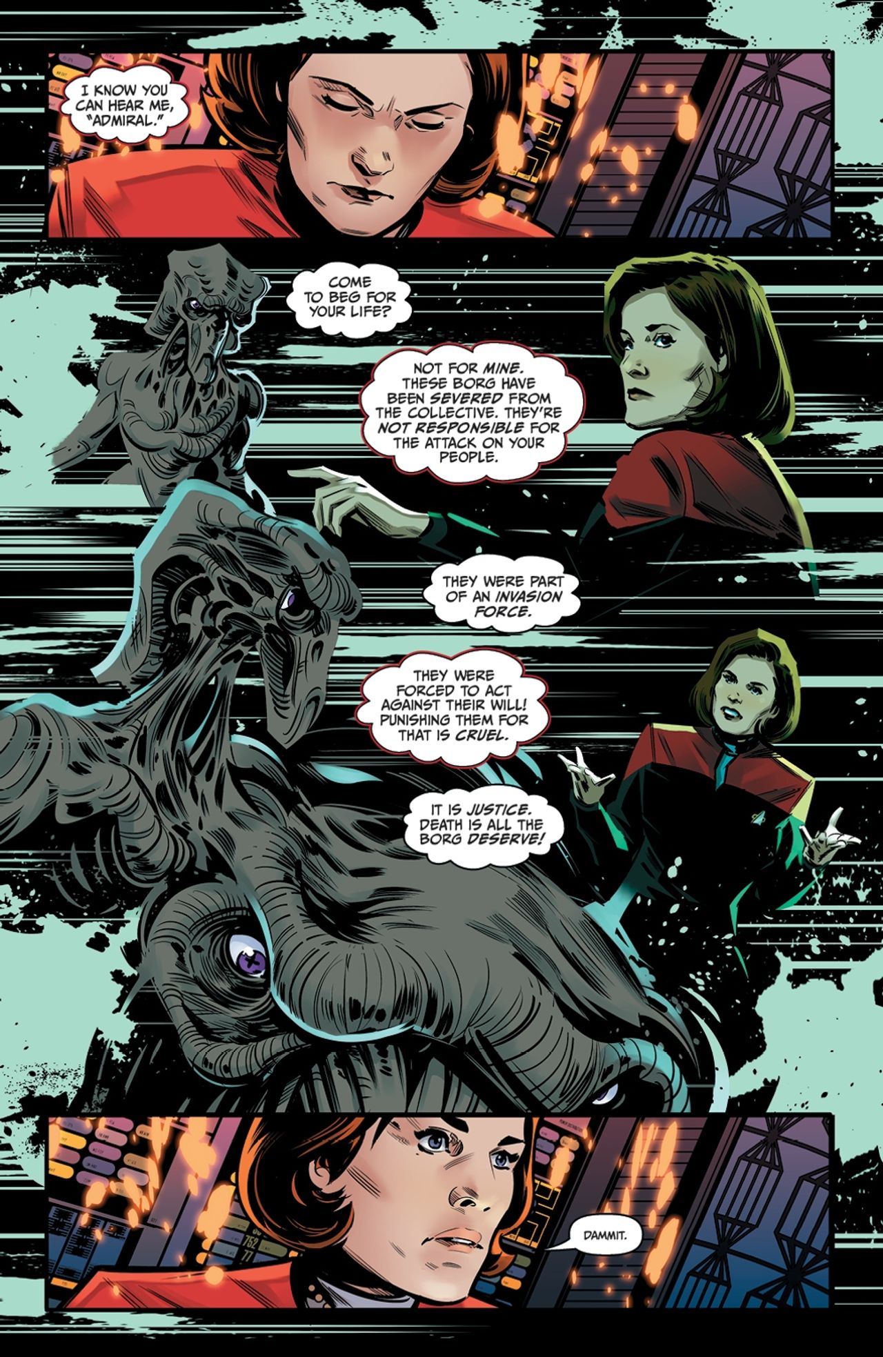 Stuck between a rock and a hard place, Captain Janeway and the Voyager crew agree to ally with a collection of Borg deep in fluidic space, and Seven plunges into the collective. They may be Borg, but there’s something…strange about them. Something alluring. Especially when it comes to a particularly individualistic member, Nine. Together, Nine and Seven might be able to build a deflector and help their crew members escape back to normal space—but that’s assuming they stay hidden from Species 8472 bent on their elimination.