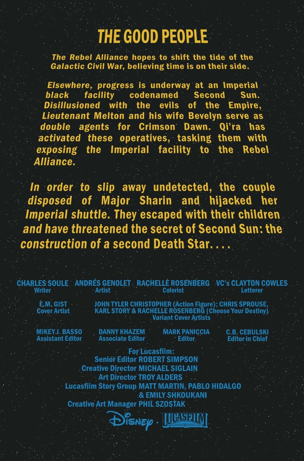 "The Good People"! The Empire's greatest secret is in the hands of two Crimson Dawn double agents, who are racing to deliver it to the Rebel Alliance to buy themselves safe haven. But the Empire knows what they have stolen, and the entire Imperial Navy is in hot pursuit!