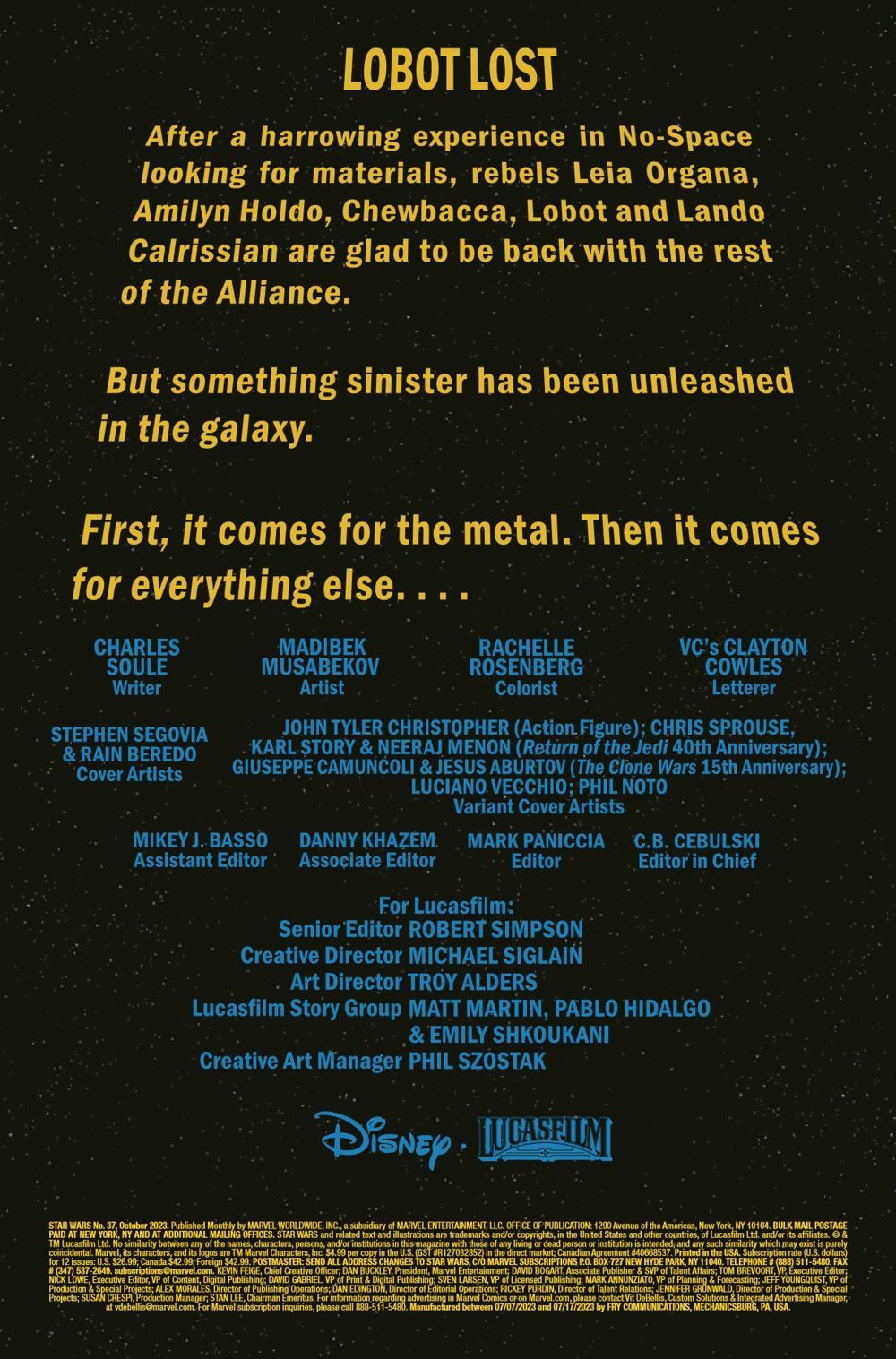LOBOT LOST! - A DARK DROIDS TIE-IN! Something has gone horribly wrong with LOBOT, putting the REBELLION at terrible risk! LANDO CALRISSIAN will do anything to save his friend, even if it means betraying the REBELS. Will the SCOURGE OF THE DROIDS destroy any chance to cure Lobot, or will he be lost forever?