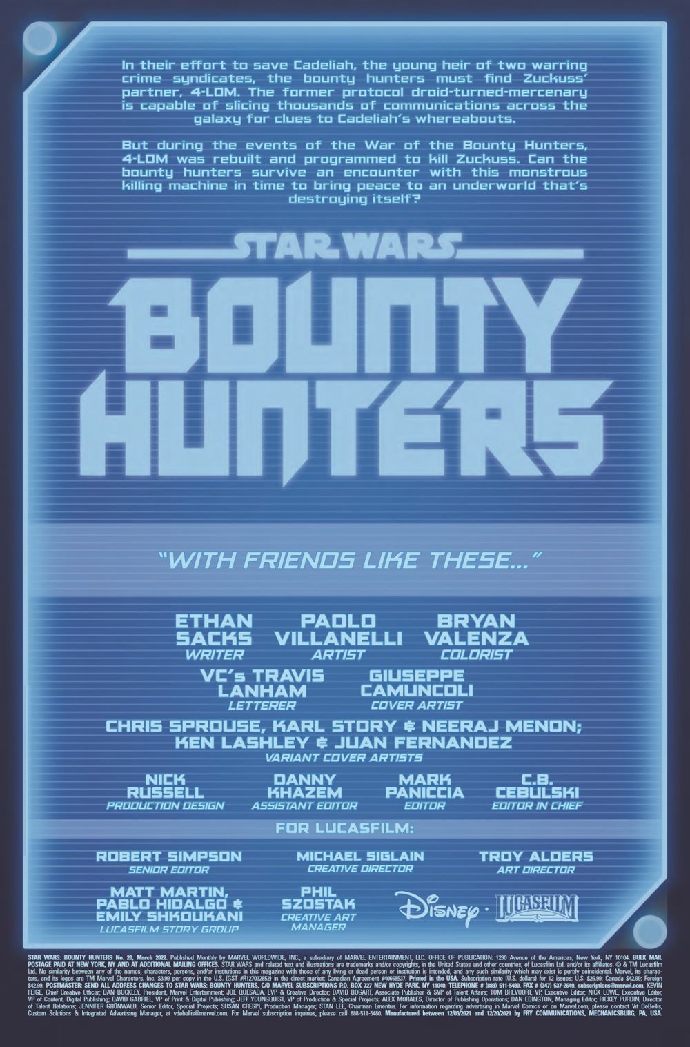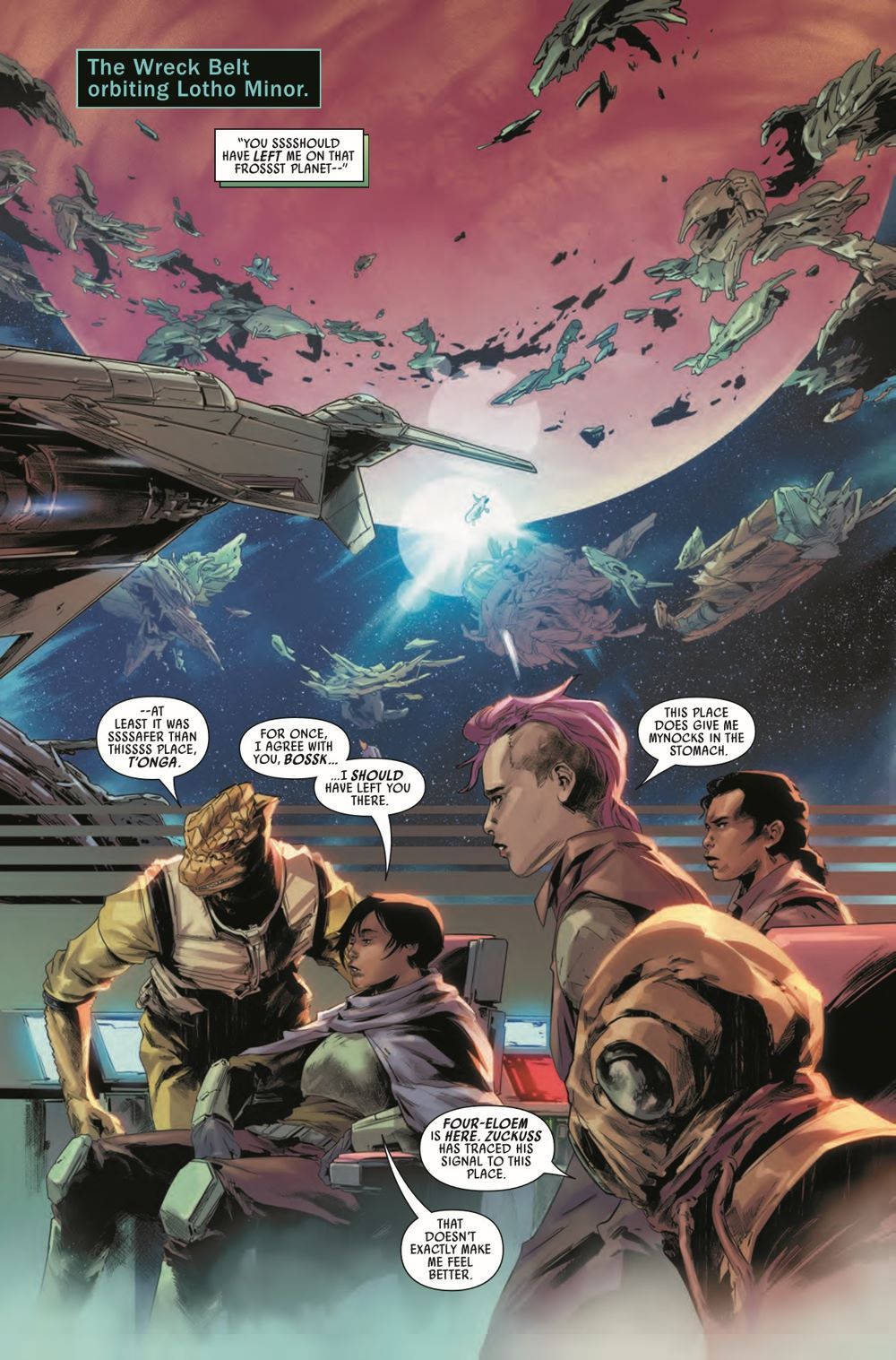 FORLORN FOR 4-LOM! T'ONGA and her bounty hunters are desperate to recover 4-LOM for their mission...but the upgraded killer droid is the one hunting them aboard a ghost ship. Can ZUCKUSS survive a reunion with his onetime partner? Meanwhile, VUKORAH makes her move…and the criminal underworld will never be the same!