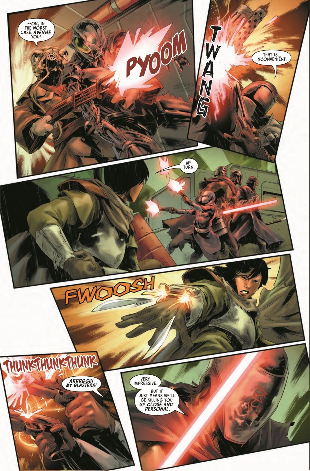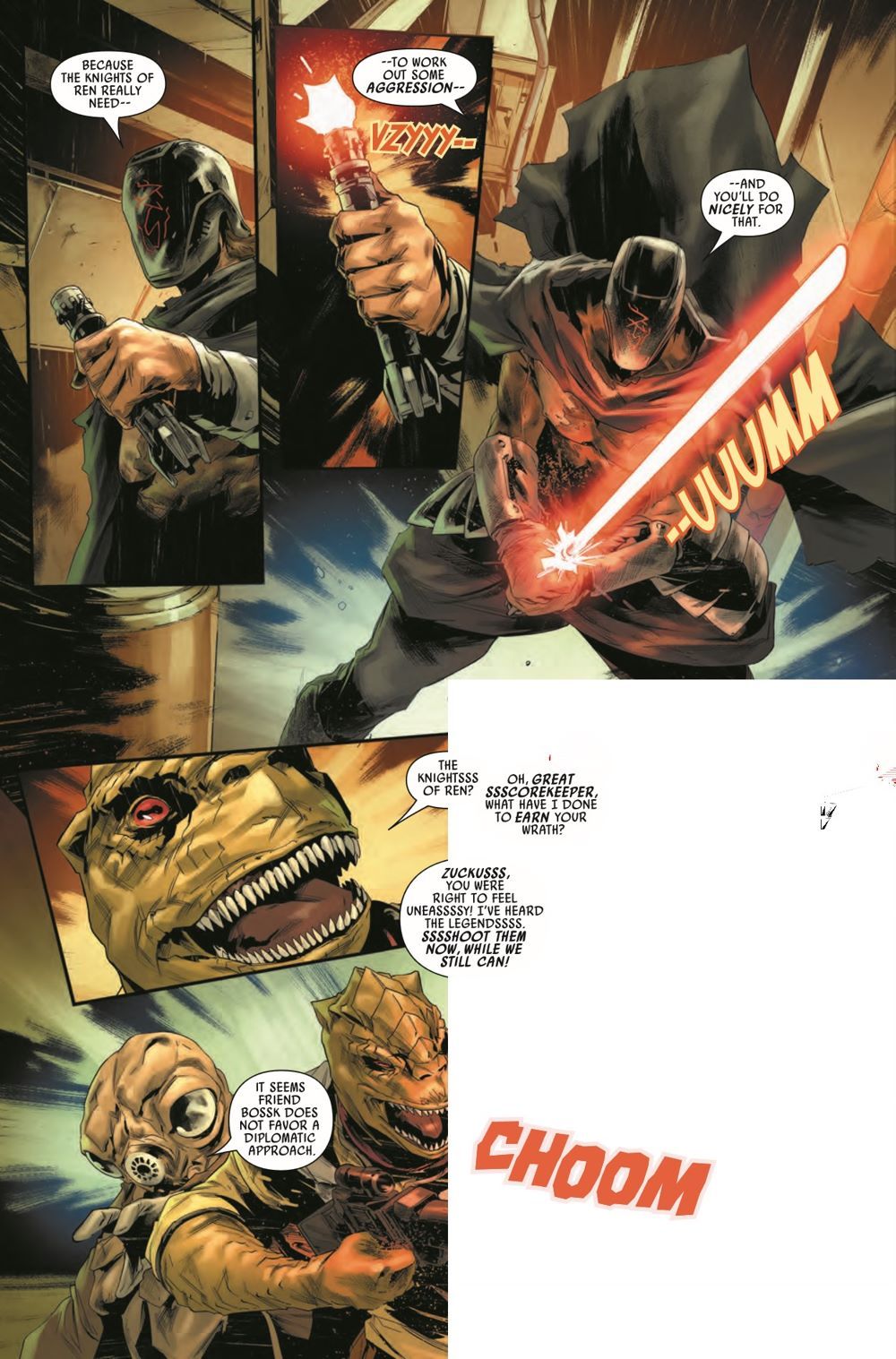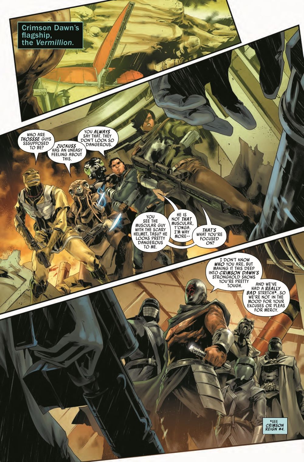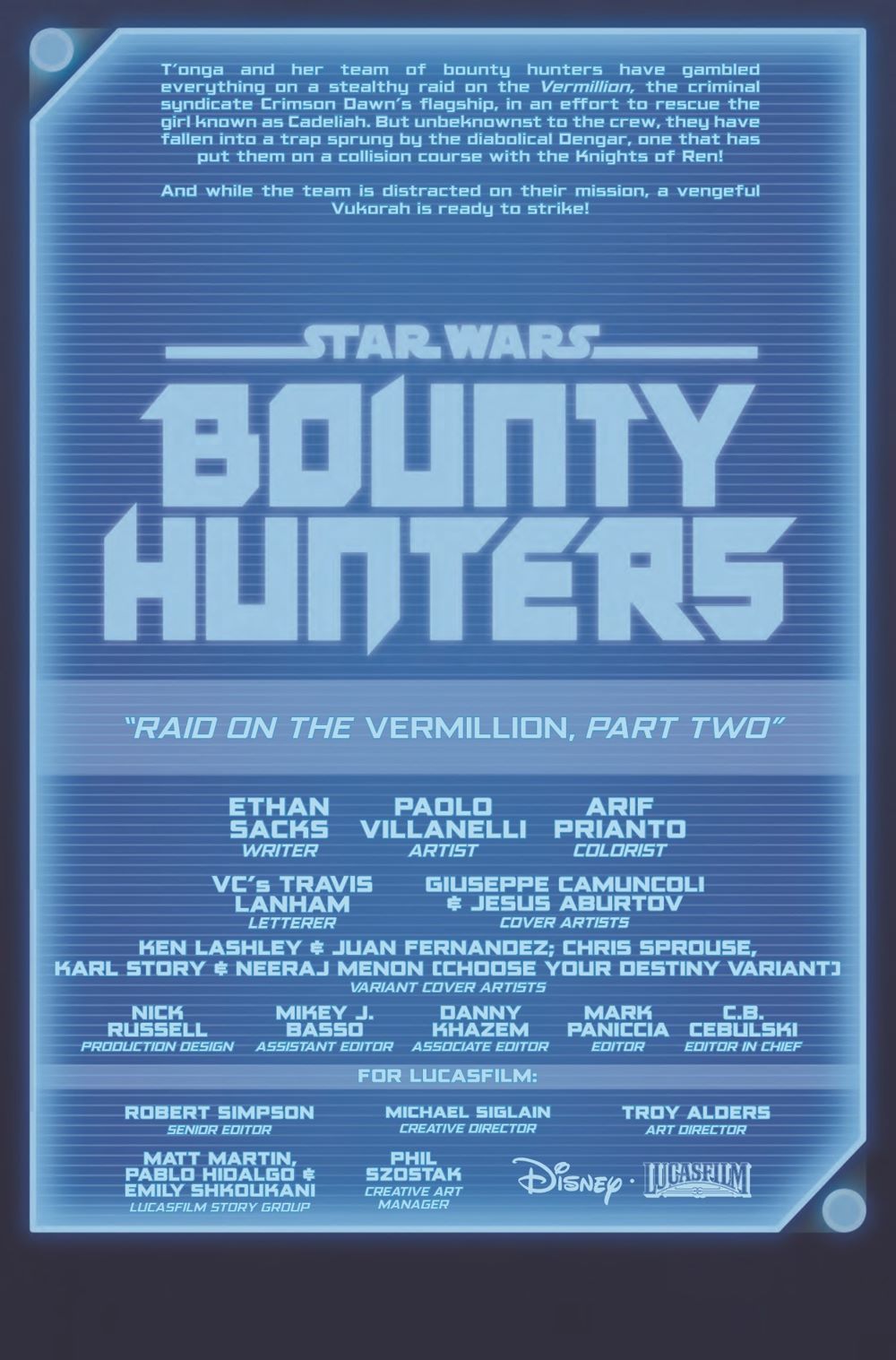 BOUNTY HUNTERS VS. THE KNIGHTS OF REN! Dengar is leading T'onga's bounty hunter crew on a desperate attempt to break into the Crimson Dawn's stronghold - and he's also leading them into a trap! Meanwhile, Valance has found new purpose as Darth Vader's secret weapon. But how far will he be willing to go to protect an Imperial officer from assassins?
