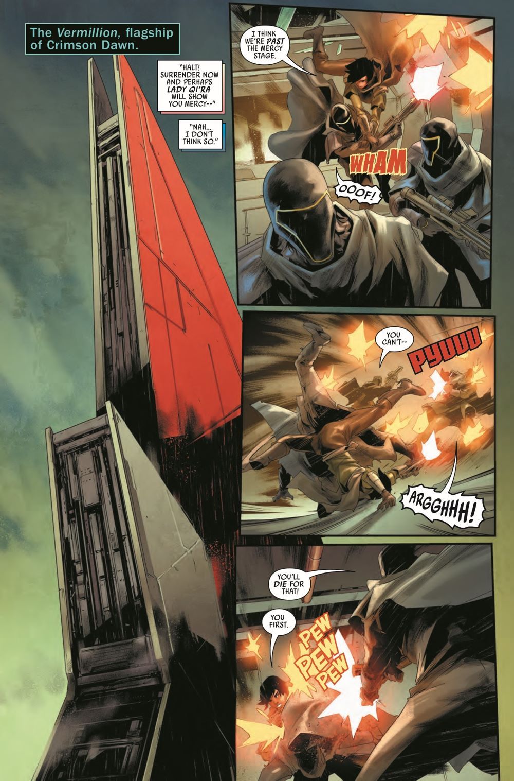 THE SHOCKING ENDING TO THE BOUNTY HUNTERS' RAID ON THE VERMILLION! T'onga must face Crimson Dawn on her own to save the girl she seeks. Meanwhile, one of her crew may not survive Vukorah's deadly revenge. And Dengar may finally be getting exactly what he deserves.
