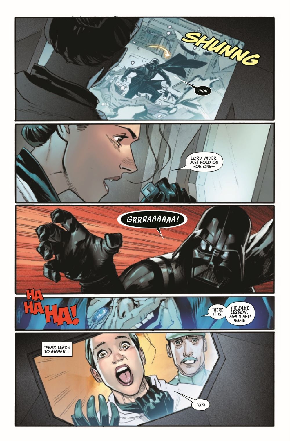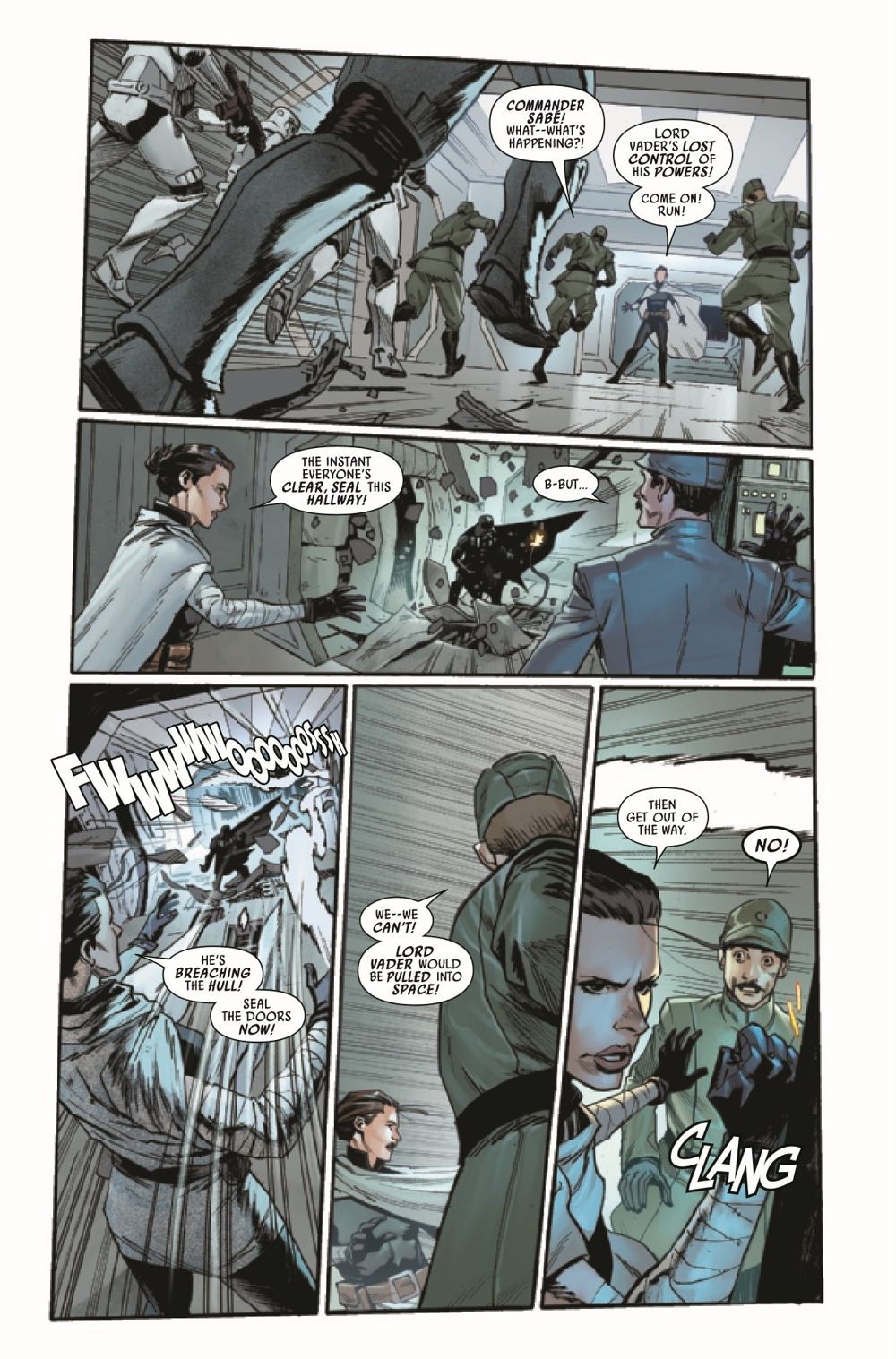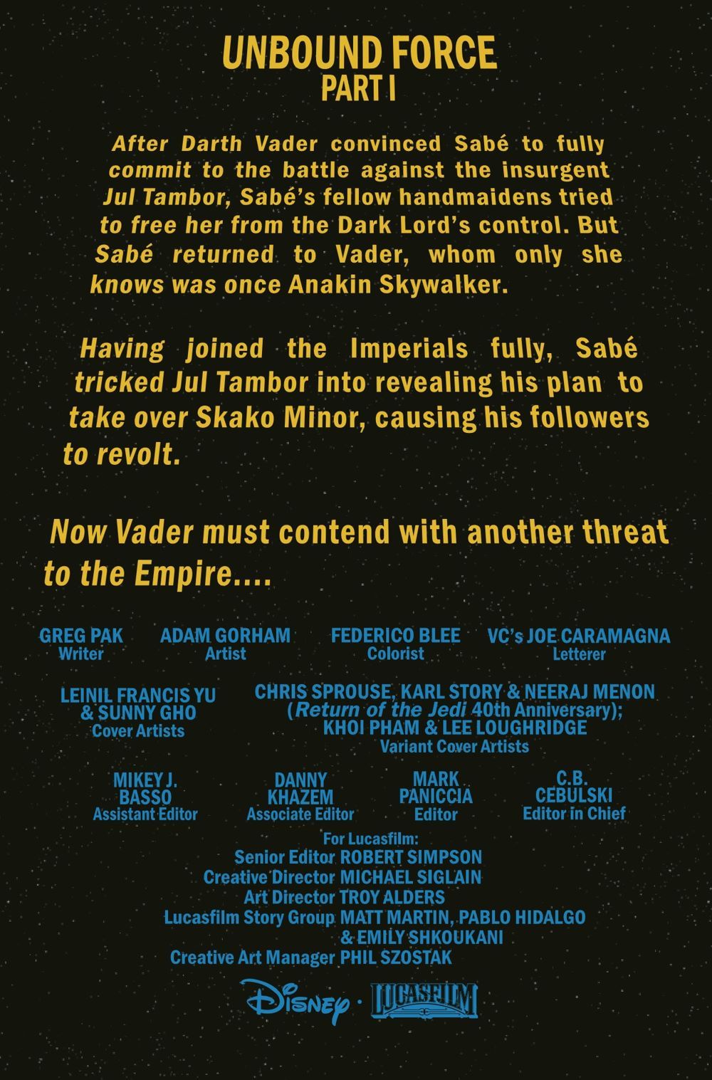 UNBOUND FORCE – Part One! When the Dark Lord of the Sith loses control of the Force, nothing is safe — not even his own Executor-class Star Dreadnought. But in the face of total destruction, Commander Sabé finds an opportunity. Does Vader's untrammeled onslaught expose a vulnerability? Or is it just another doorway to the terrifying tyranny of the Sith?