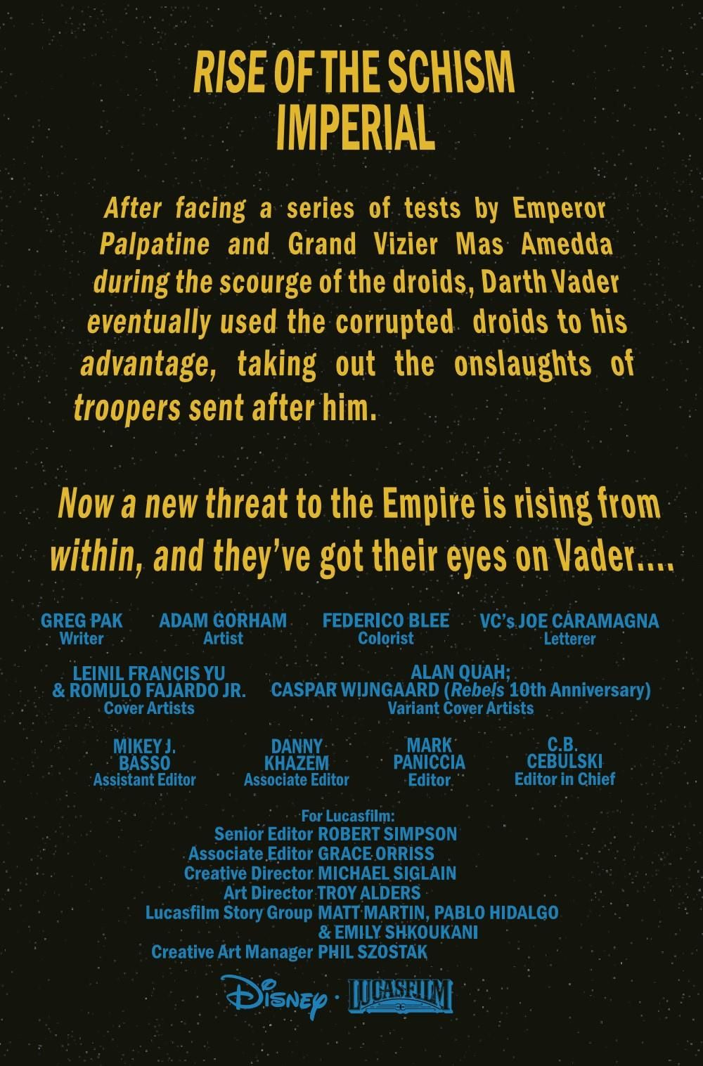 THE RISE OF THE SCHISM IMPERIAL! In the wake of DARK DROIDS, DARTH VADER explores his powers and takes on the most dangerous team of rebel heroes he's ever faced! Meanwhile, the greatest threat to the EMPEROR'S rule is rising - from within THE EMPIRE itself! Will the DARK LORD OF THE SITH destroy it - or join it? Featuring the comic-book debut of ENRIC PRYDE from Star Wars: The Rise of Skywalker!