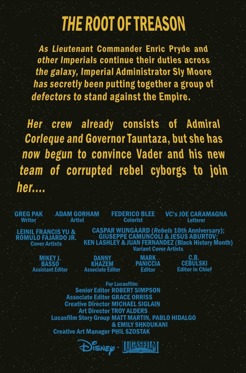 WHO DARES COMMIT TREASON AGAINST THE EMPIRE?! Seemingly disparate threads from years of storytelling come together as DARTH VADER uncovers the master plan of the SCHISM IMPERIAL! The UMBARAN nurtures her conspirators! KITSTER and WALD return - along with the death machinery of GOVERNOR TAUNTAZA! But when a group of betrayers come together, how long will it be until they betray each other?
