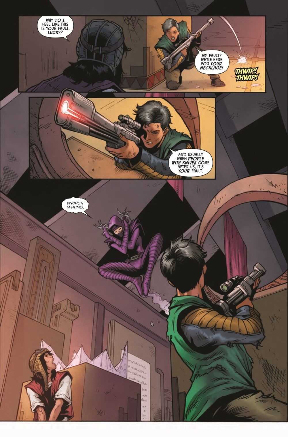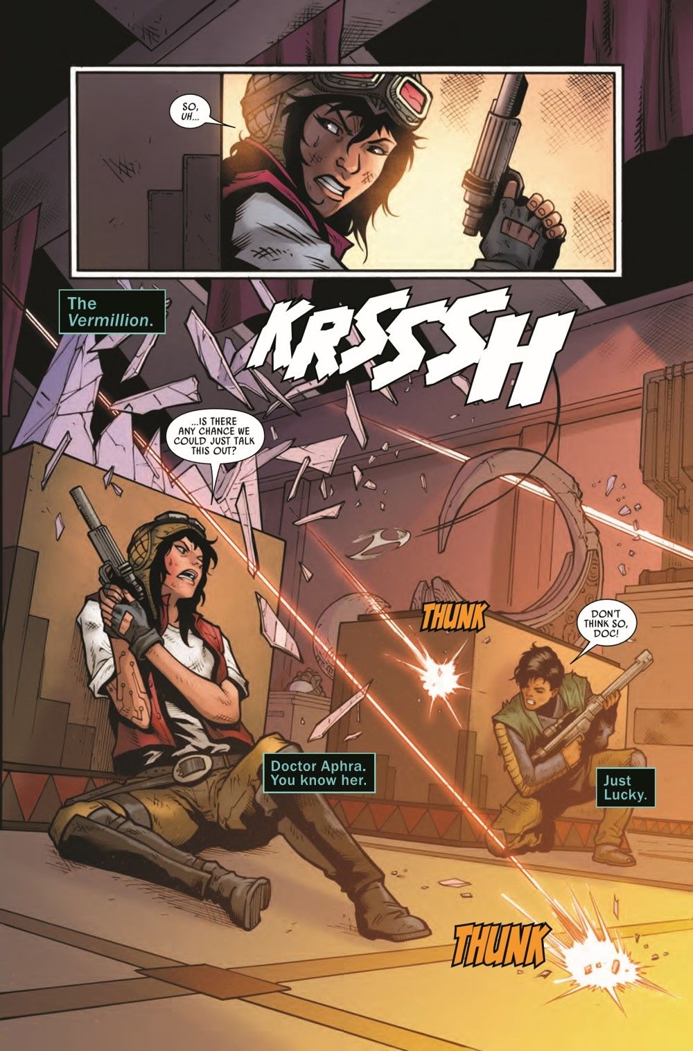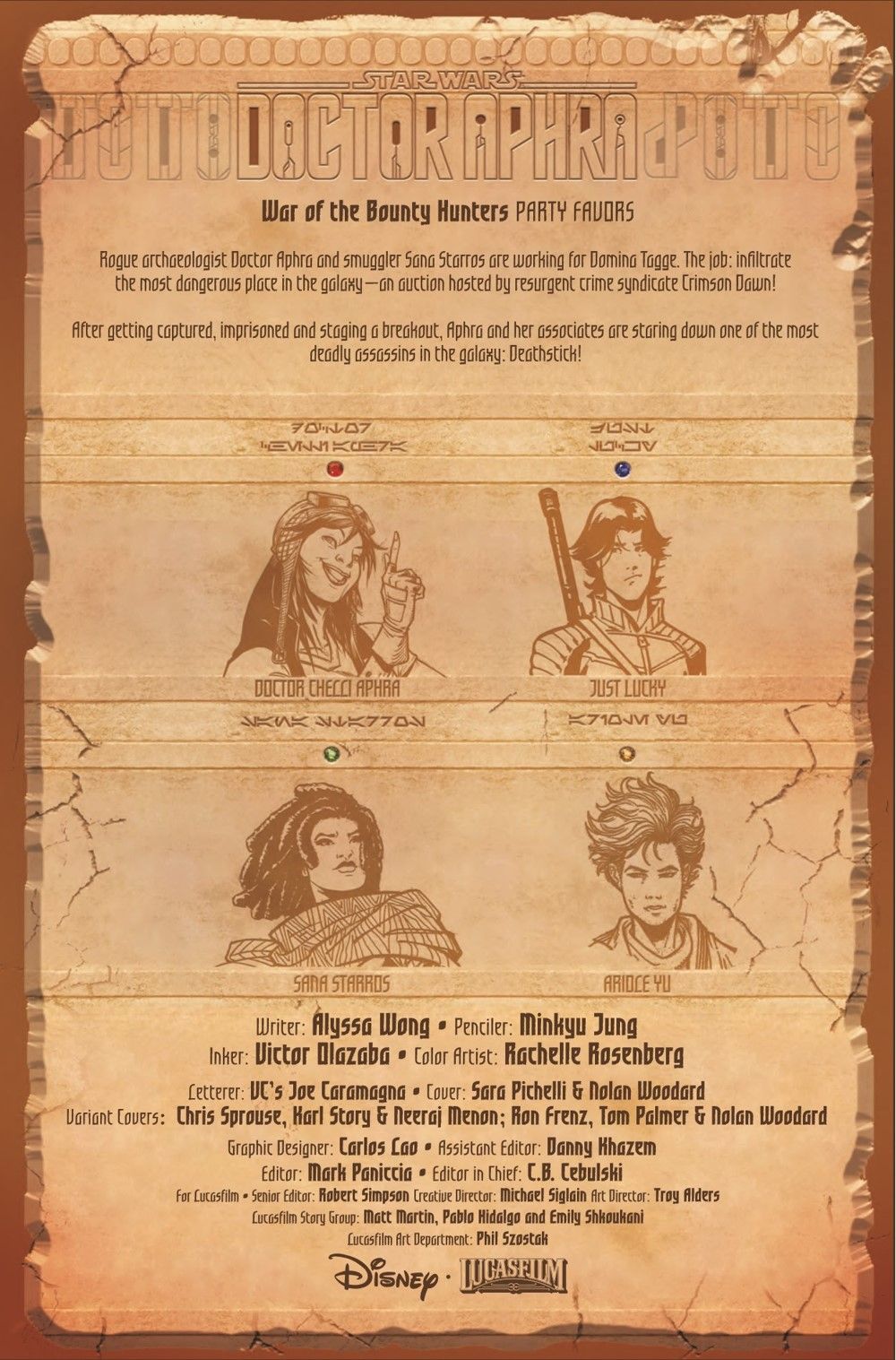 "PARTY FAVORS" CRIMSON DAWN is back, and DOCTOR APHRA is trapped aboard their ship! What treasures lie aboard the VERMILLION? And what price will Aphra have to pay to obtain them?